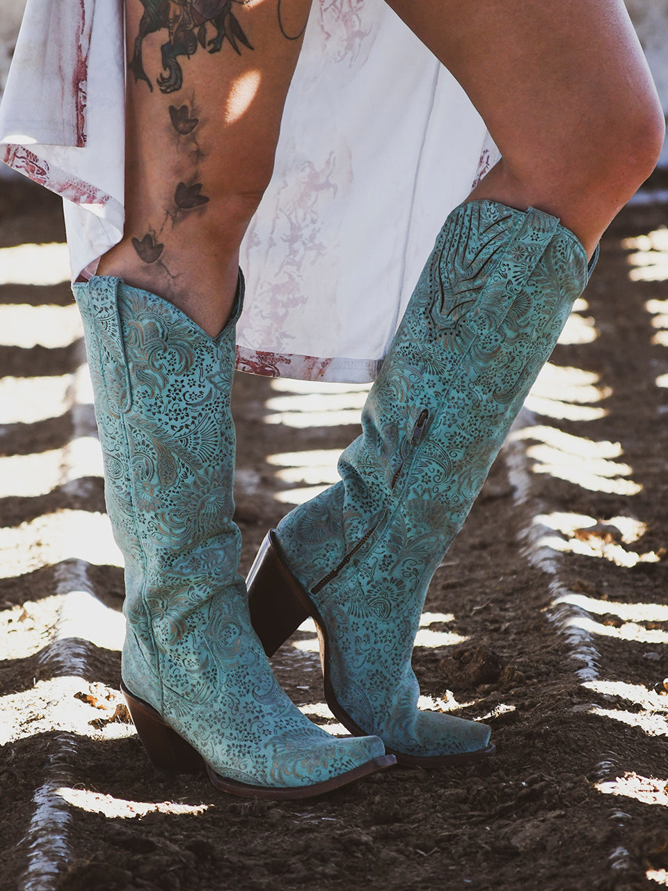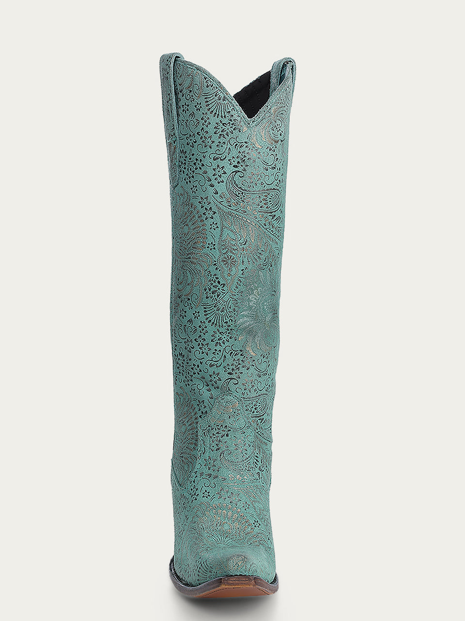 A4587 - WOMEN'S GOLD STAMPED FLORAL TURQOUISE SNIP TOE COWBOY BOOT