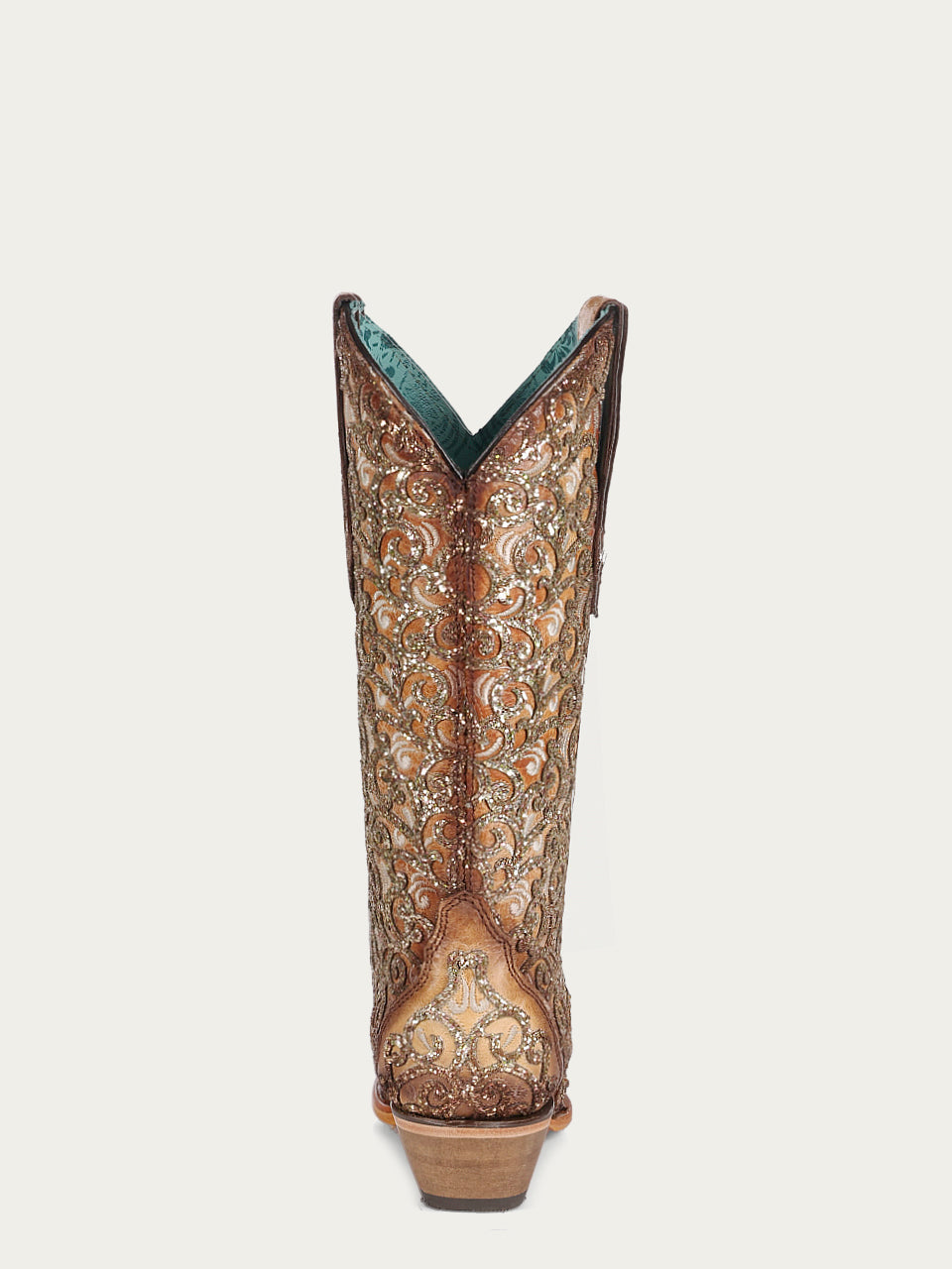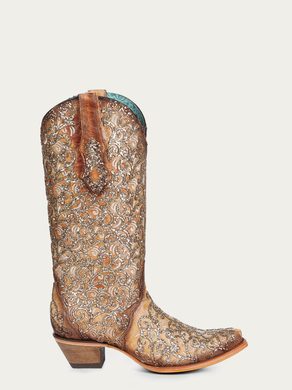 C4051 - WOMEN'S SAND GLITTER OVERLAY AND EMBROIDERY TRIAD SNIP TOE COWBOY BOOT