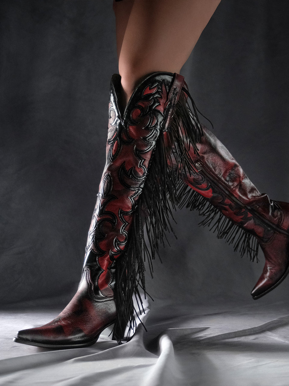 Z5453 - WOMEN'S RED EMBROIDERY AND OVERLAY WITH FRINGE TALL TOP POINTED LAMB COWBOY BOOT