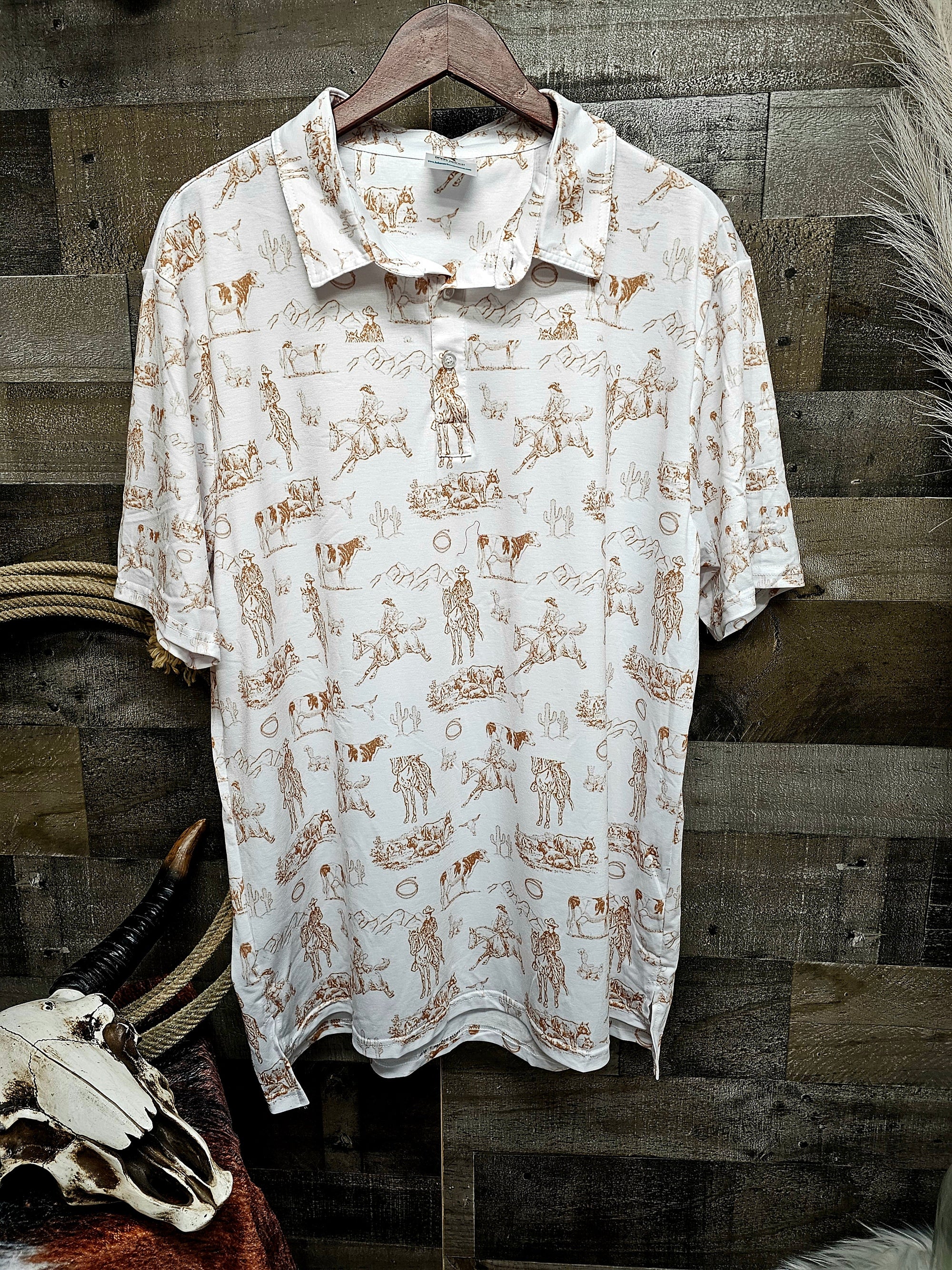 Ranch Life Men's Western Polo Shirt with tan print