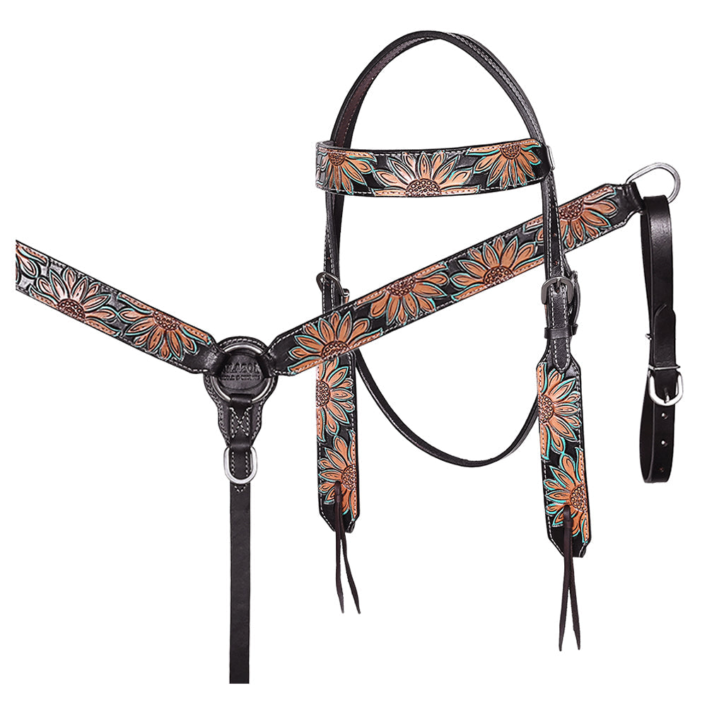 BAR H EQUINE Genuine Horse Hand Tooled Painted Sunflower Leather Breast Collar Brown