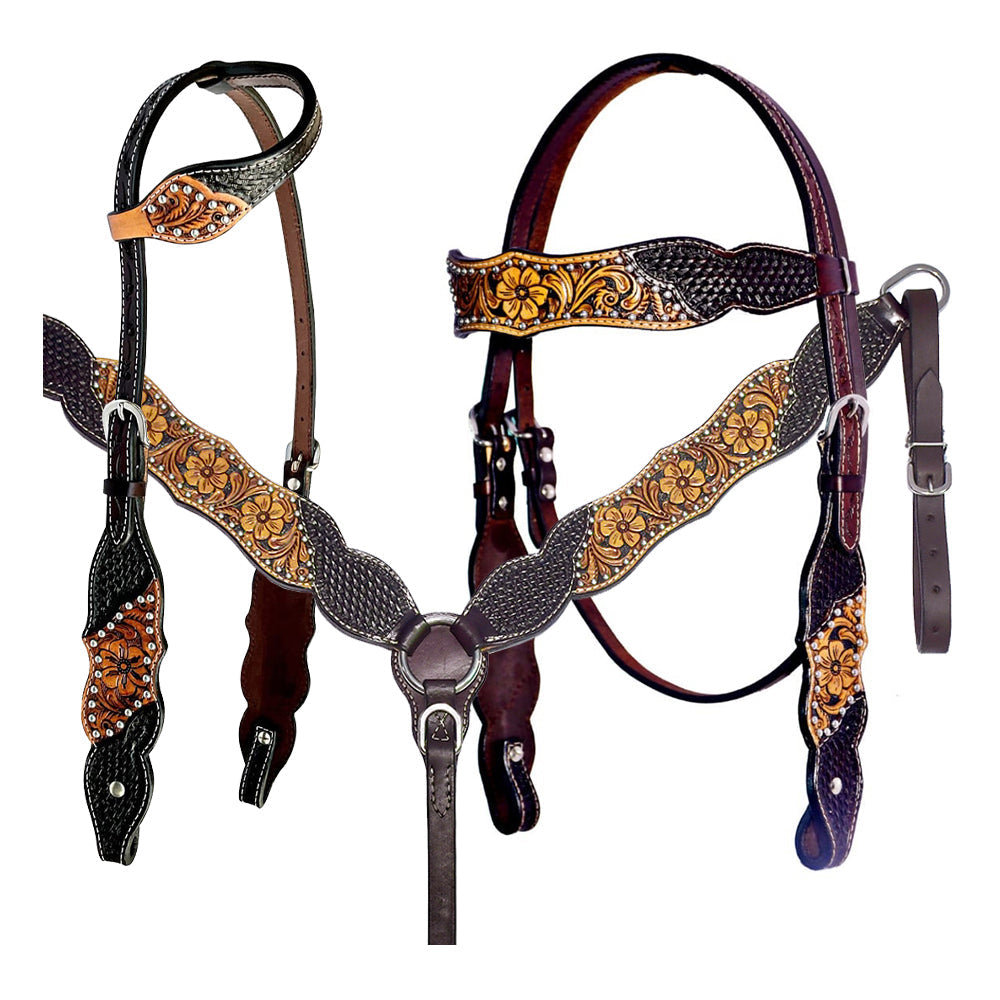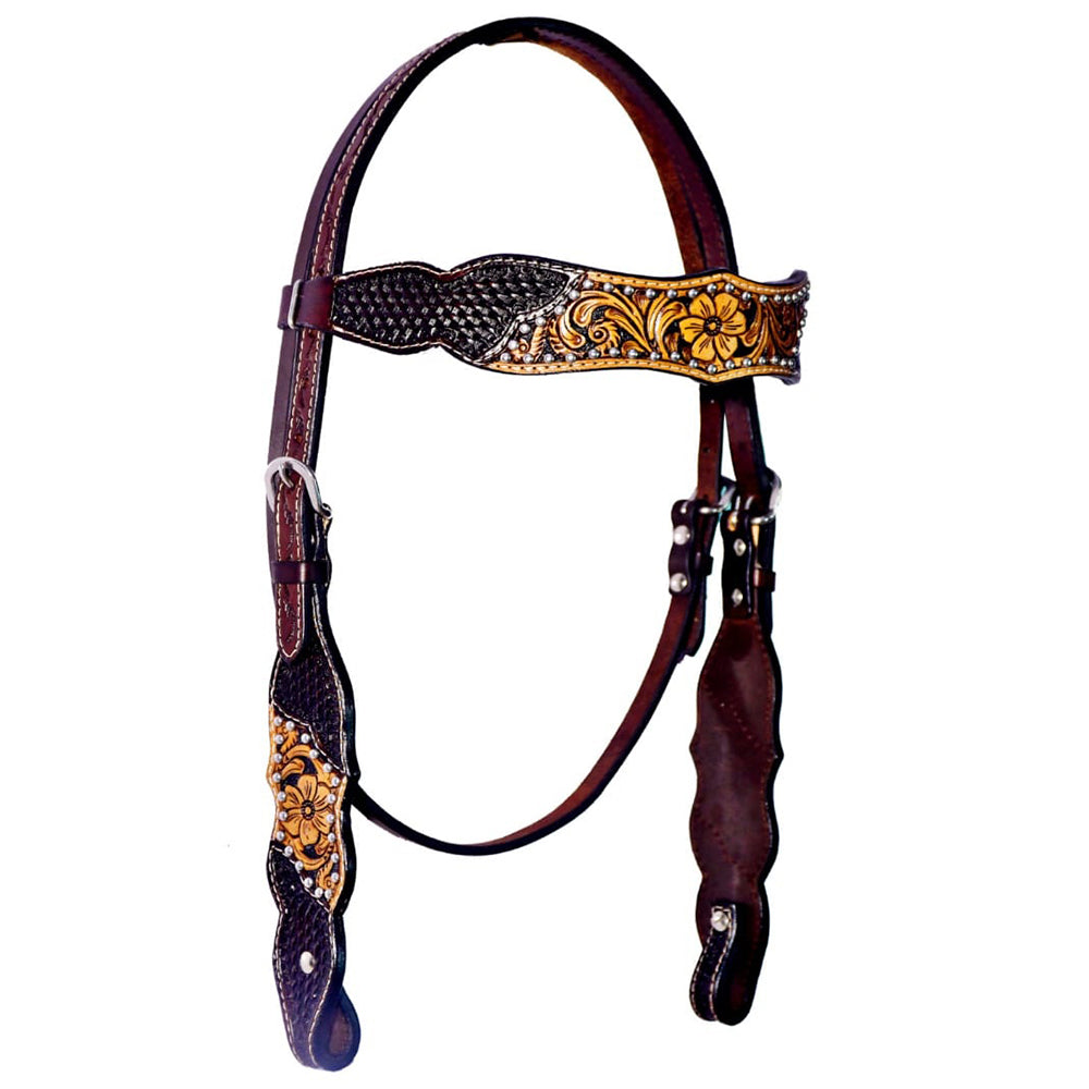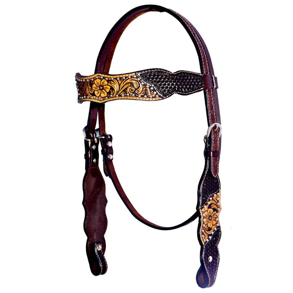 Bar H EquineWestern Horse Genuine Leather Floral Design Headstall Dark Brown