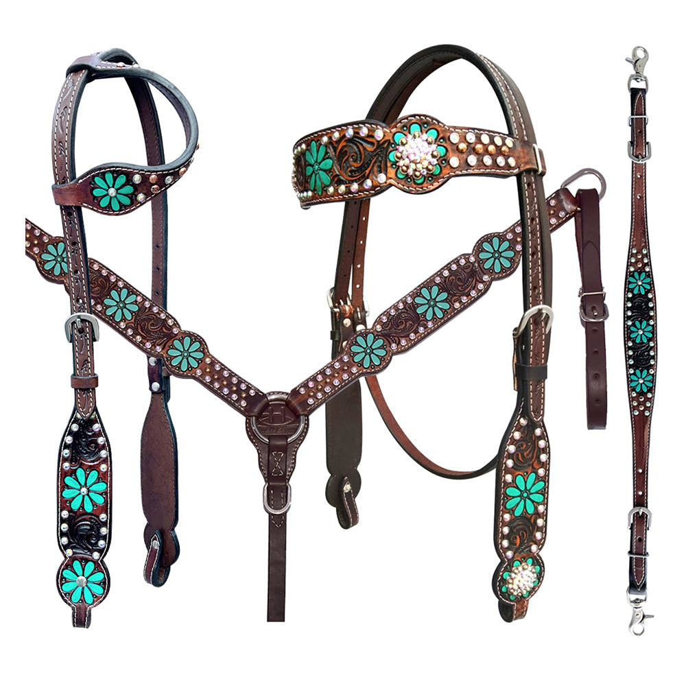 BAR H EQUINE Western Leather Horse Headstall & Breast Collar & Wither Strap