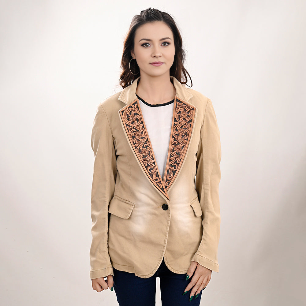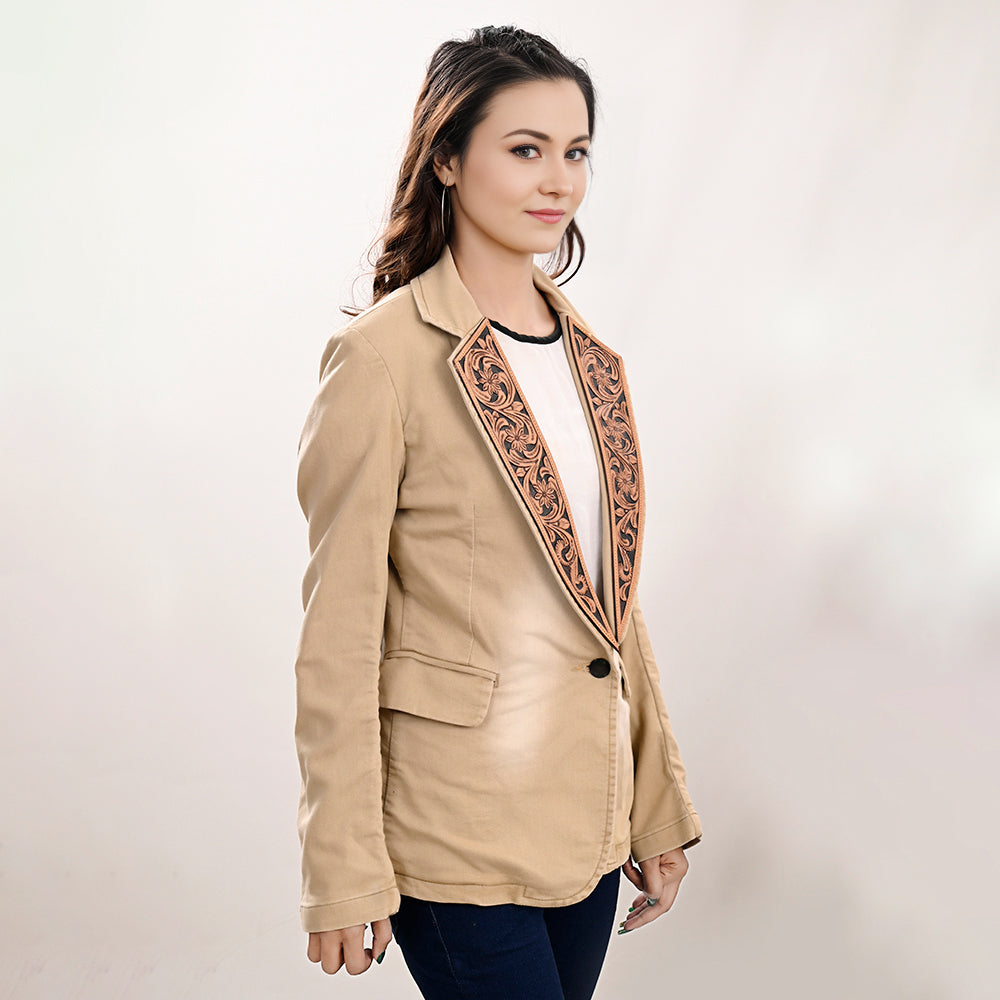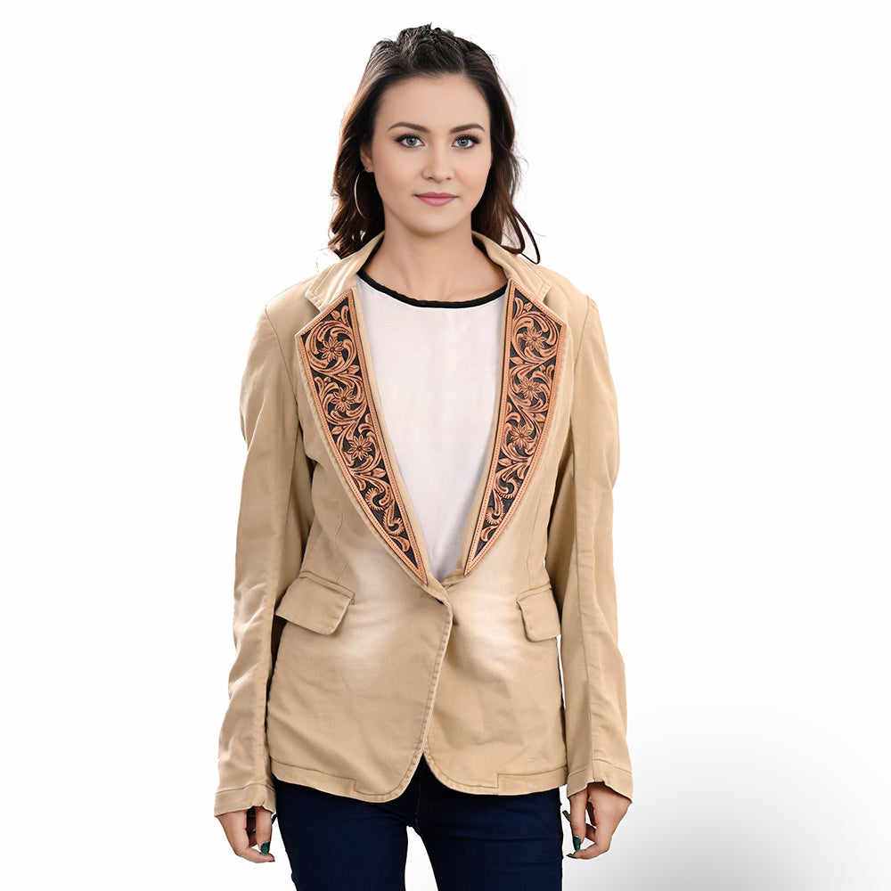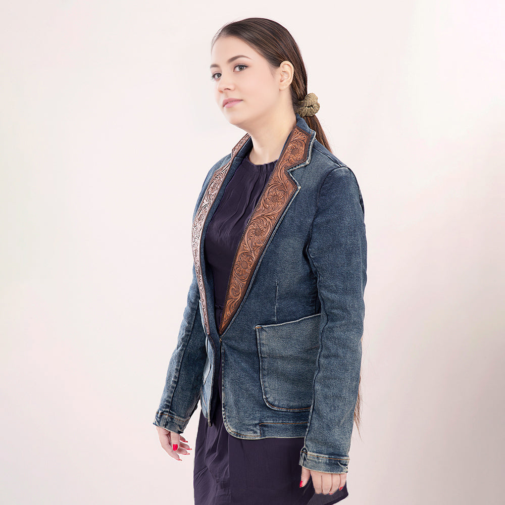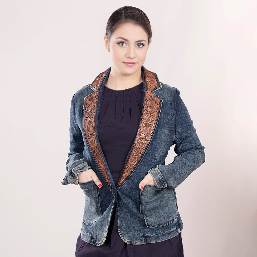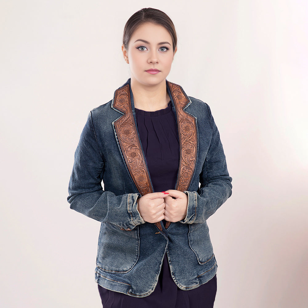 ADBZ020 Genuine leather Hand tooled hand carved Women 100% cotton Denim Blazer dress jacket ladies Girl