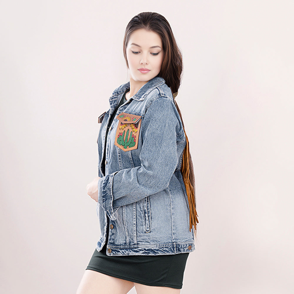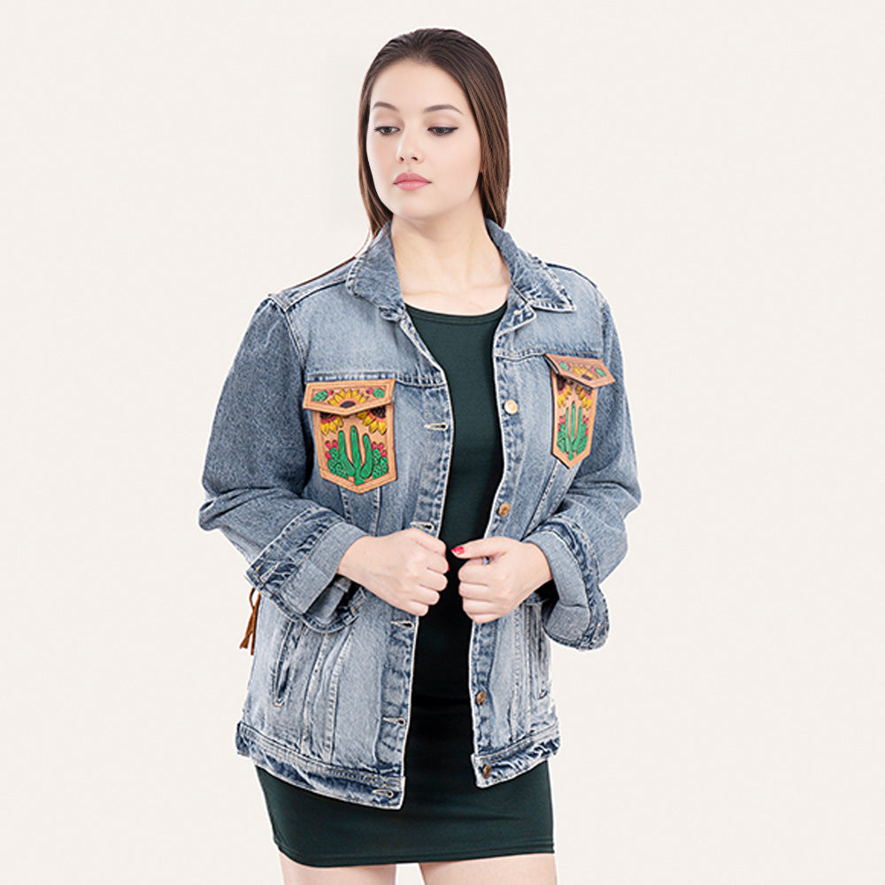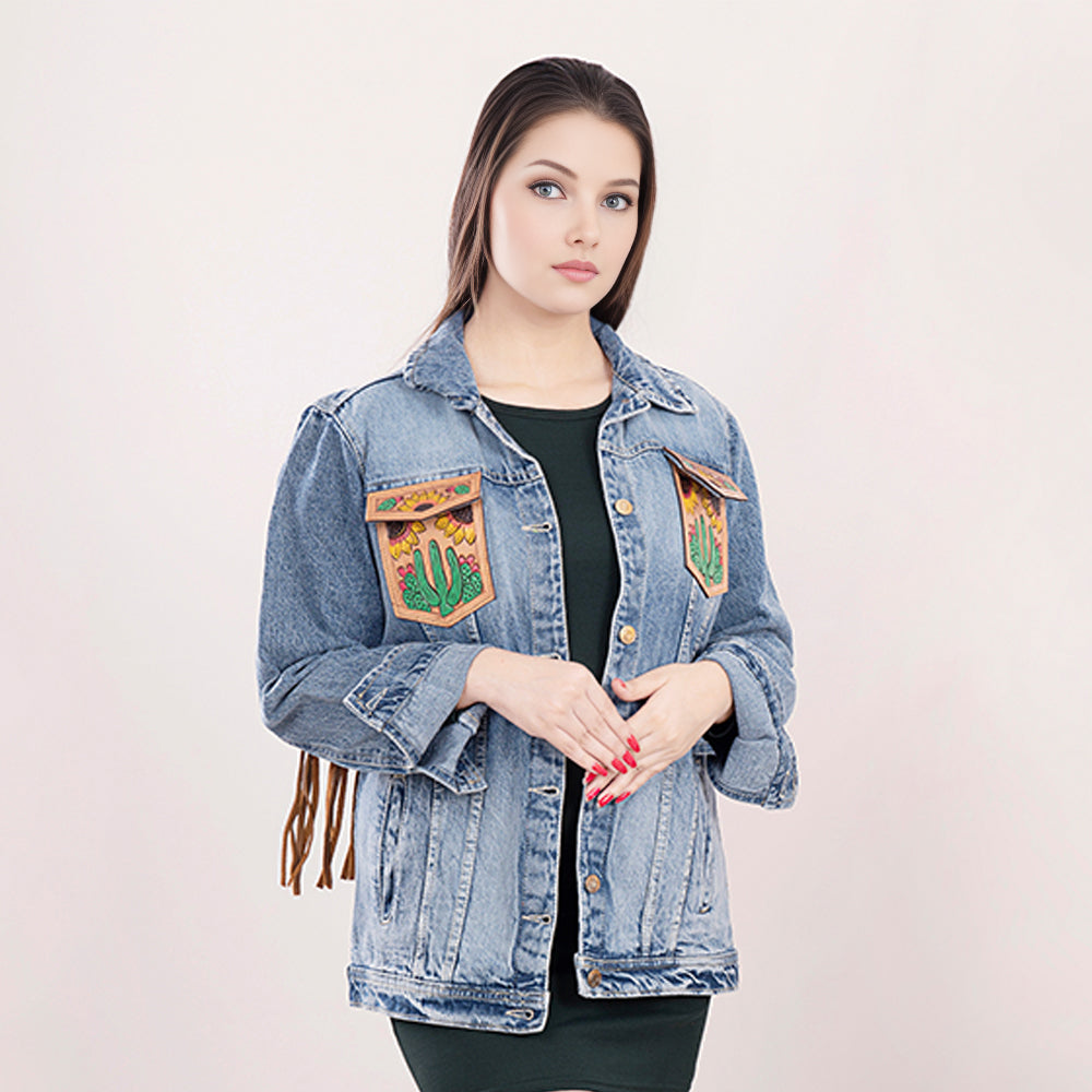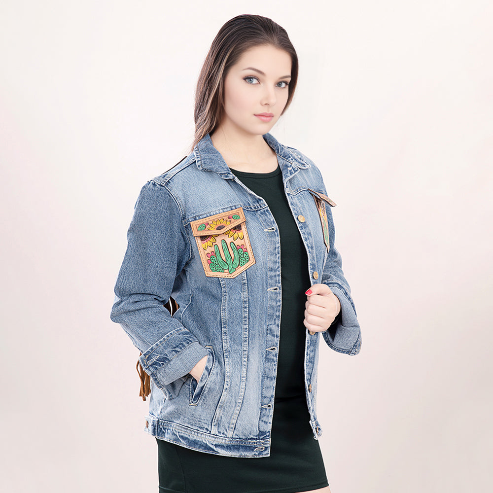 ADBZ702 Genuine leather Hand tooled hand carved Women 100% cotton Denim Blazer dress jacket ladies Girl