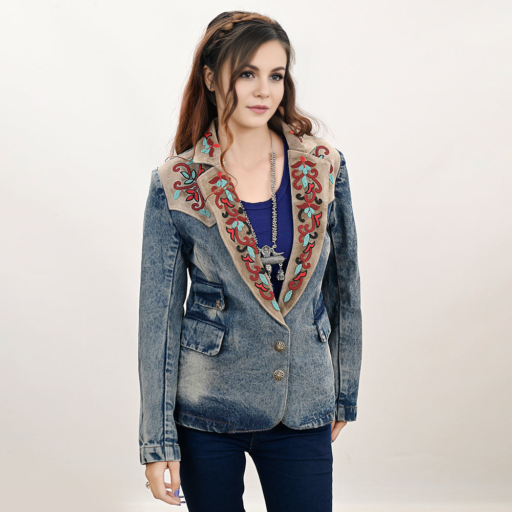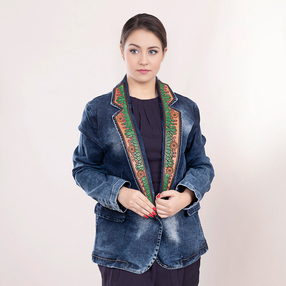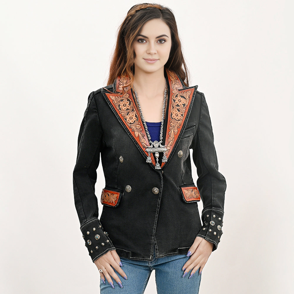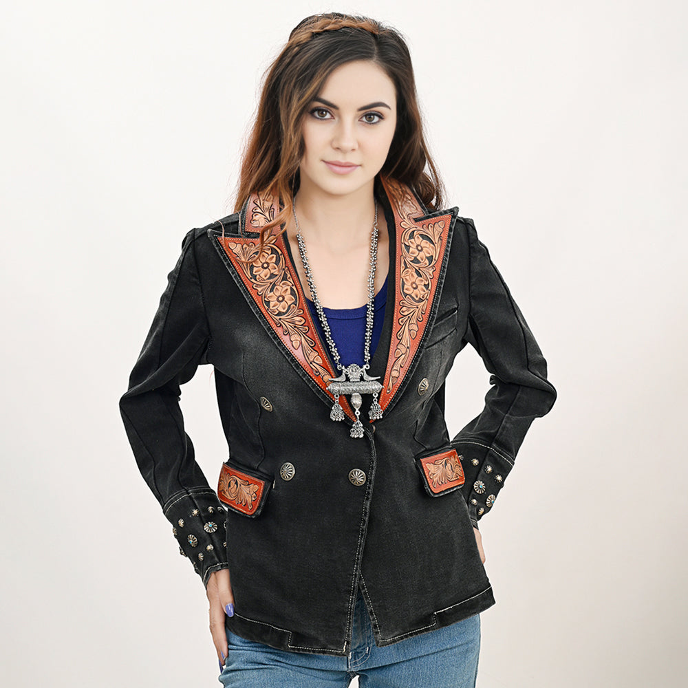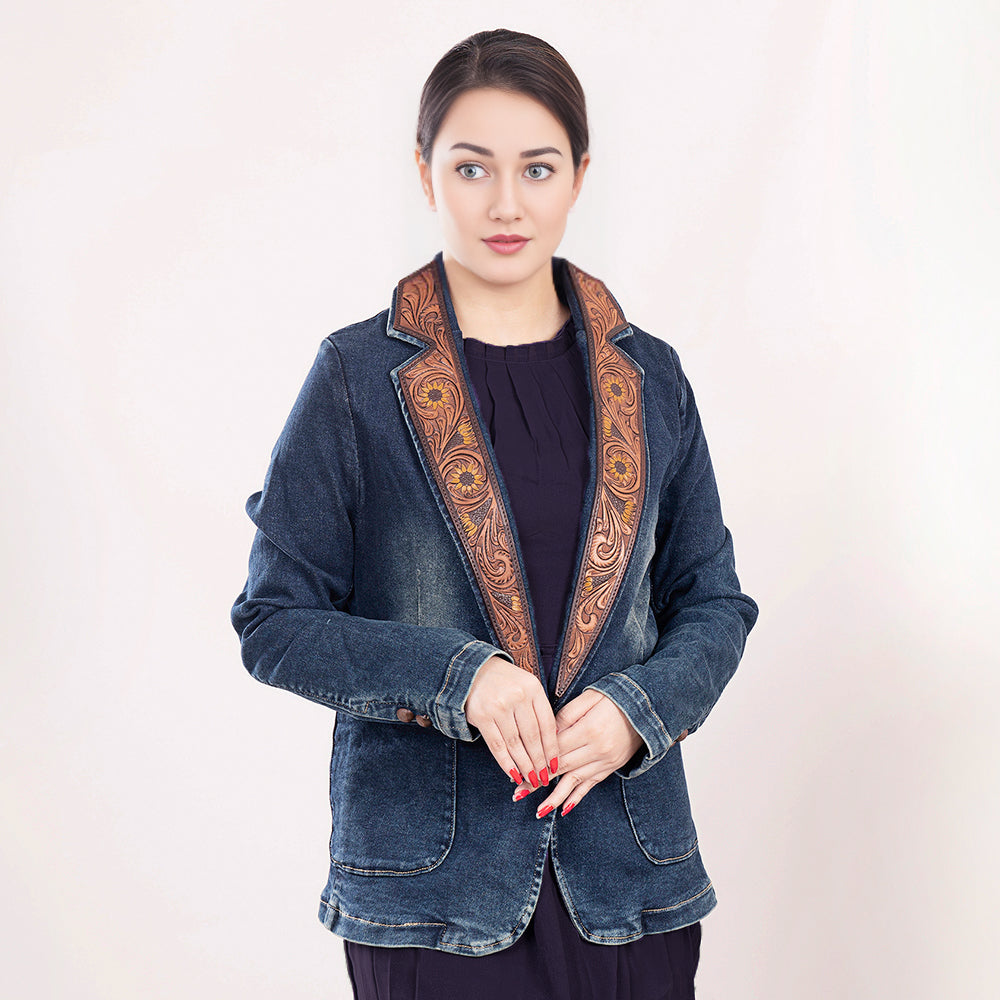 ADBZ017 Genuine leather Hand tooled hand carved Women 100% cotton Denim Blazer dress jacket ladies Girl