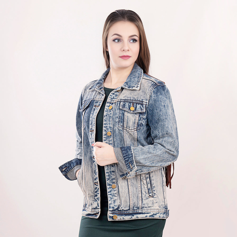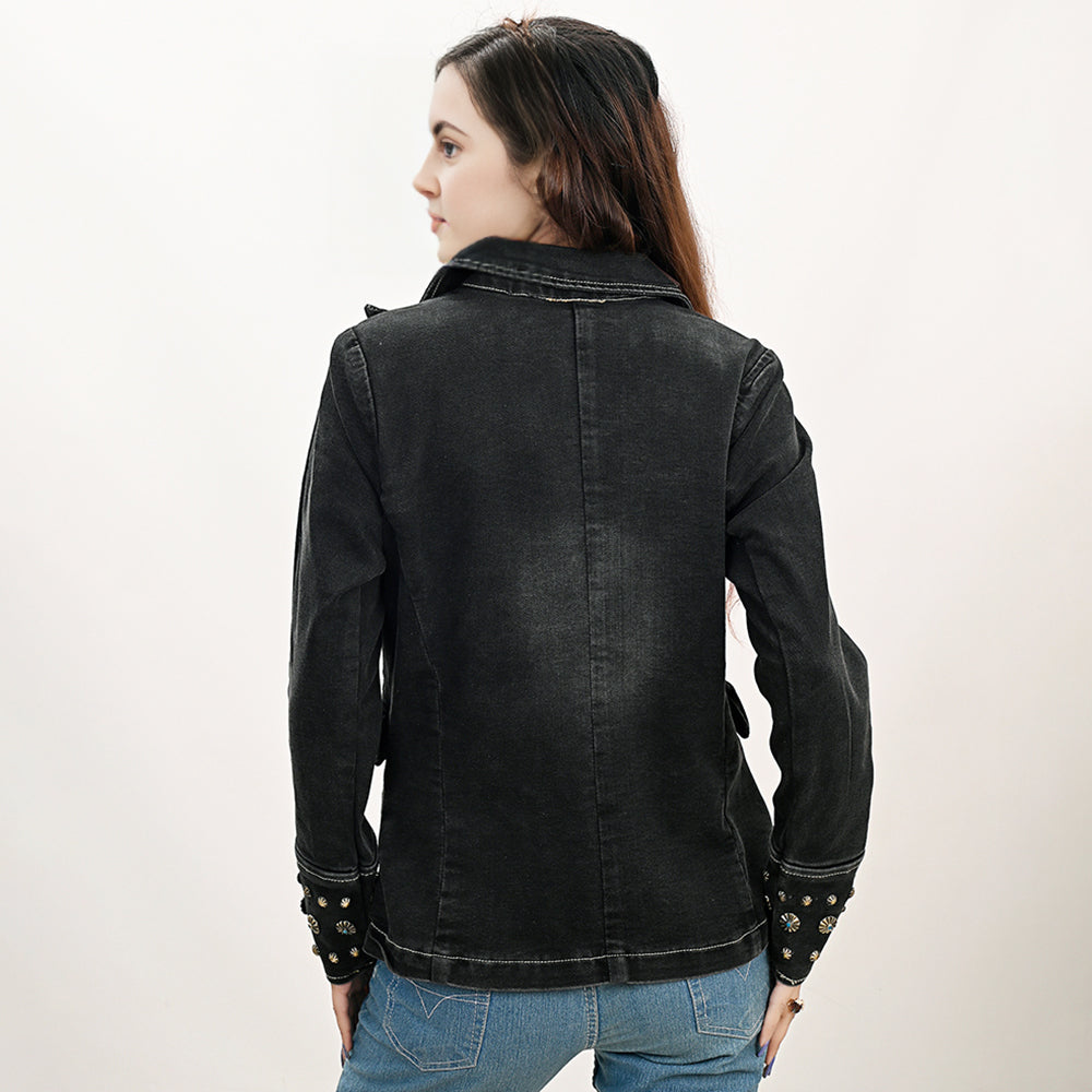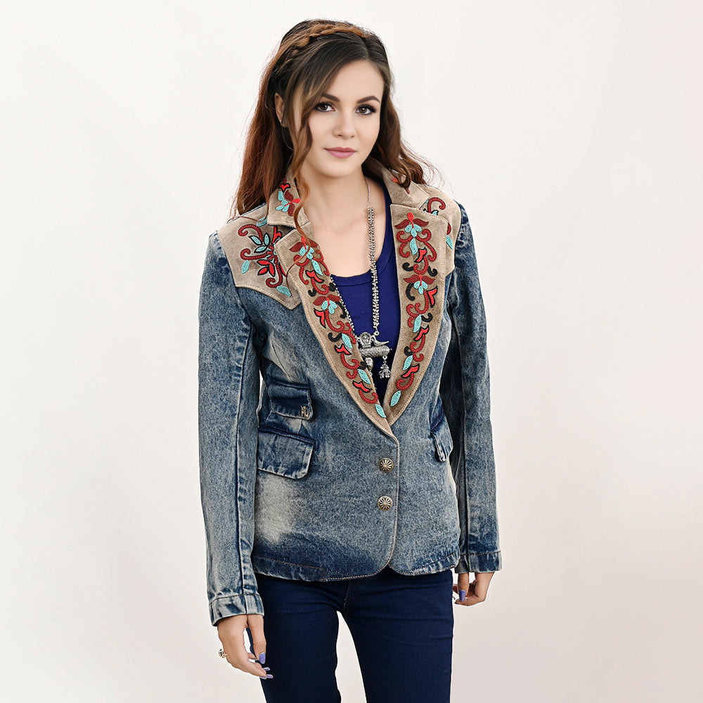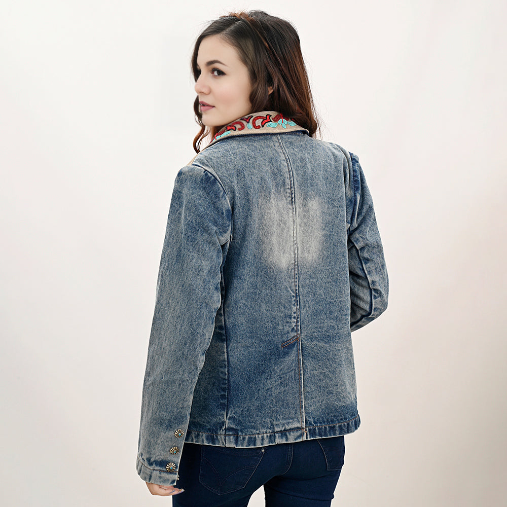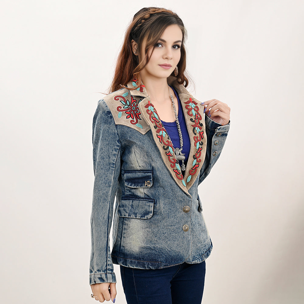 ADBZ017 Genuine leather Hand tooled hand carved Women 100% cotton Denim Blazer dress jacket ladies Girl