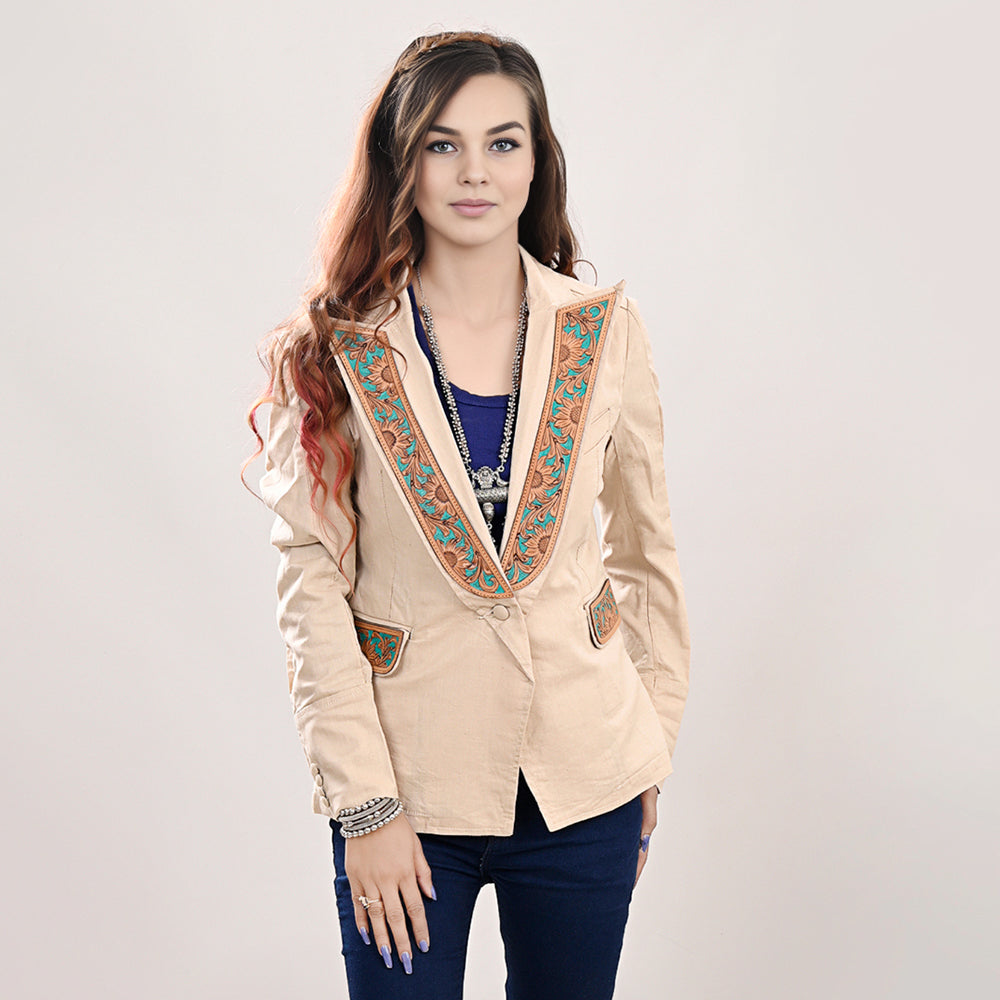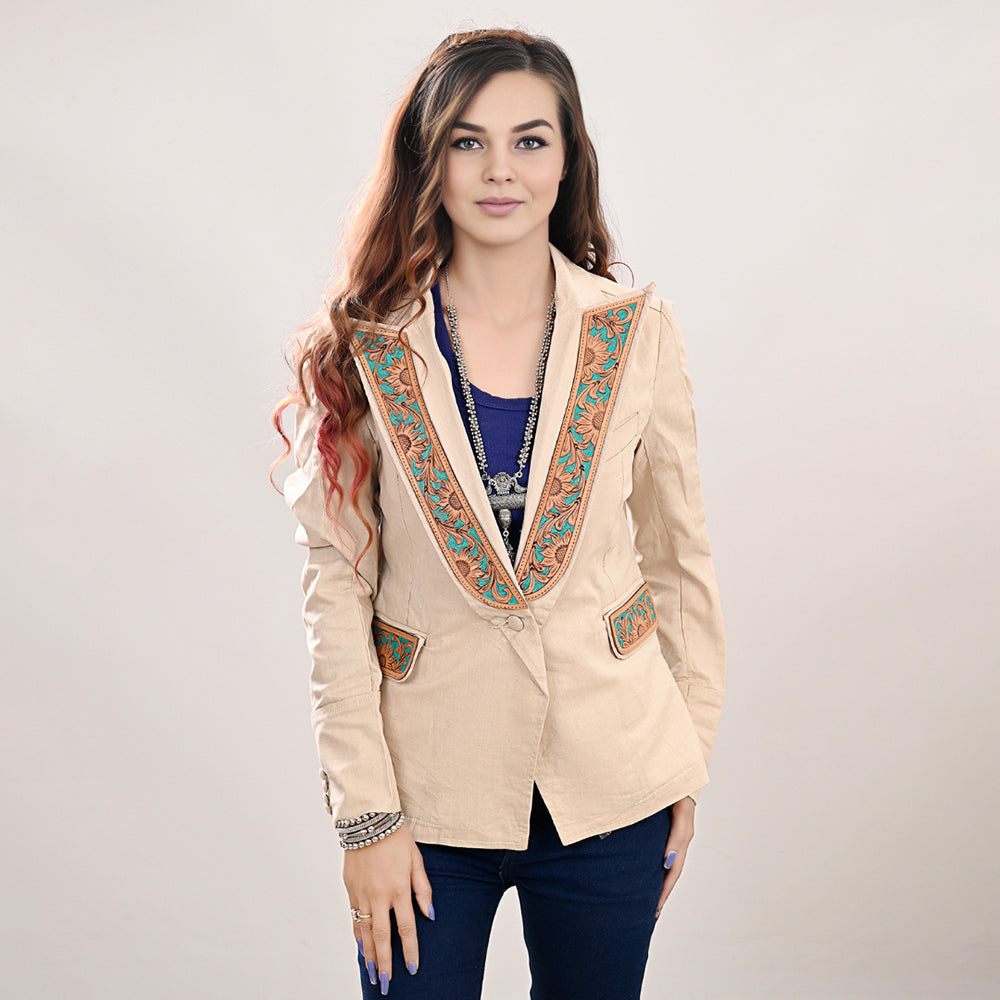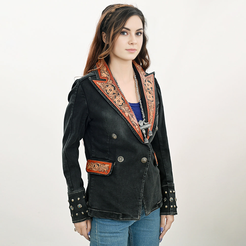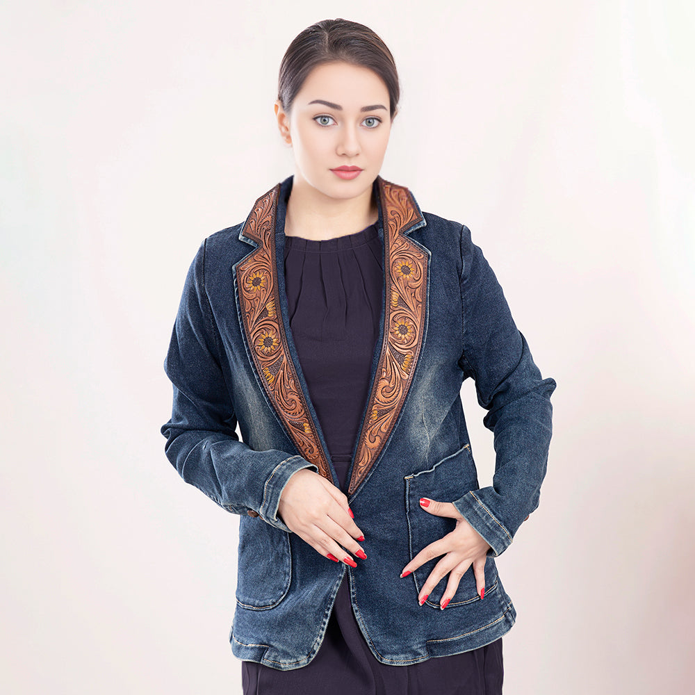 ADBZ031 Genuine leather Hand tooled hand carved Women 100% cotton Denim Blazer dress jacket ladies Girl
