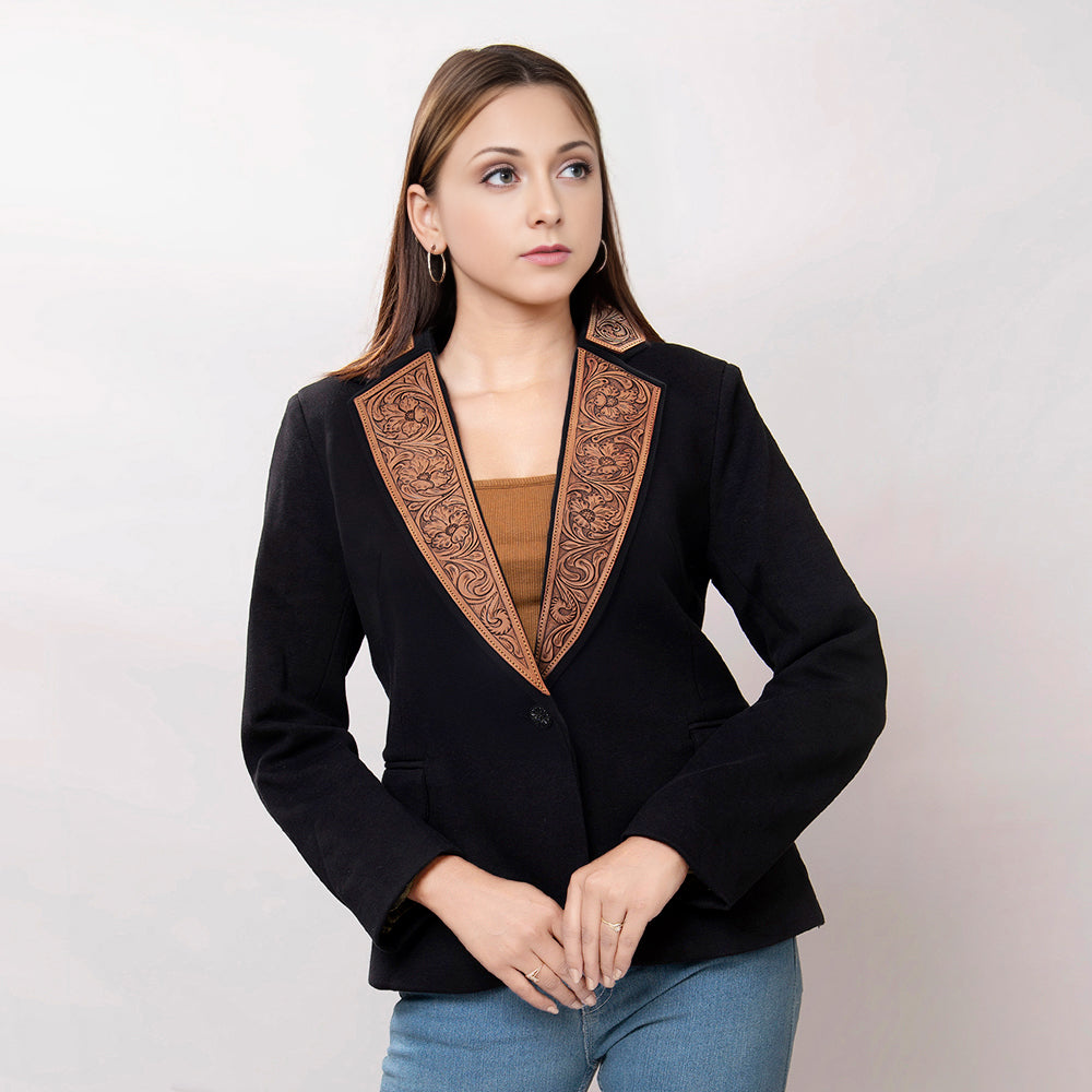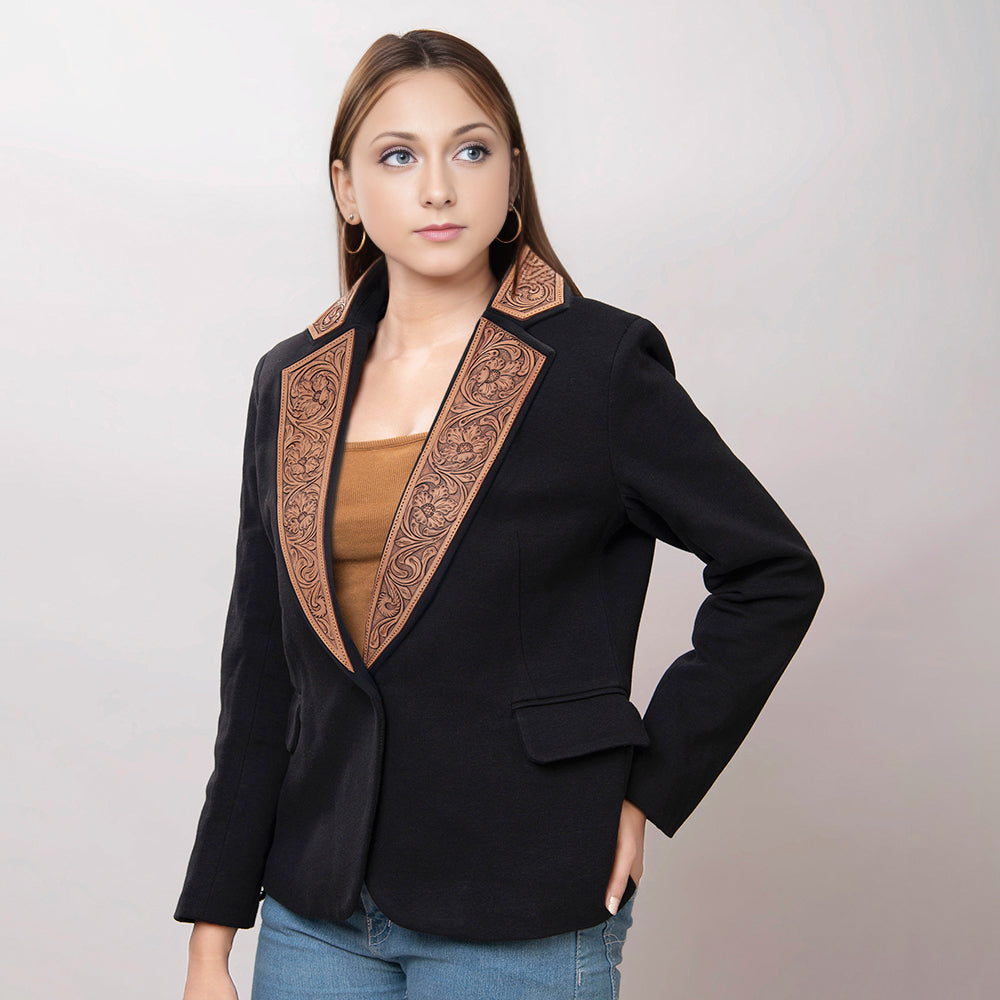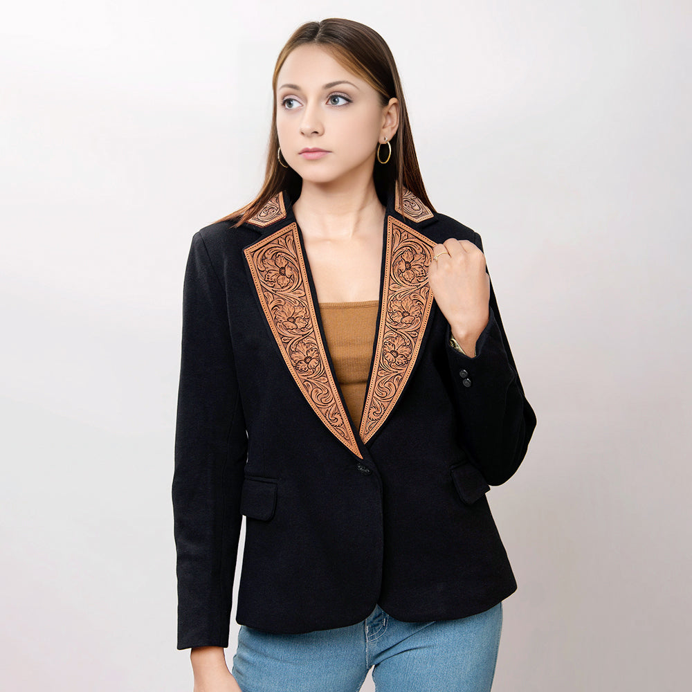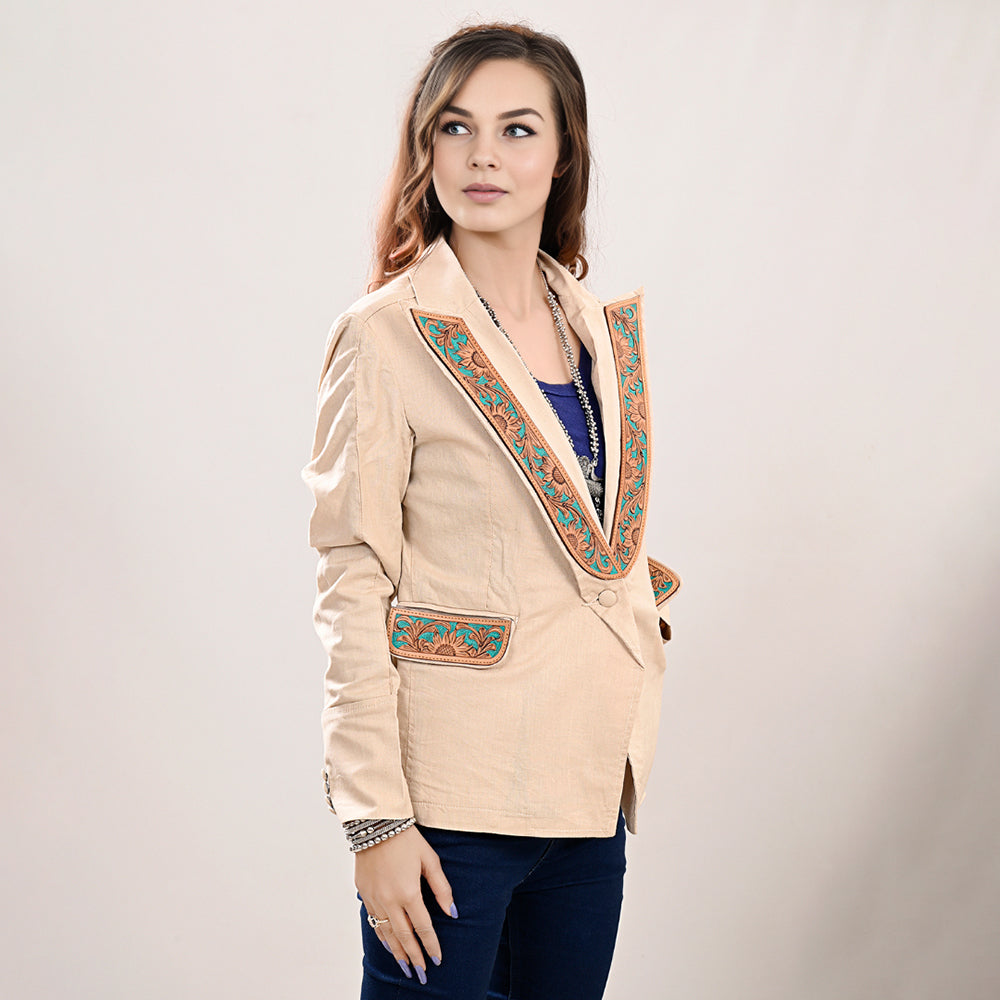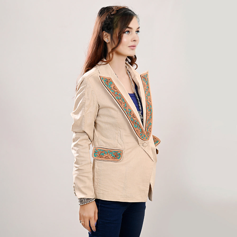 ADBZ031 Genuine leather Hand tooled hand carved Women 100% cotton Denim Blazer dress jacket ladies Girl