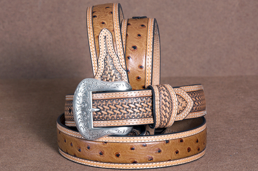 Nocona Leather Mens Belt Basketweave Tooled 1-1/2 In Wide Ostrich Brown