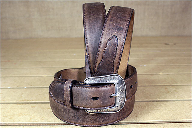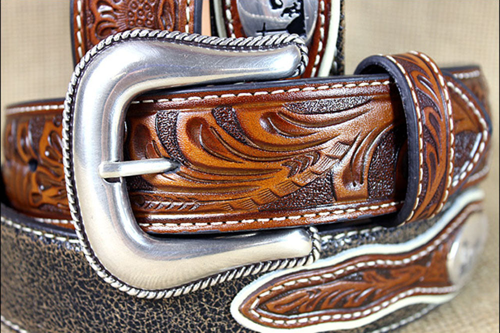 3D Western Mens Belt Leather Stitching Distressed Silver Buckle Brown