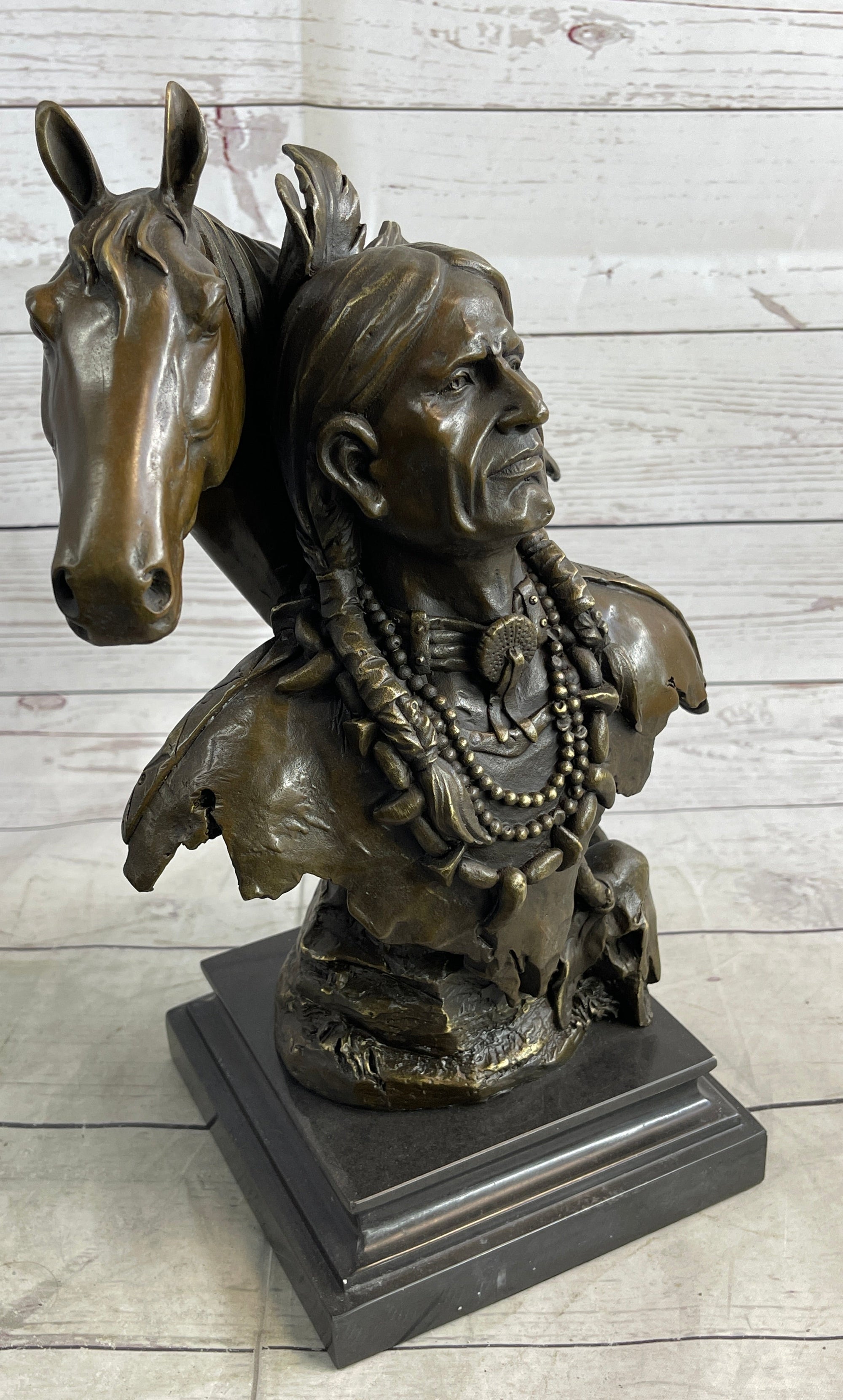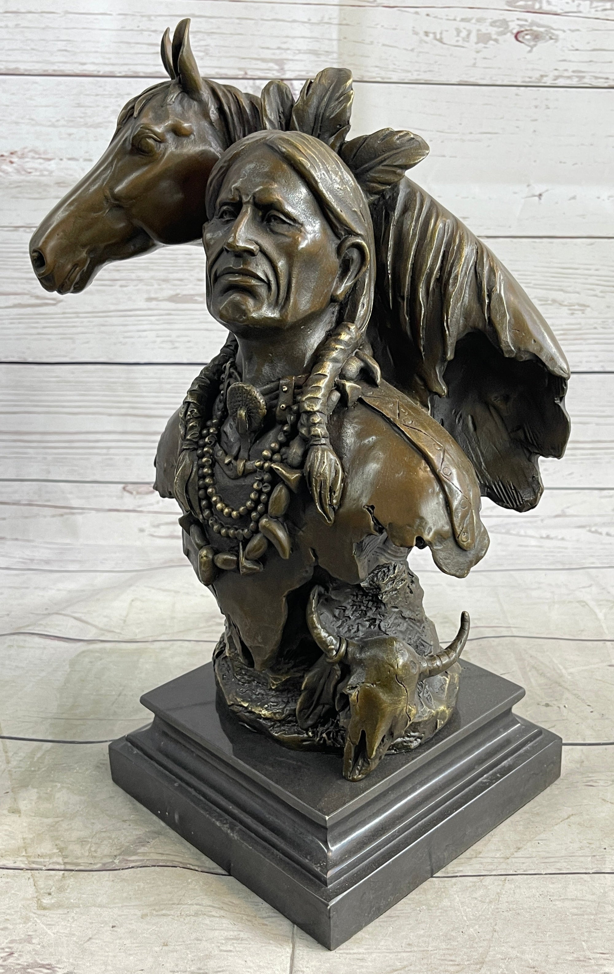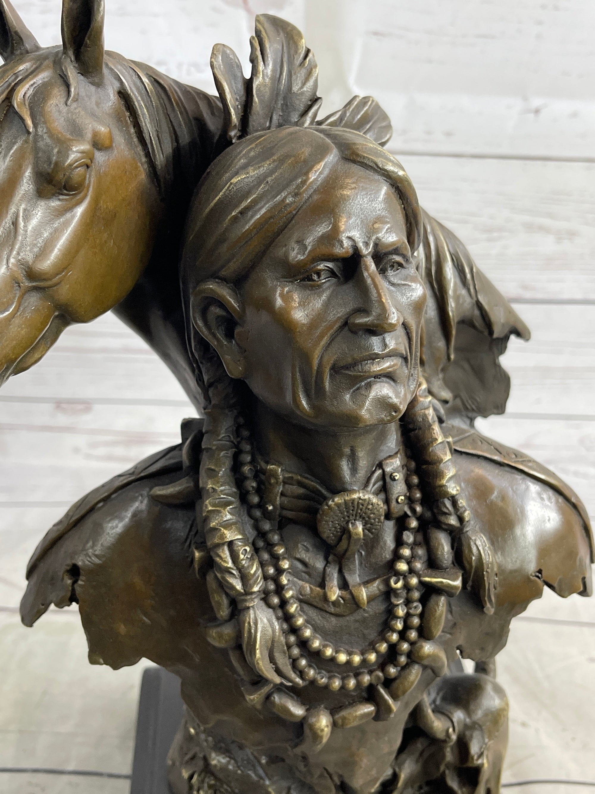 Native American Man & Horse Bronze Bust Statue Sculpture Western Art 14" x 10"