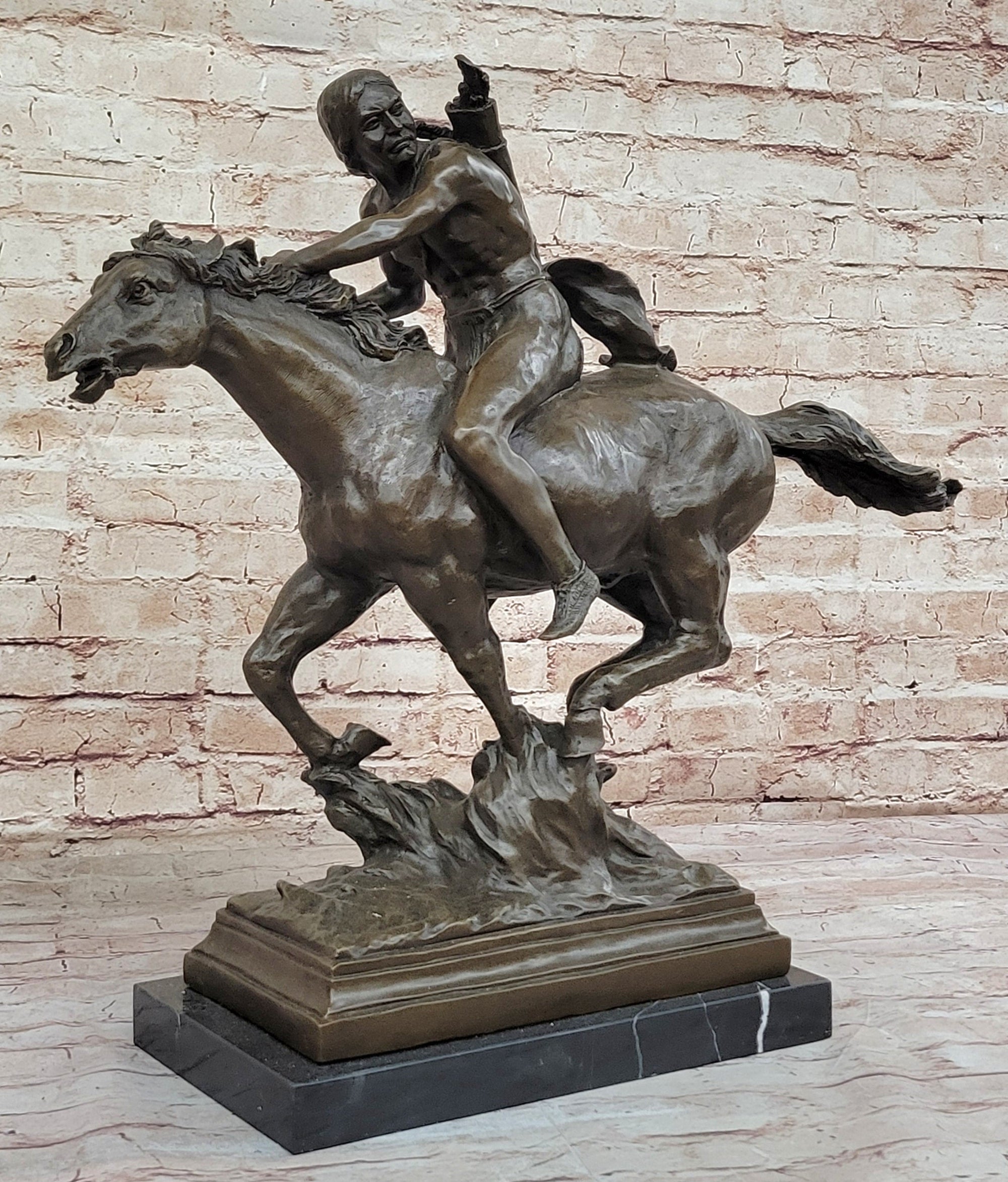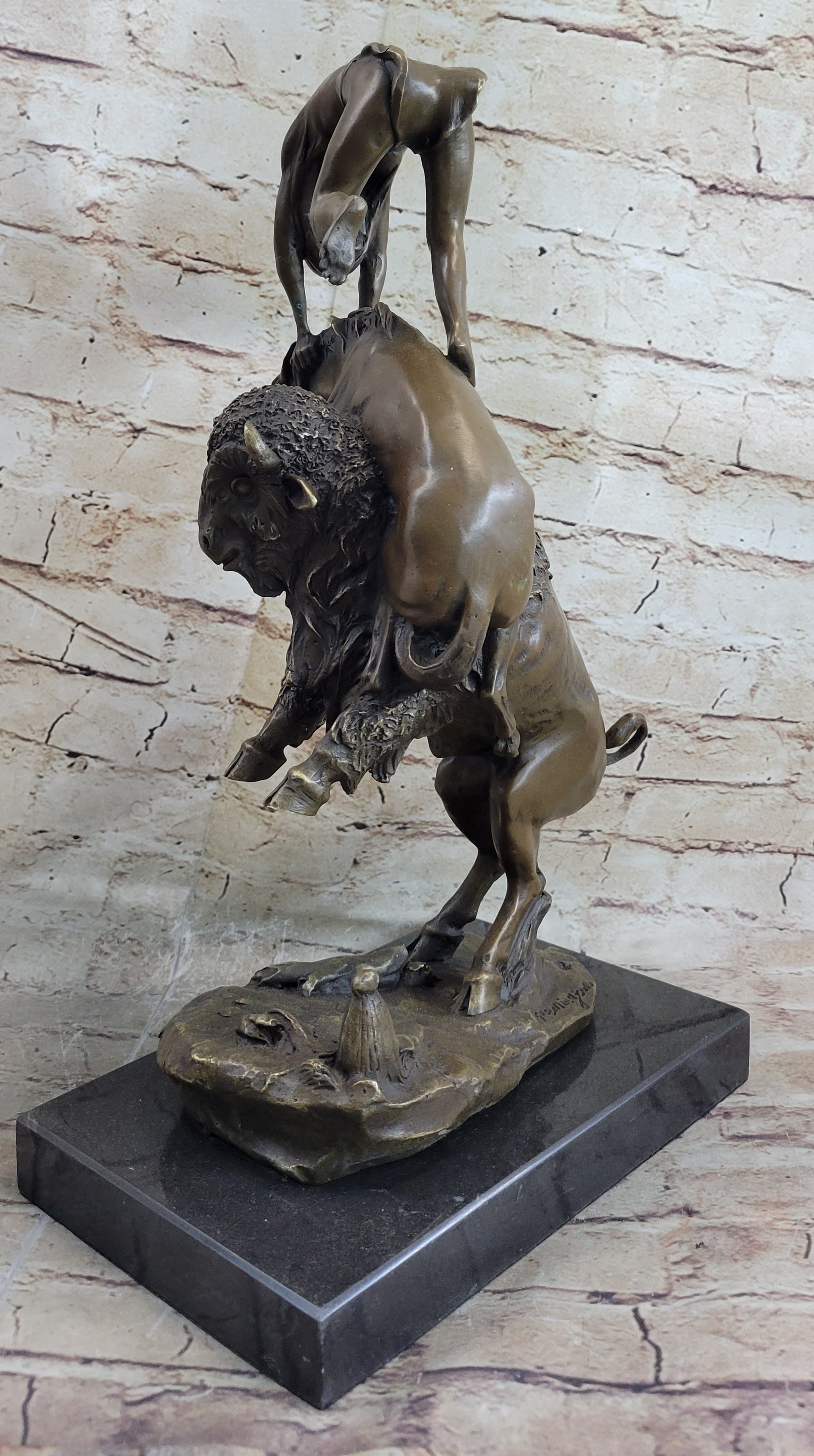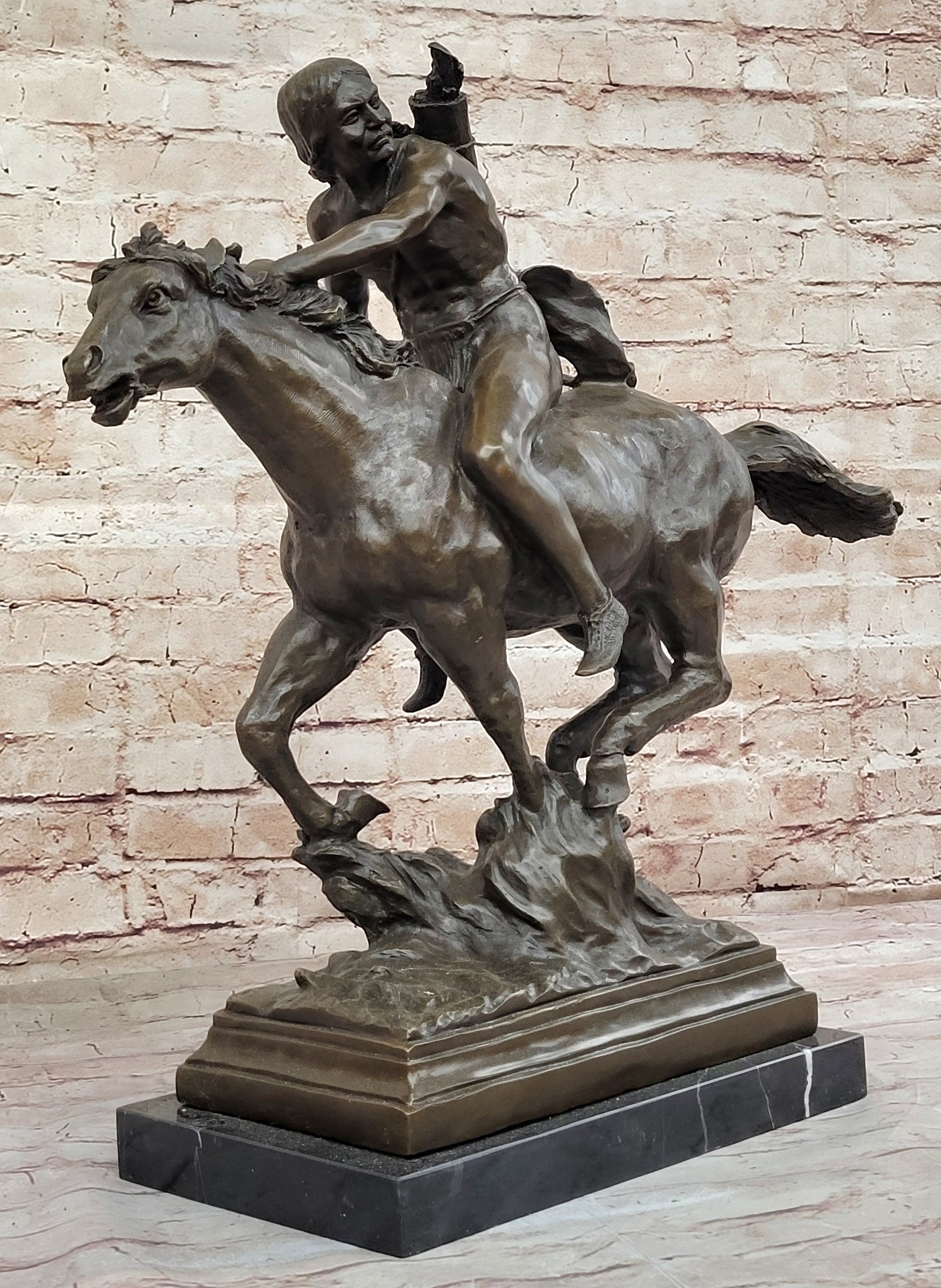 Bronze Sculpture Statue of Native American Indian Man Jumping over Buffalo & Horse