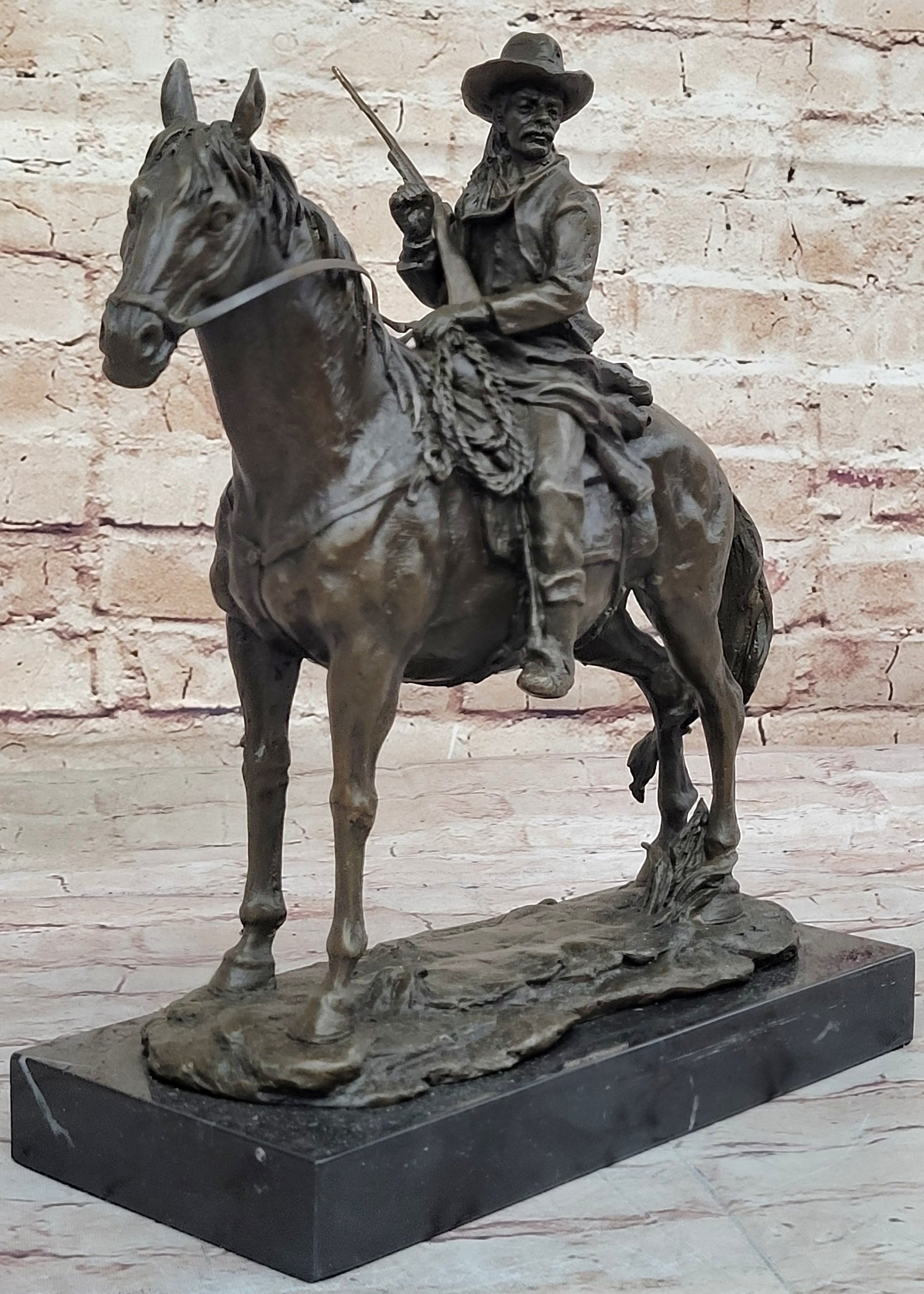 Bronze Remington Tribute Cowboy w/ Rifle Riding Horse Sculpture Statue Marble 12" x 12"