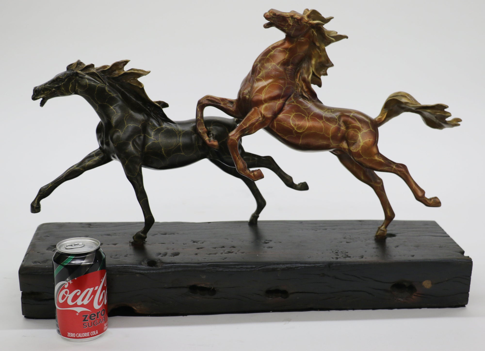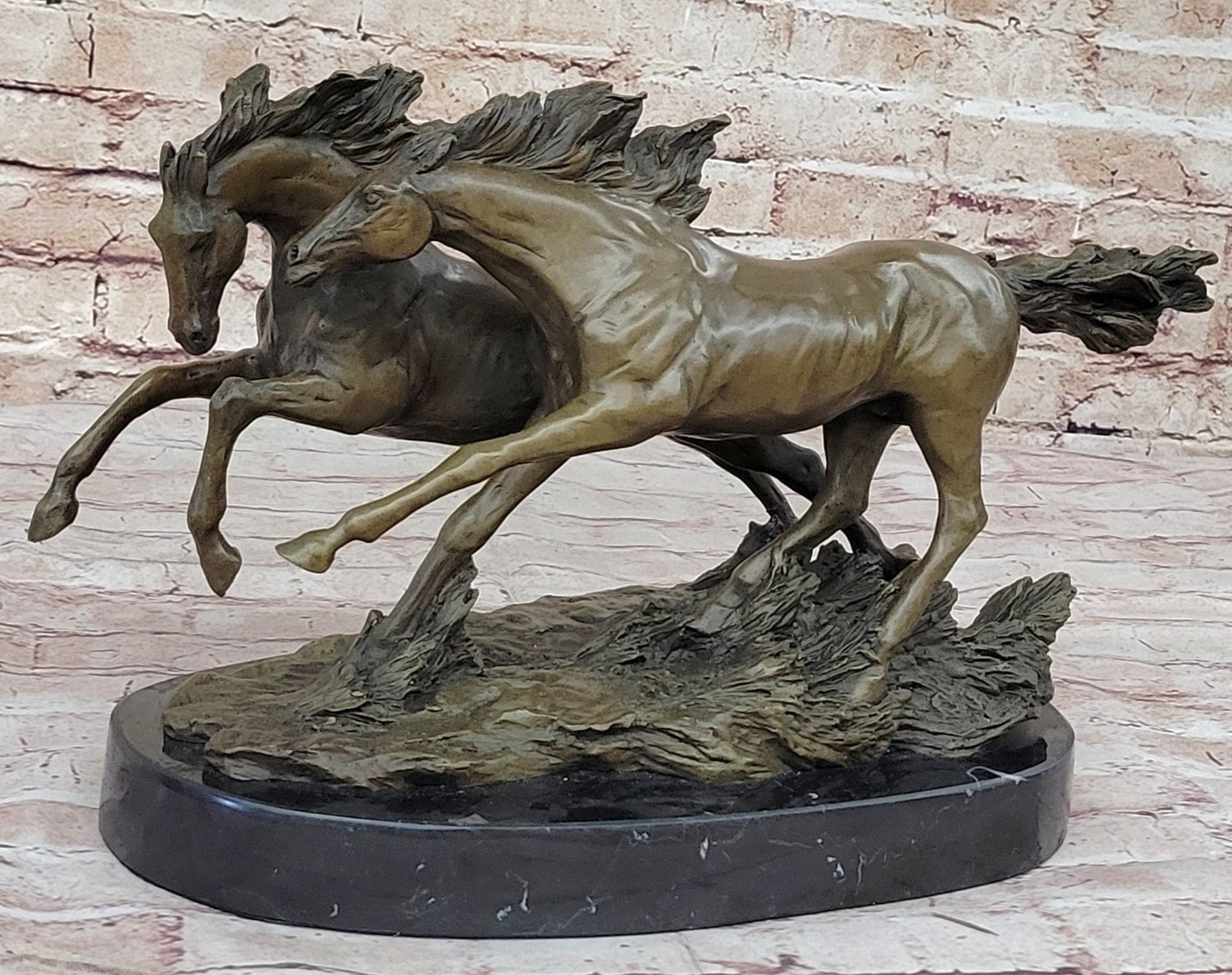 Extra Large Two Racing Horses Stallion on Natural Wood Bronze Sculpture Statue