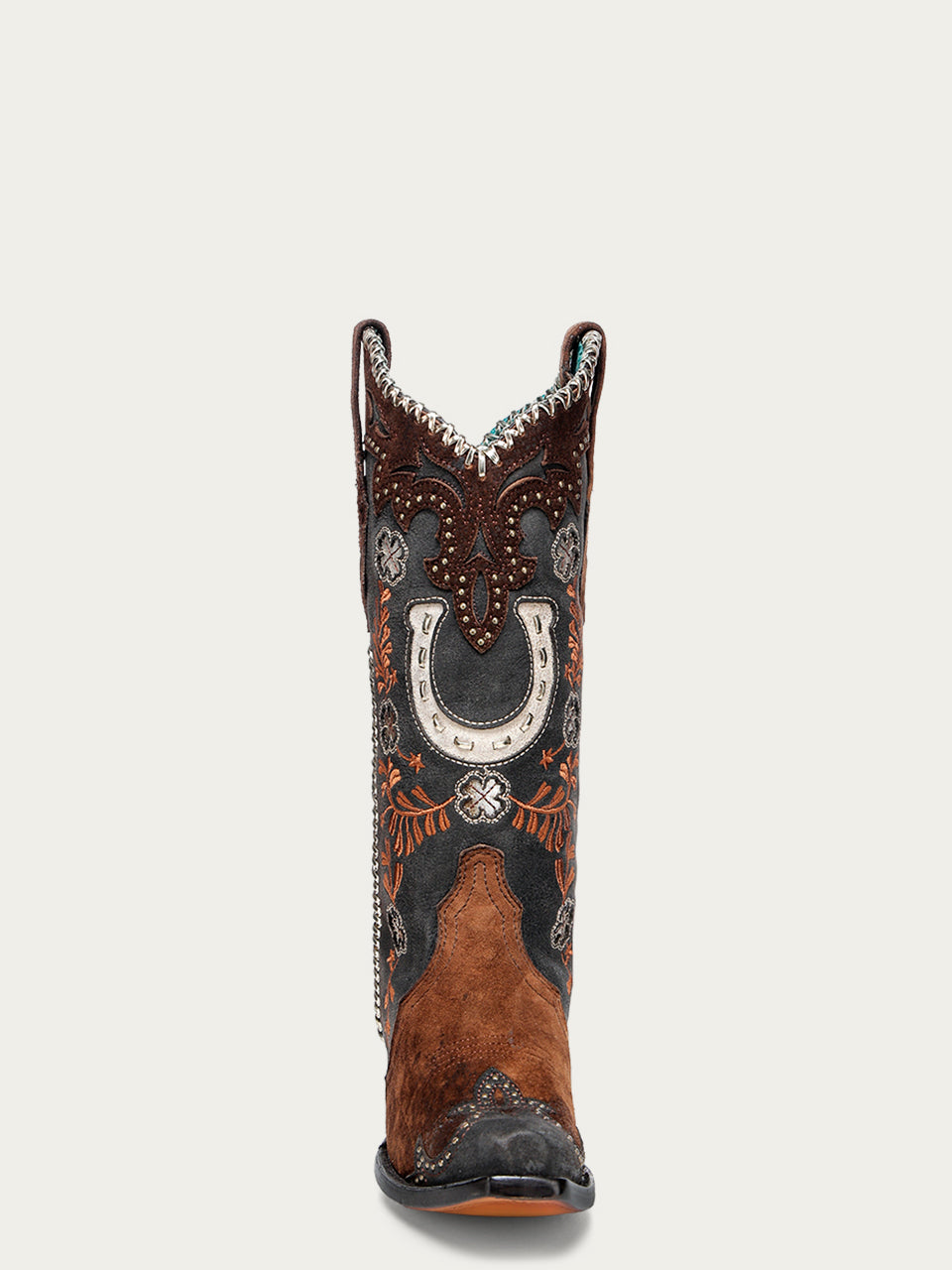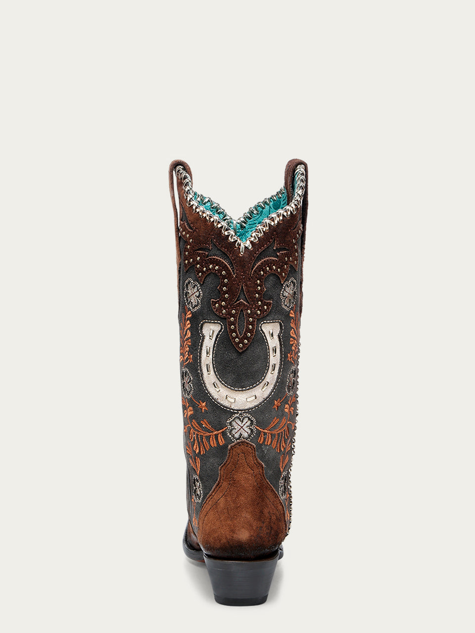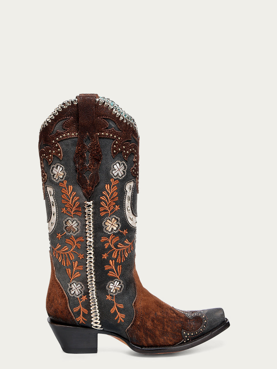A4862 - WOMEN'S FLORAL AND HORSE-SHOE EMBROIDERY, WOVEN AND OVERLAY LAMB SQUARE TOE BROWN COWBOY BOOT