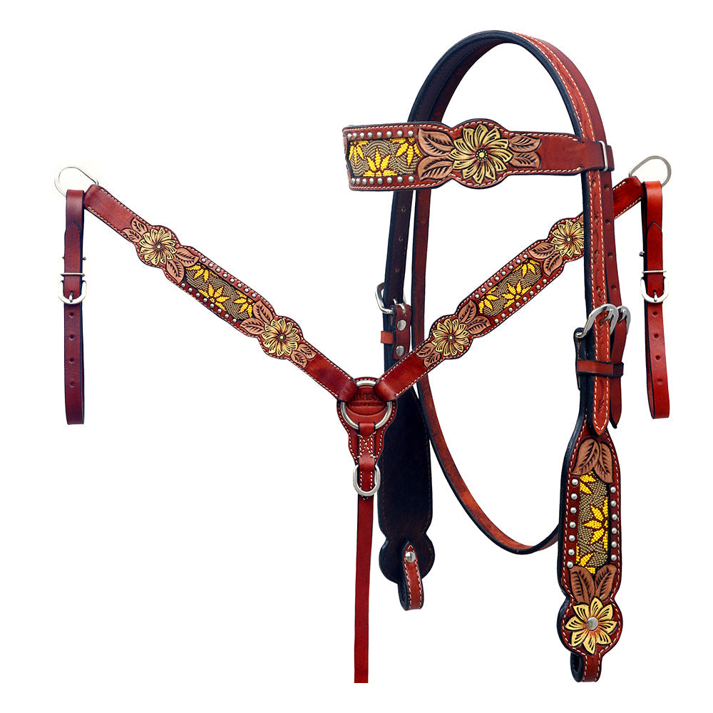 HILASON Western Horse Genuine Leather Floral Design Tack Set Mahogany