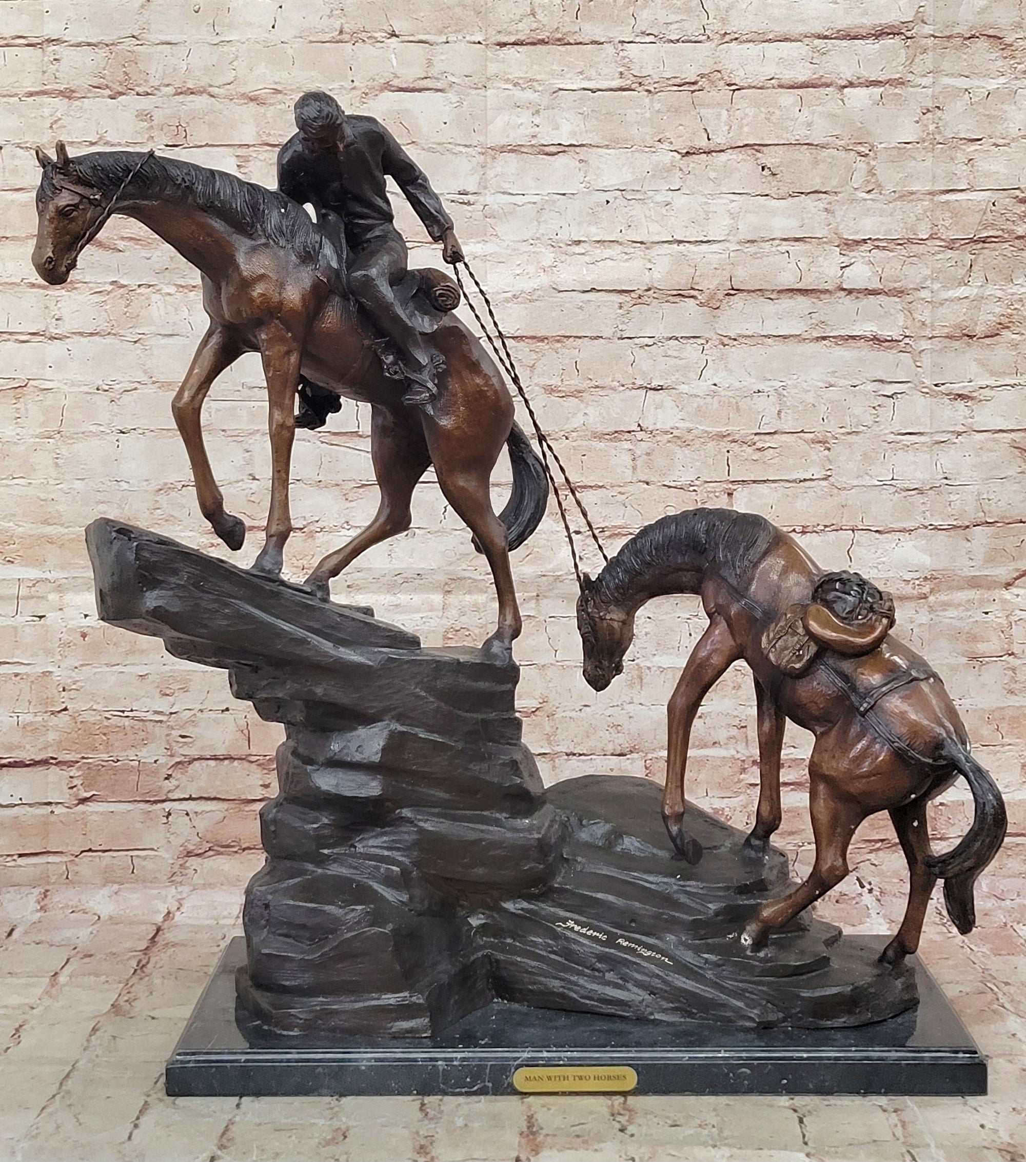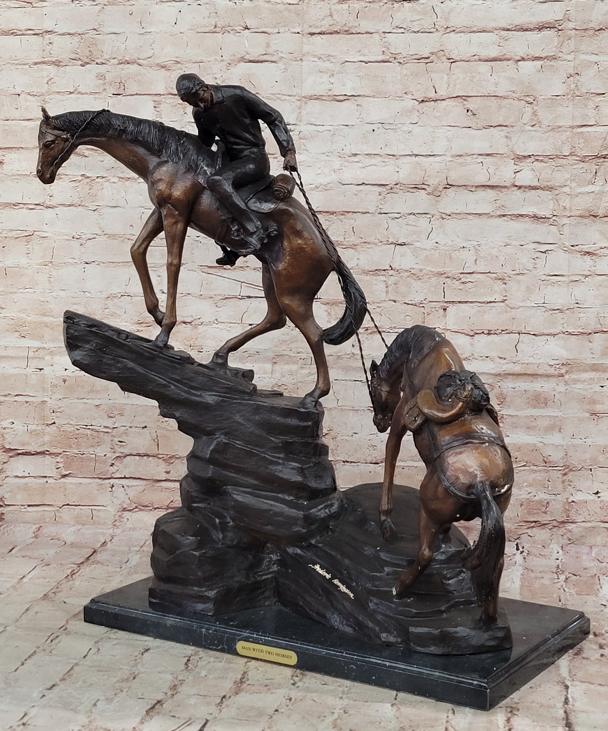 Frederic Remington Cowboy & Two Horses Western Bronze Statue Sculpture 26" x 28"