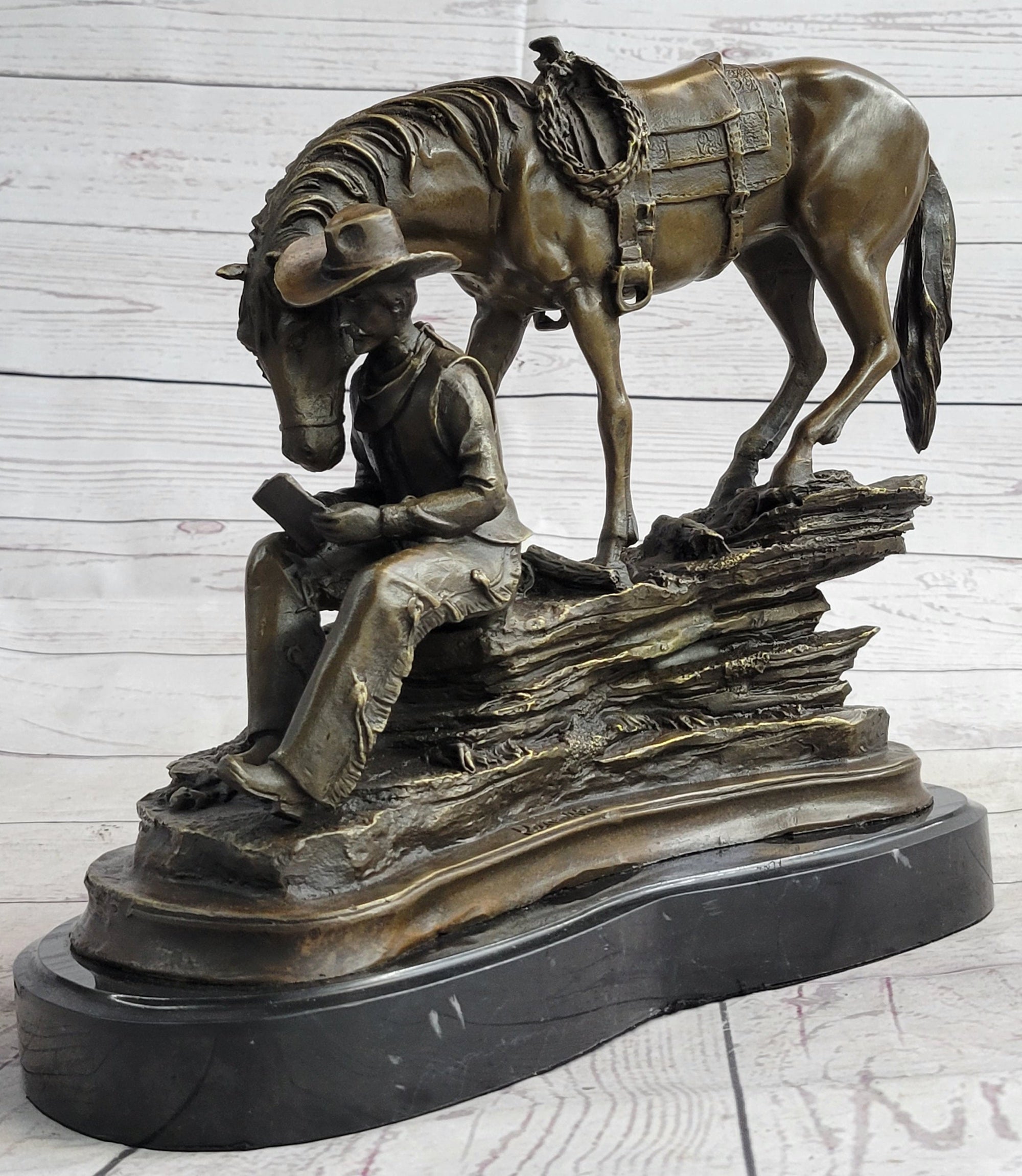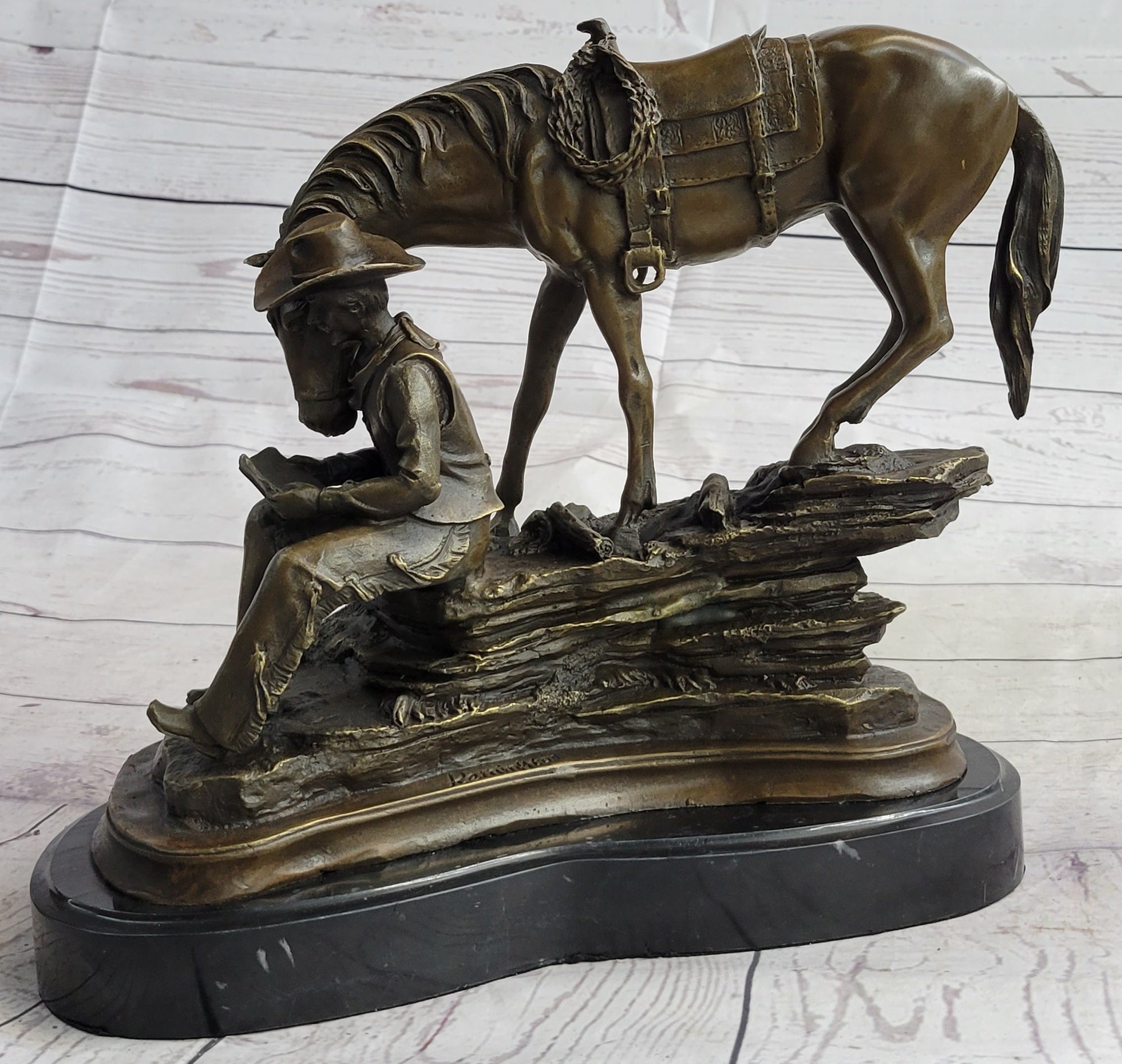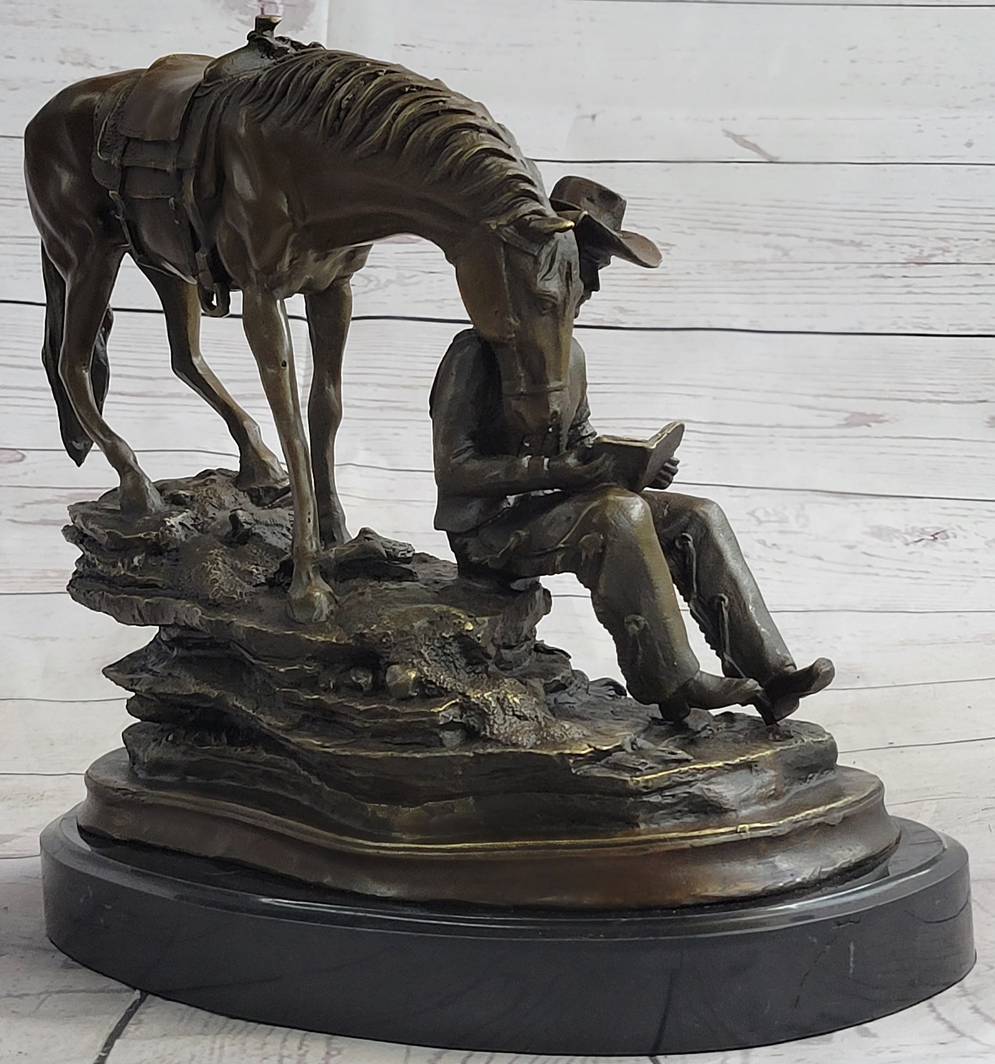 Cowboy Reading a Book with Horse Bronze Metal Western Sculpture Statue Remington Decor 11" x 13"