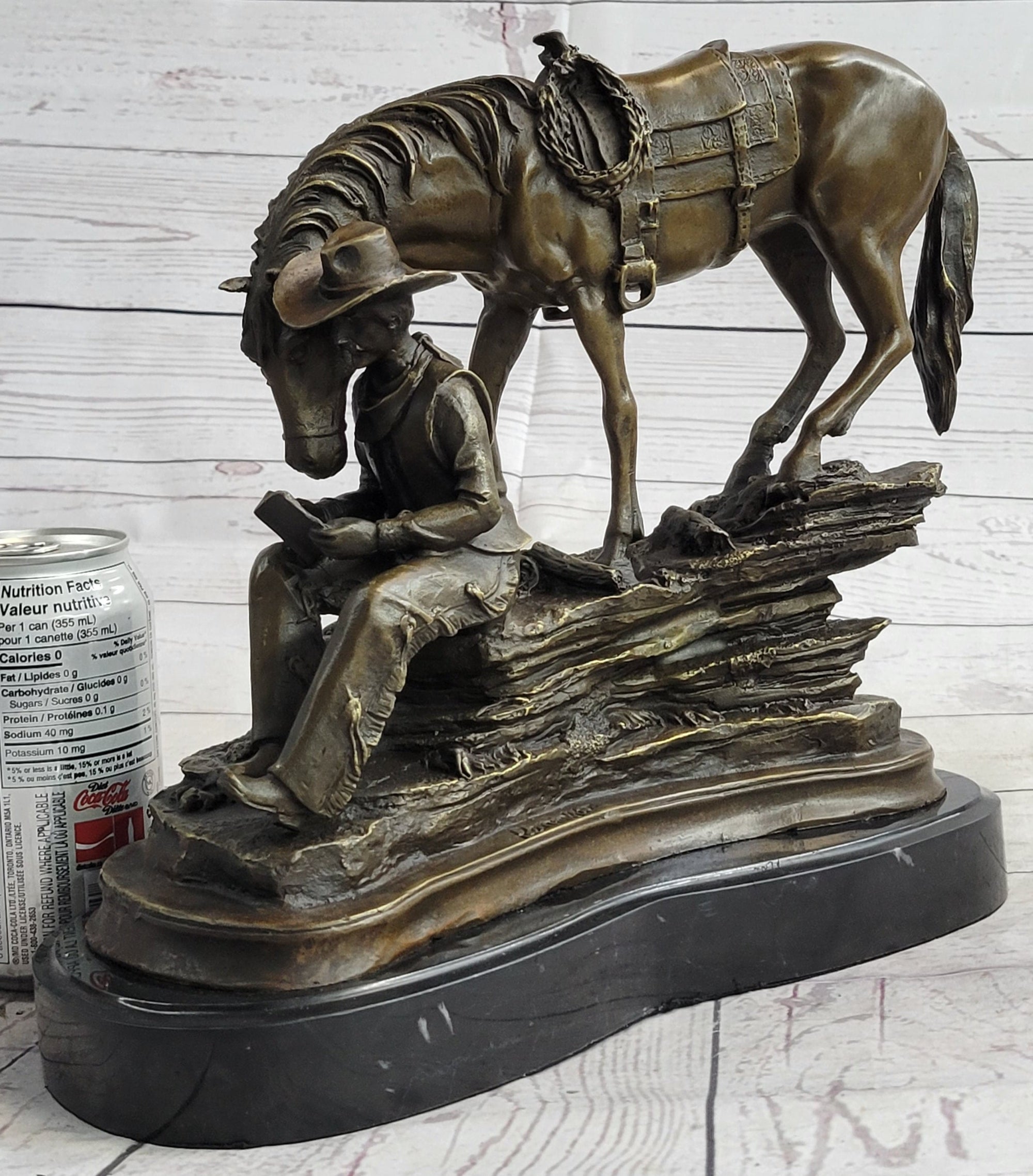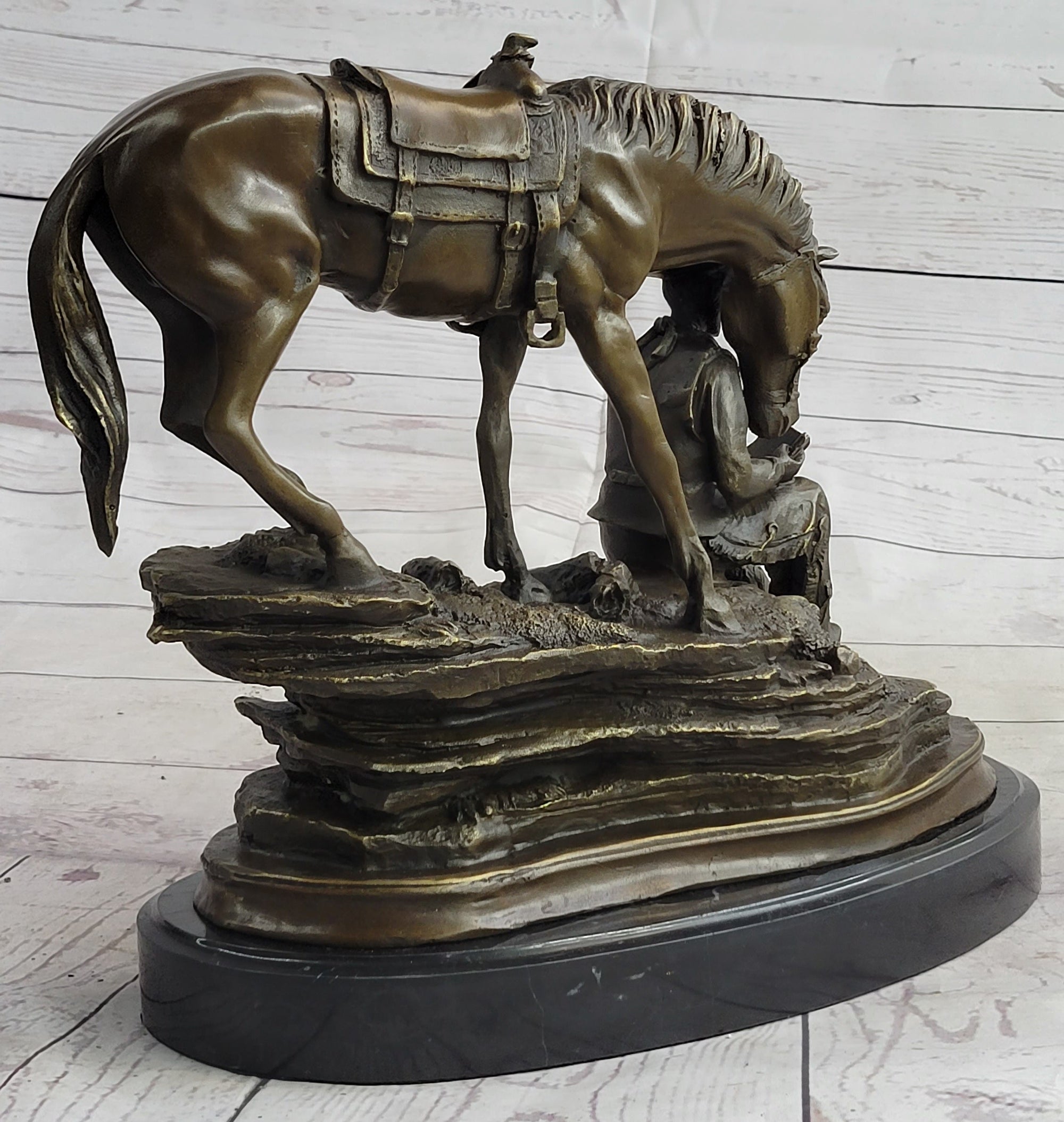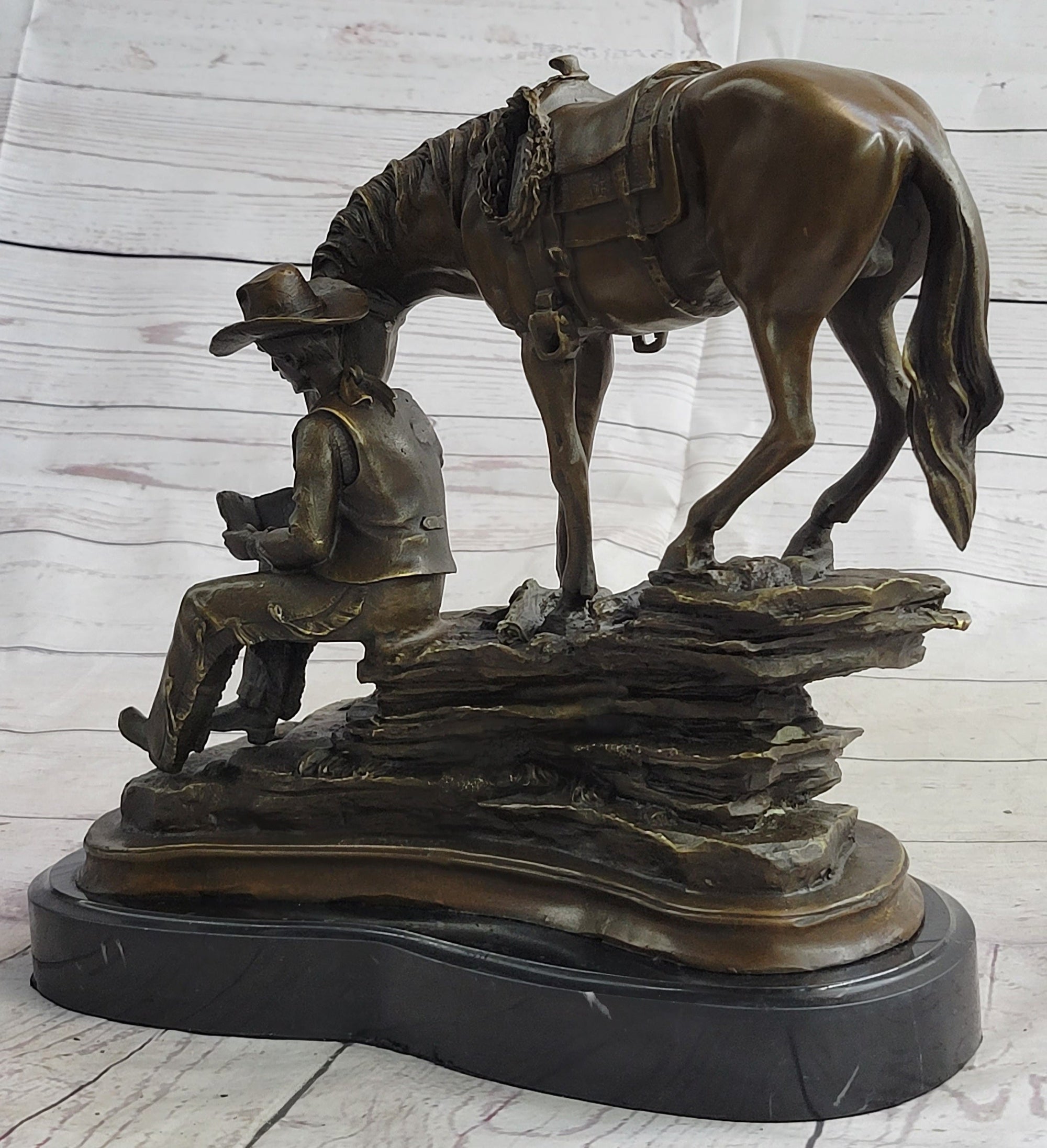 Cowboy & Horse Sitting Having a Drink Bronze Statue Sculpture Country Western