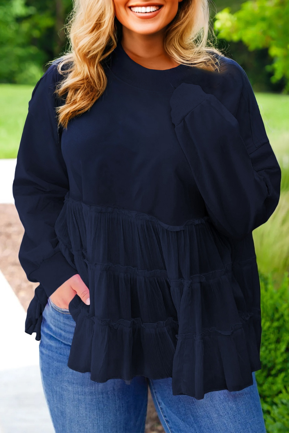 Plus Size Solid Ruffle Tiered Ribbed Crewneck Top