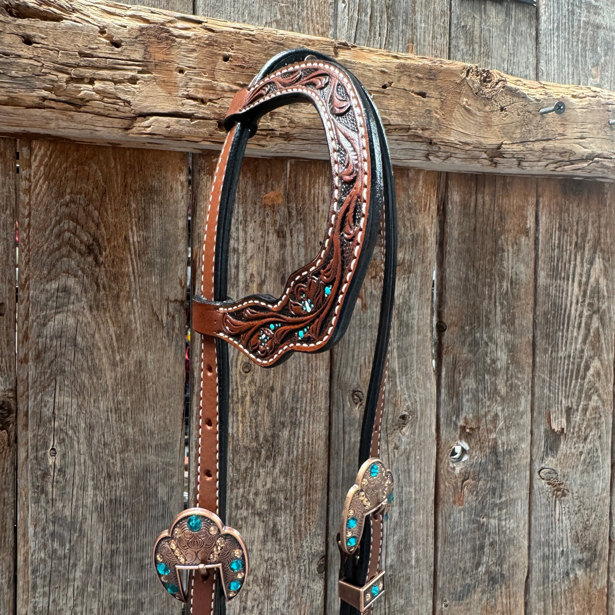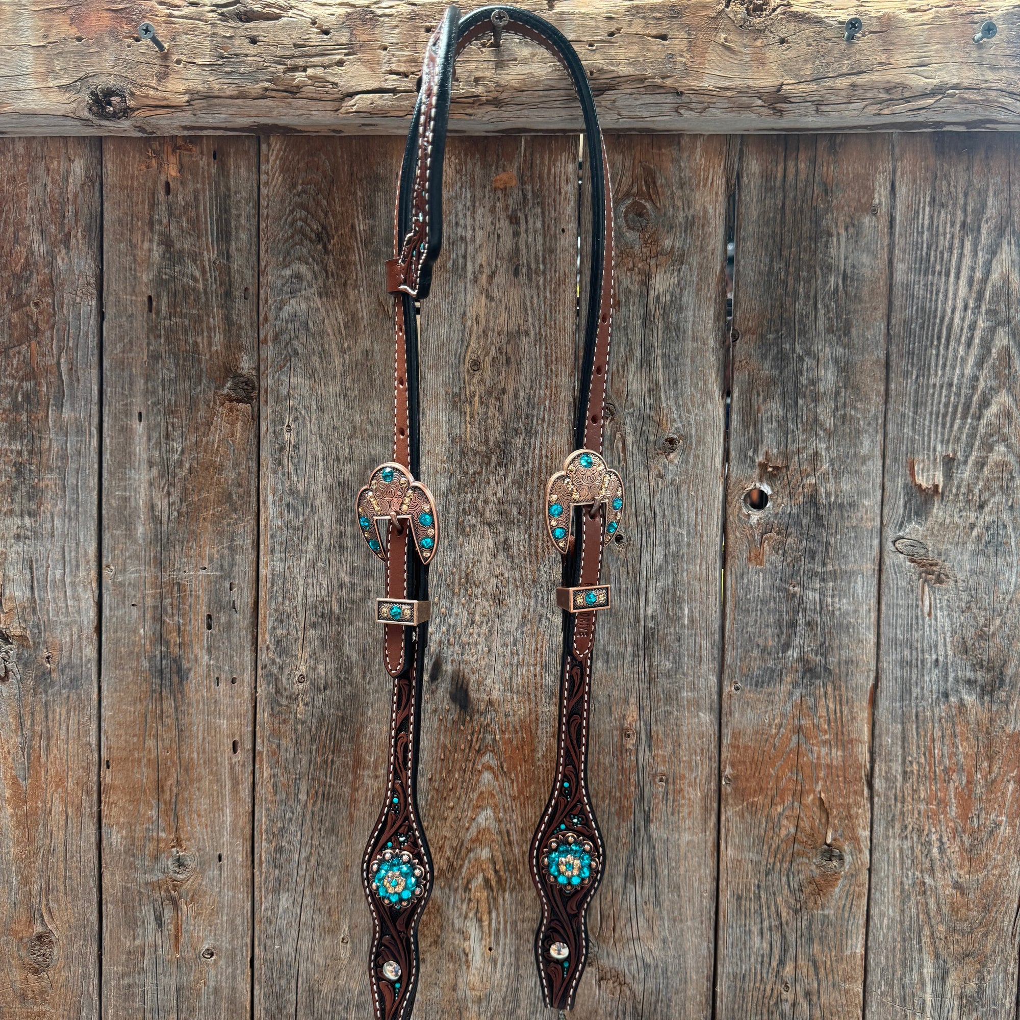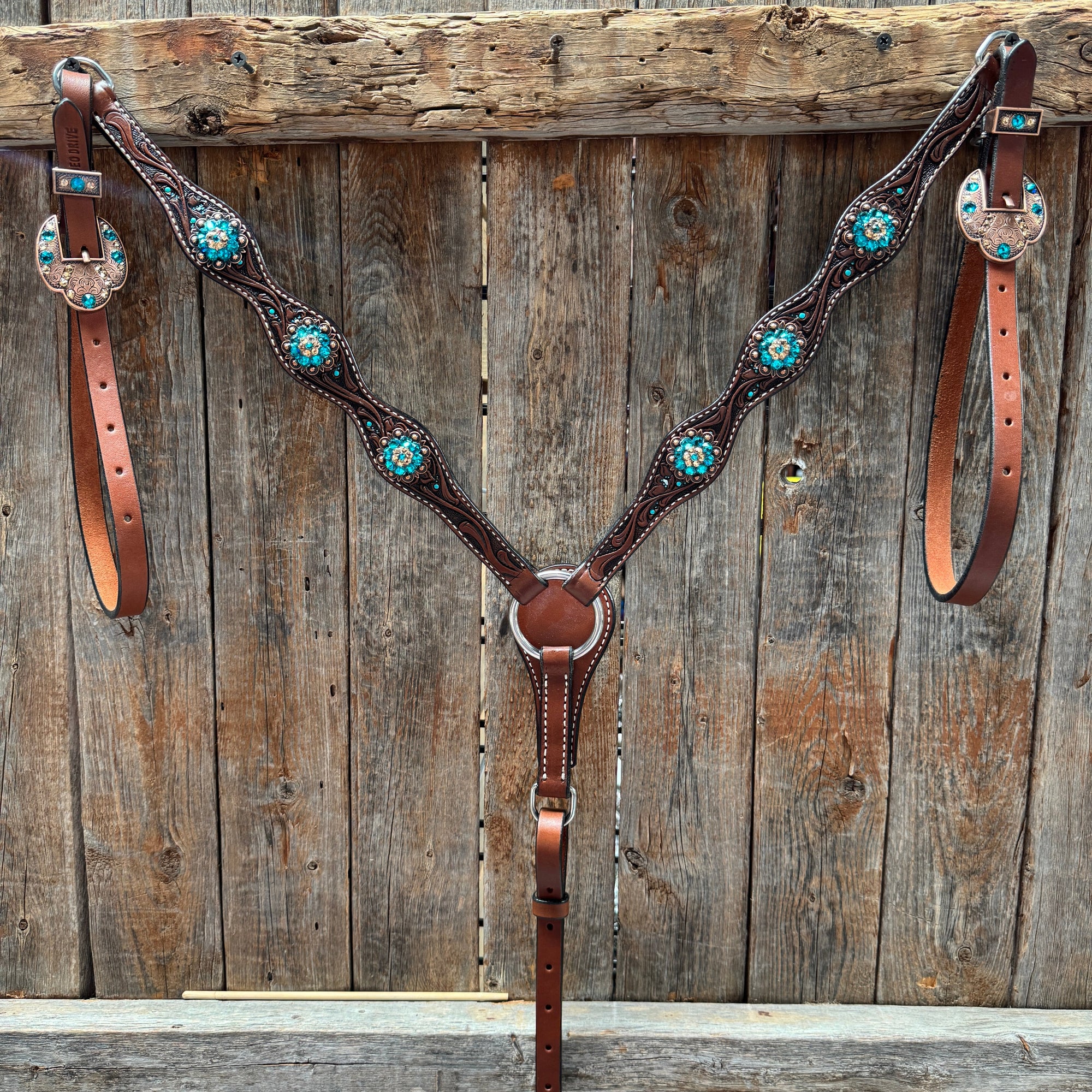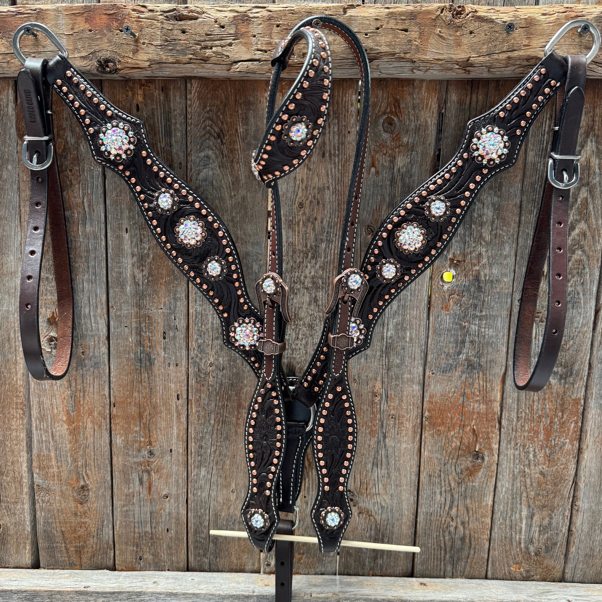 Dark Oil Floral Copper Dot AB One Ear / Breastcollar Tack Set #OEBC428