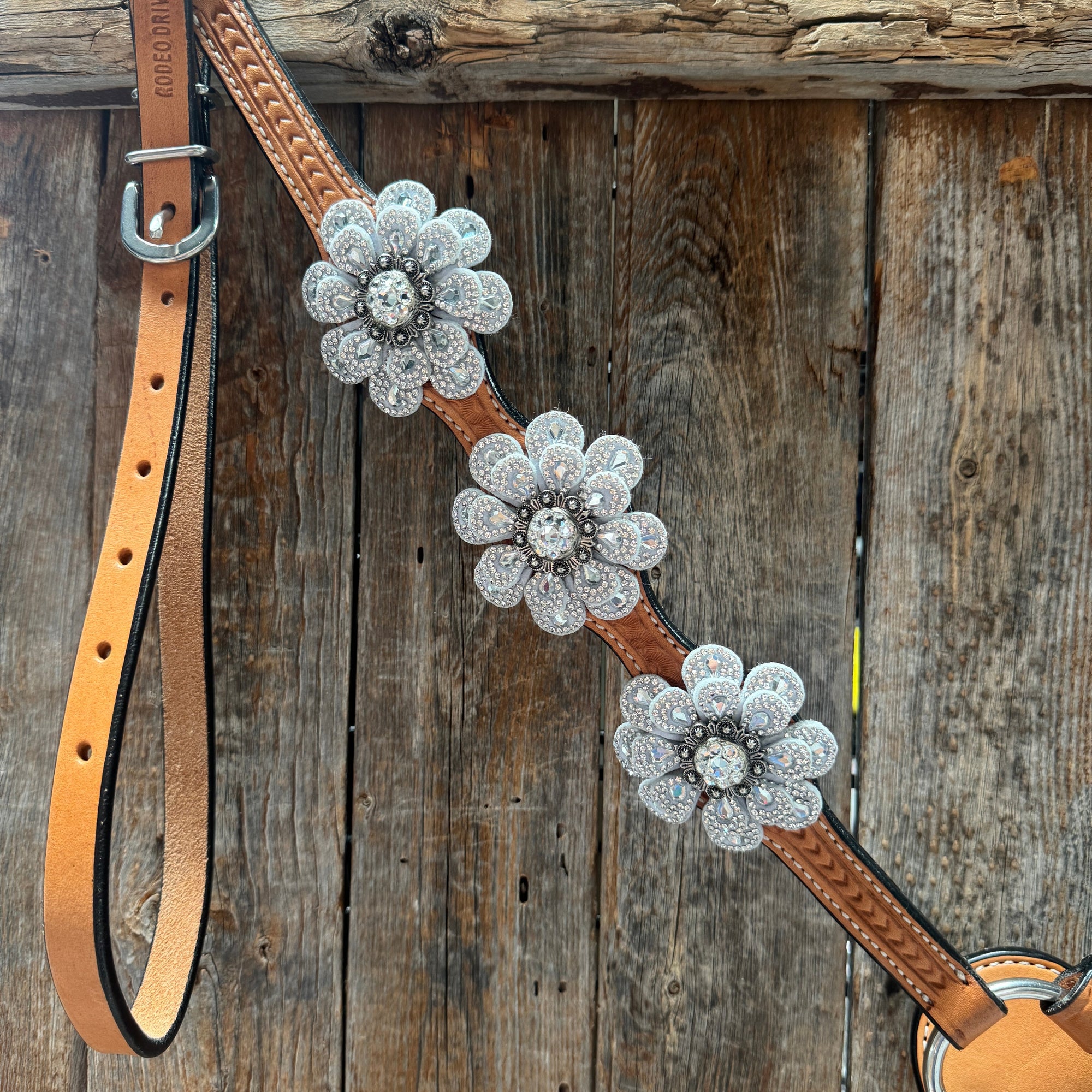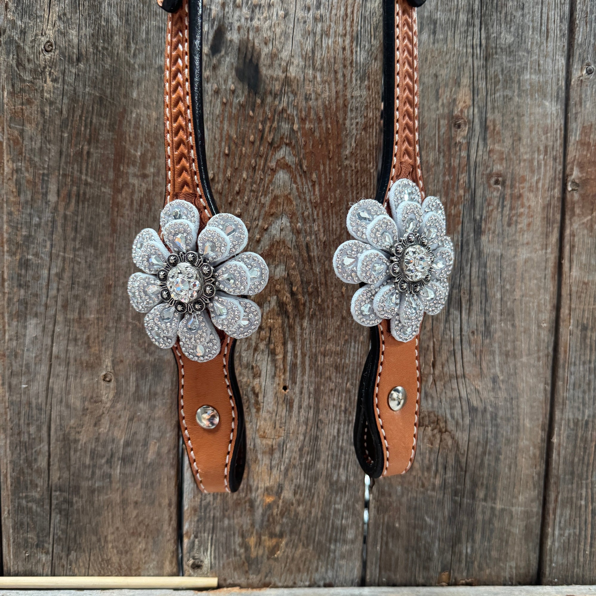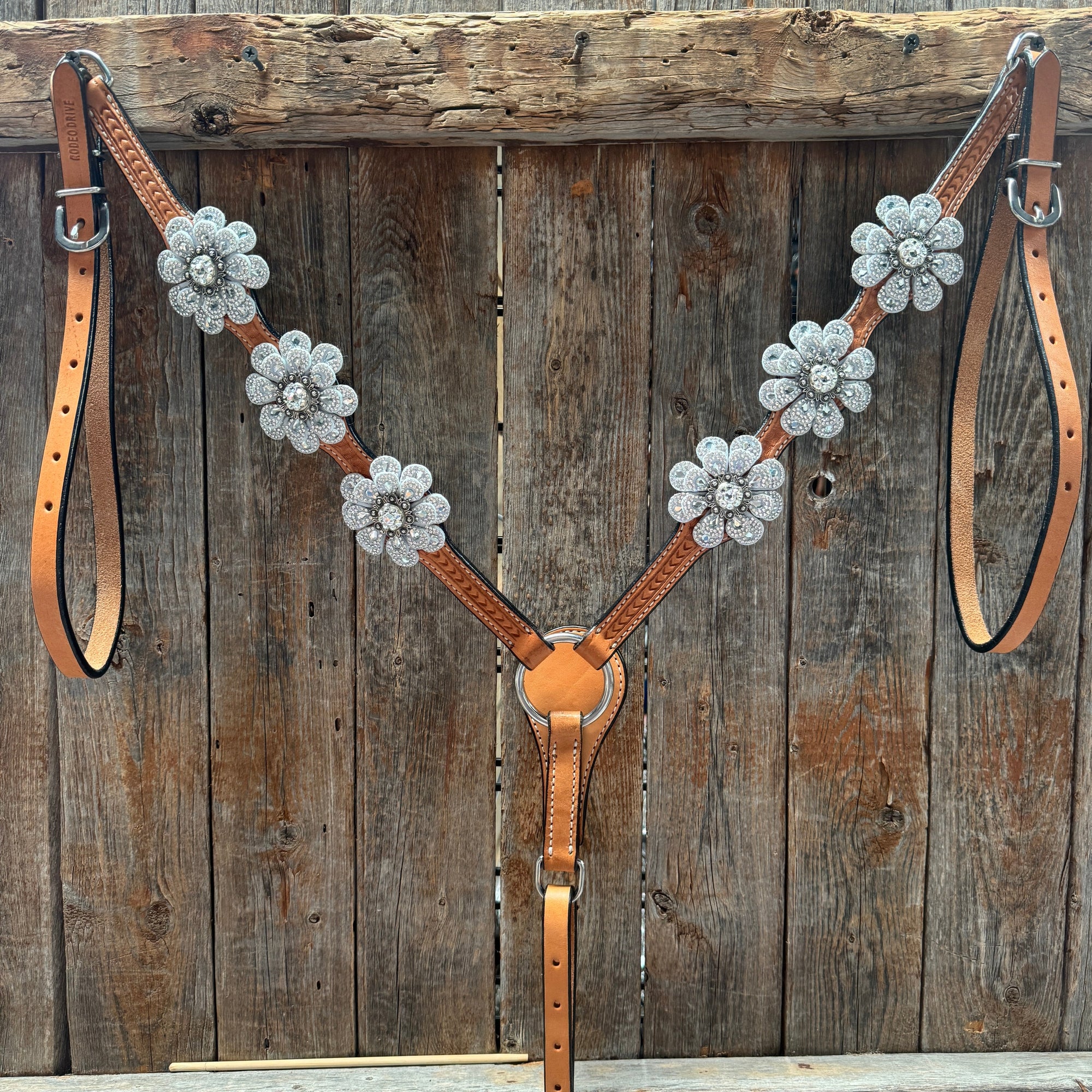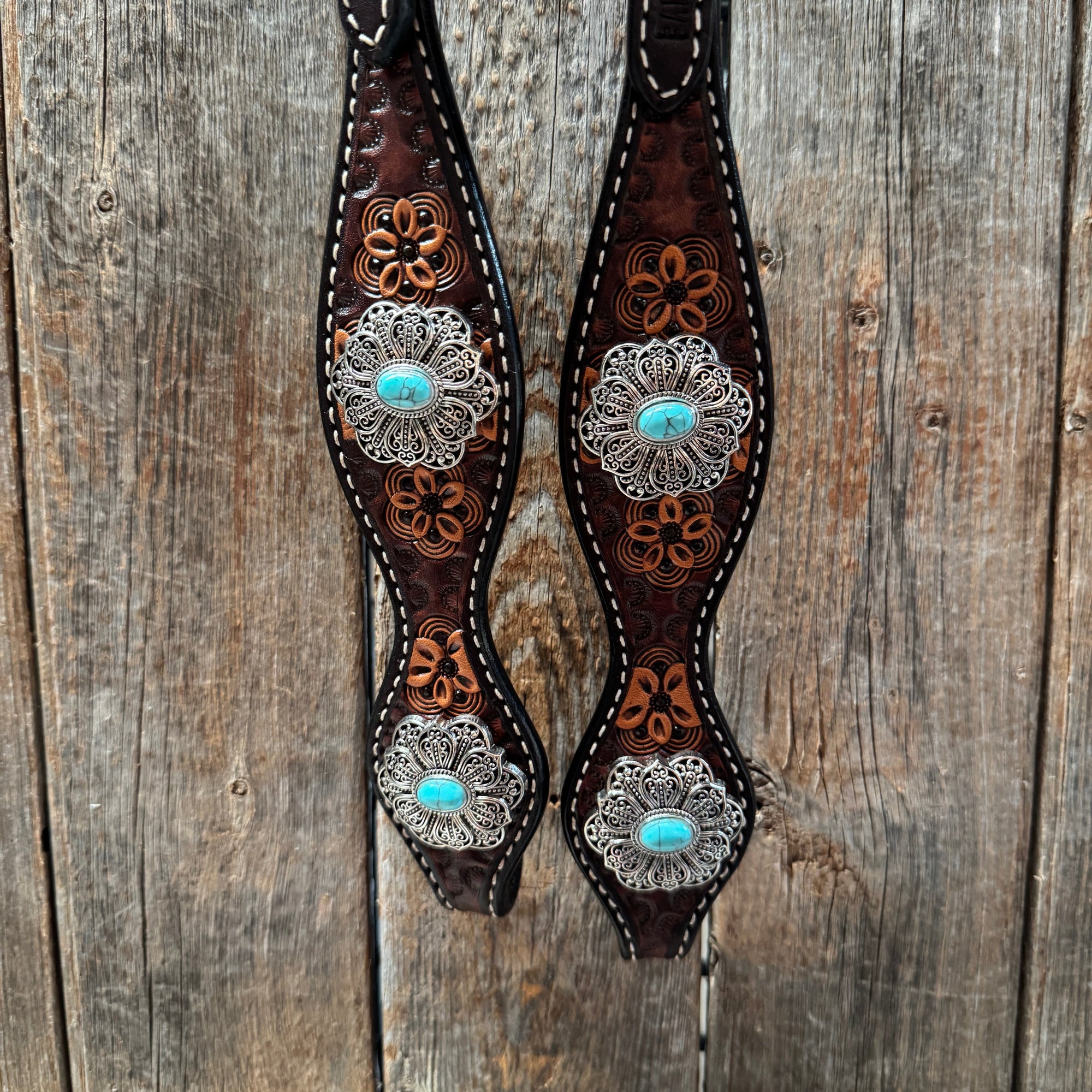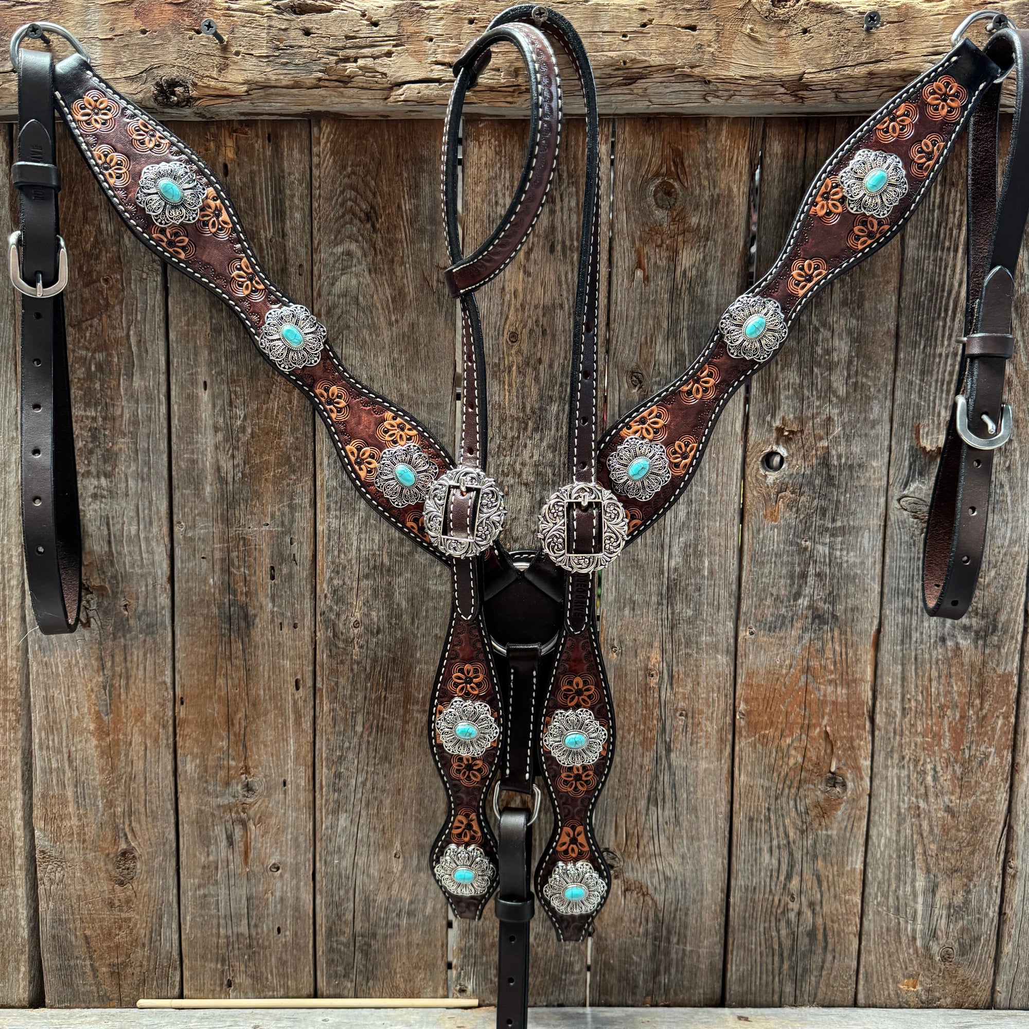 Flower Power Antique Silver and Turquoise One Ear Headstall & Breastcollar Tack Set #OEBC429