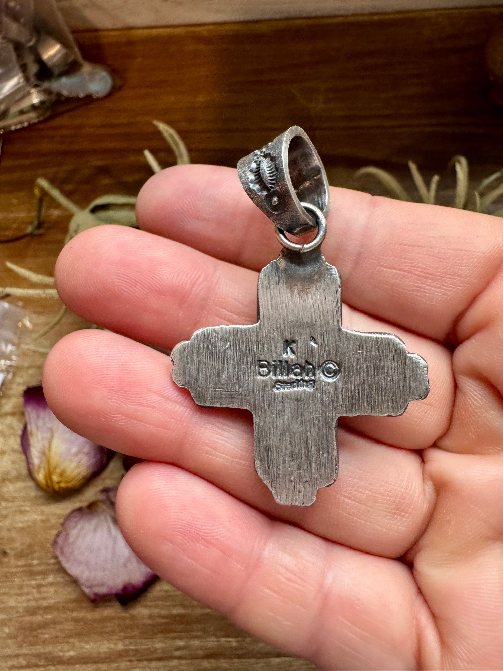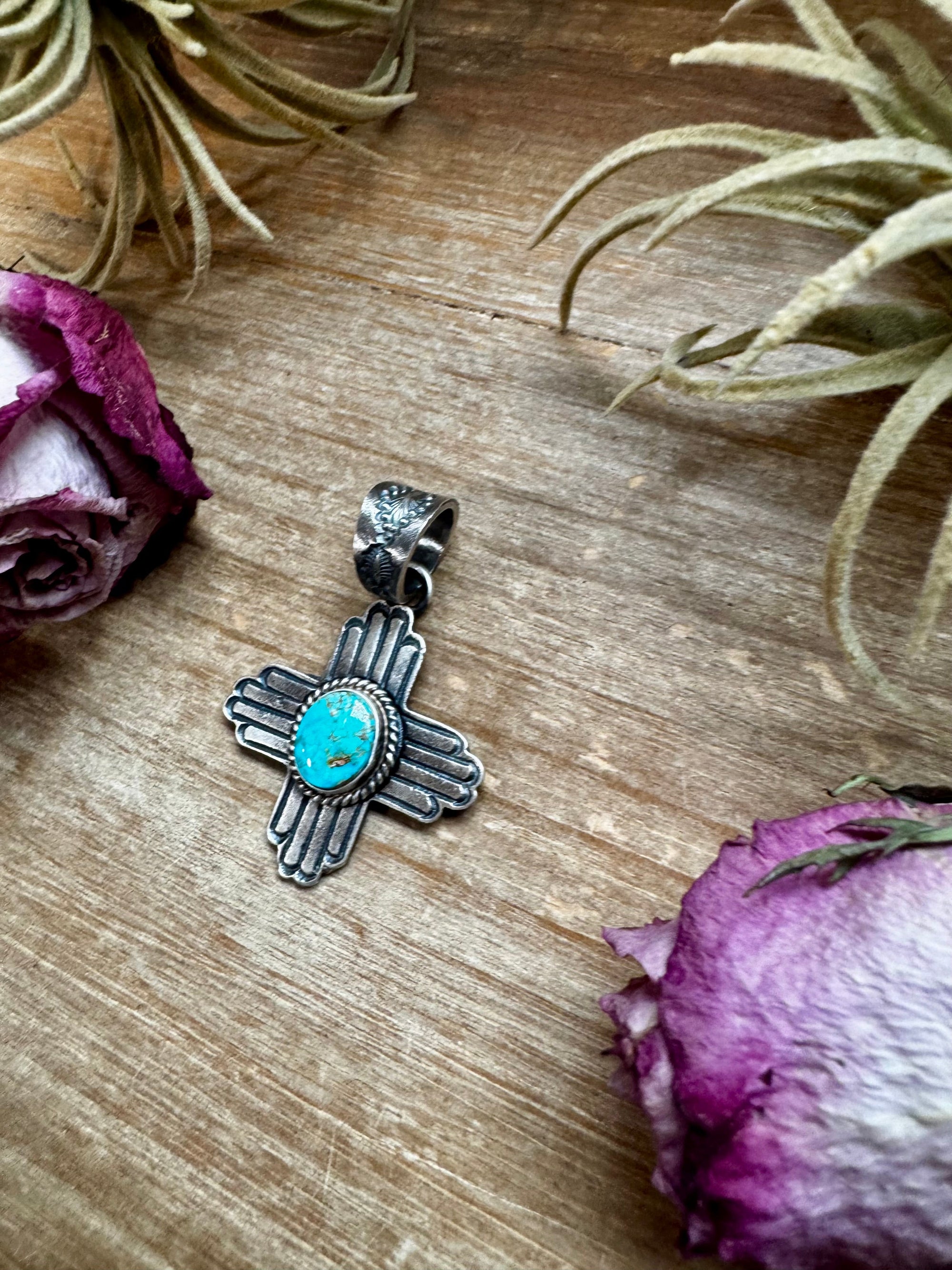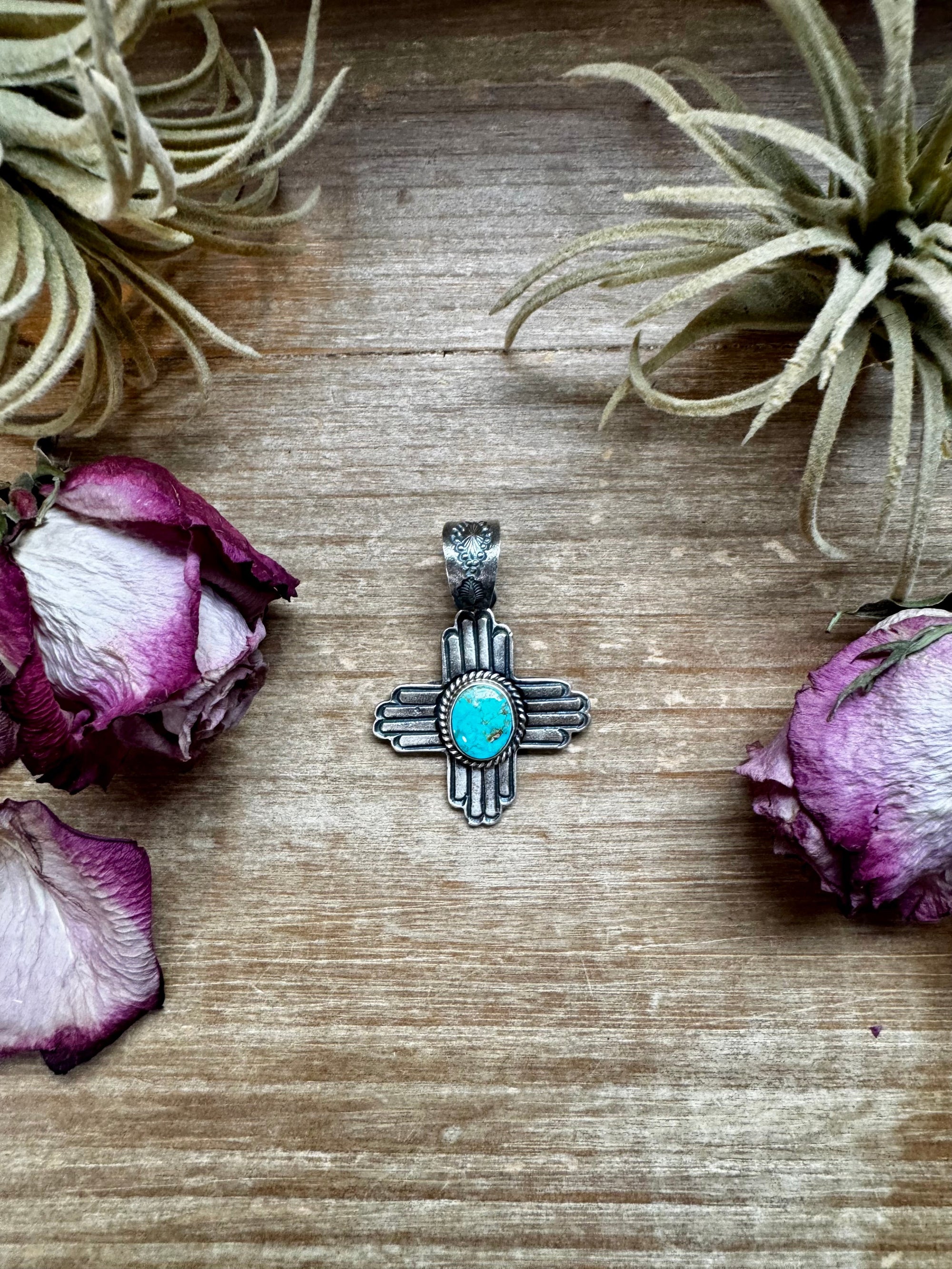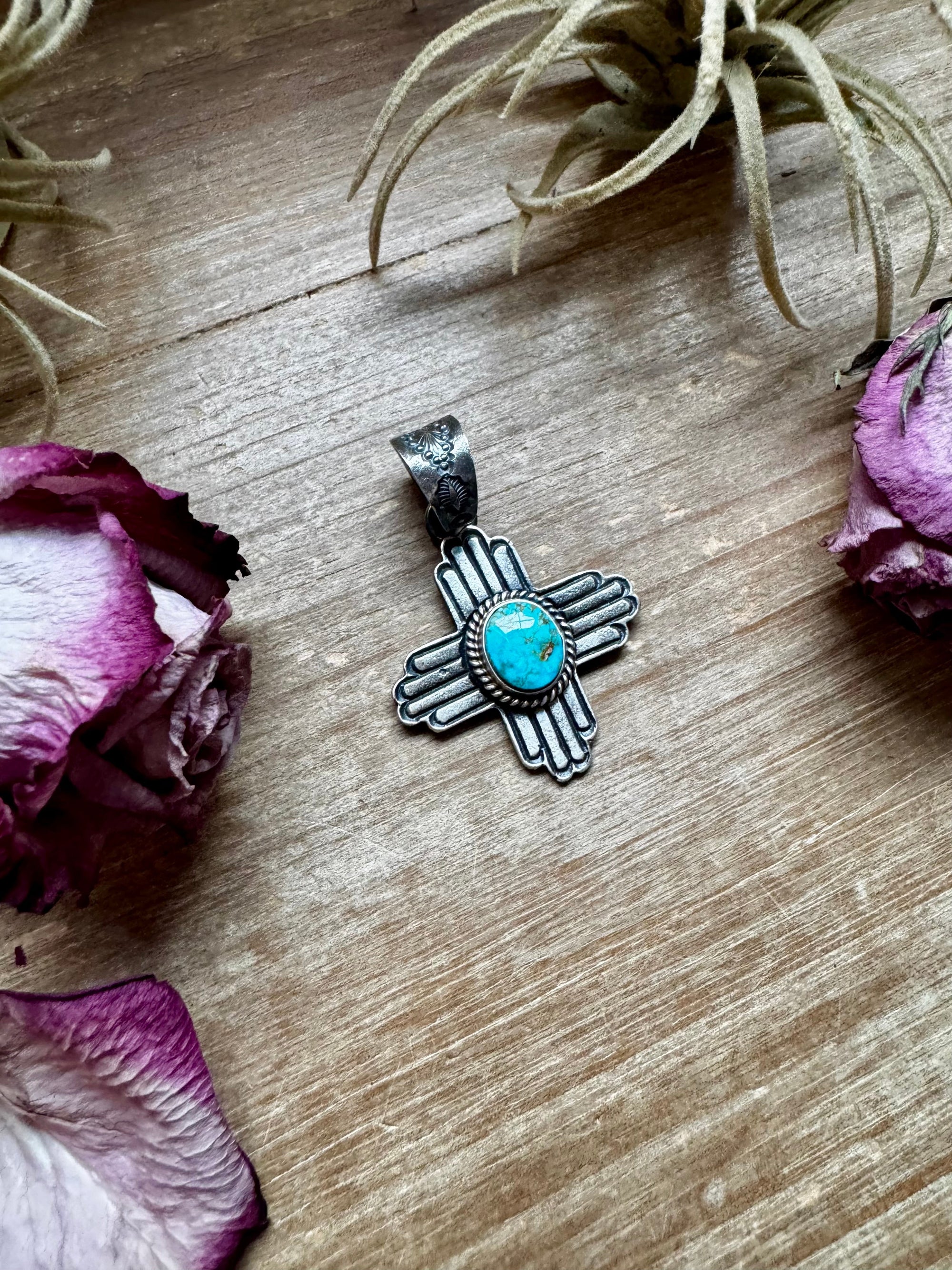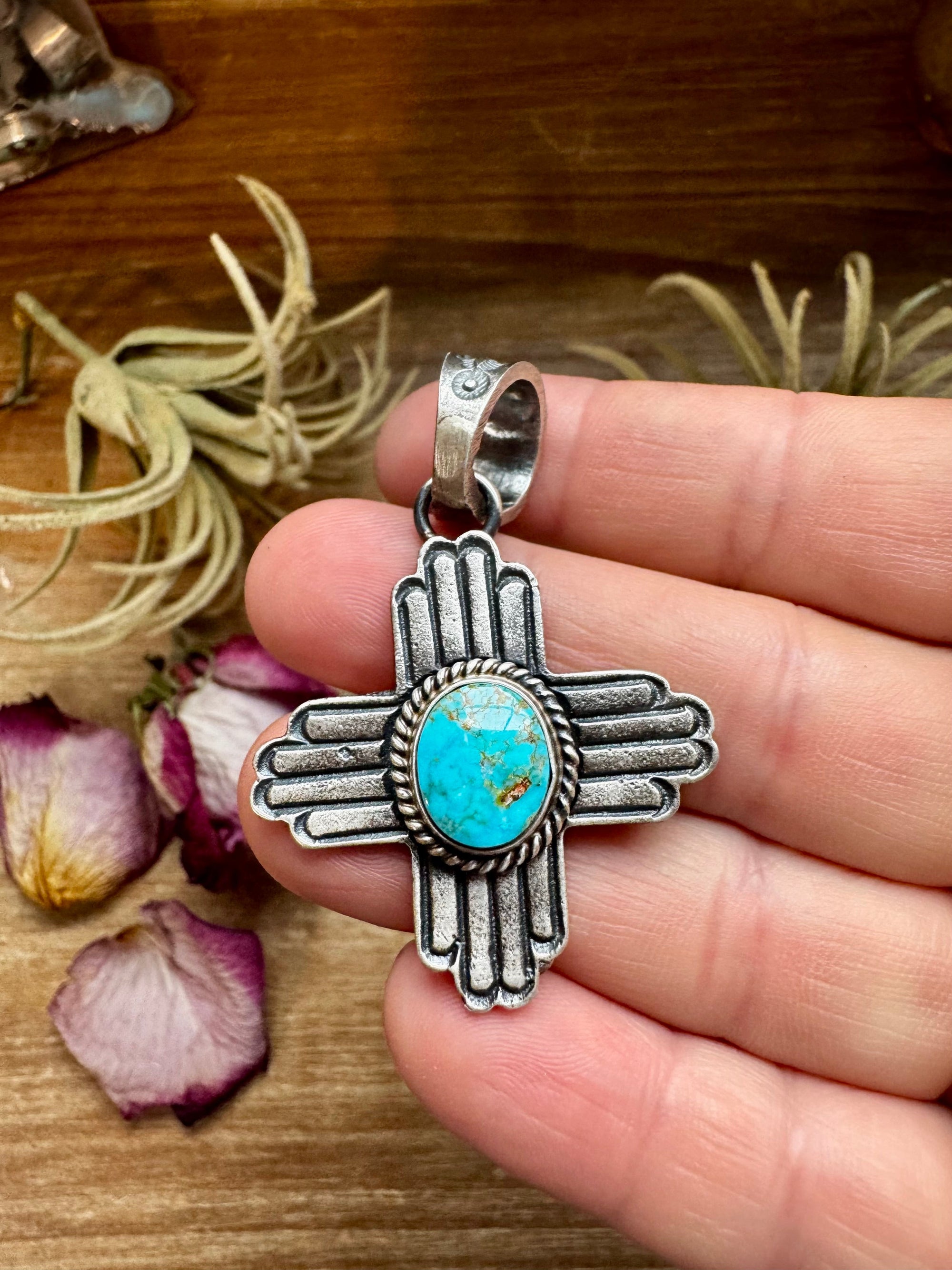 Zia Symbol Pendant with Sonoran Gold Turquoise – Sterling Silver – Native Made by K. Billah – Fits 8mm