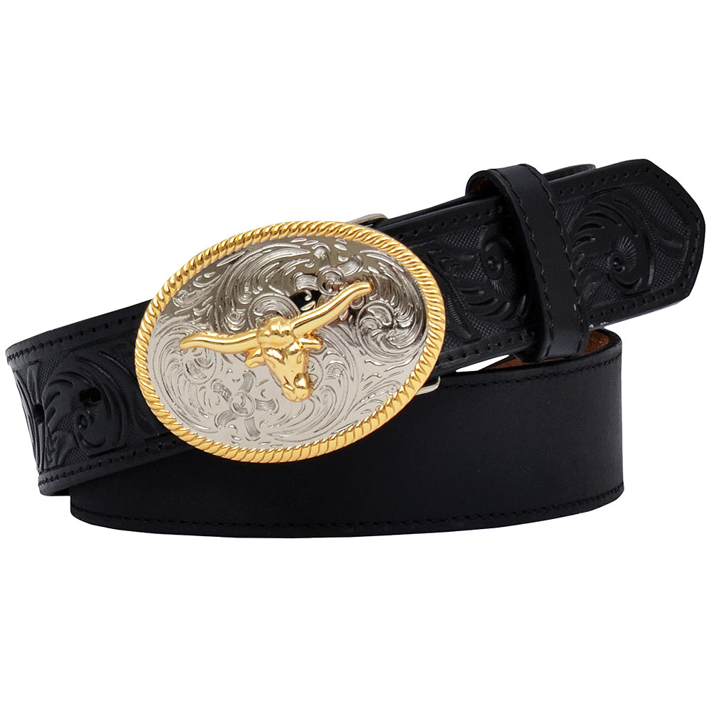 3D Belt Western Boys Basic Longhorn Floral Leather Black