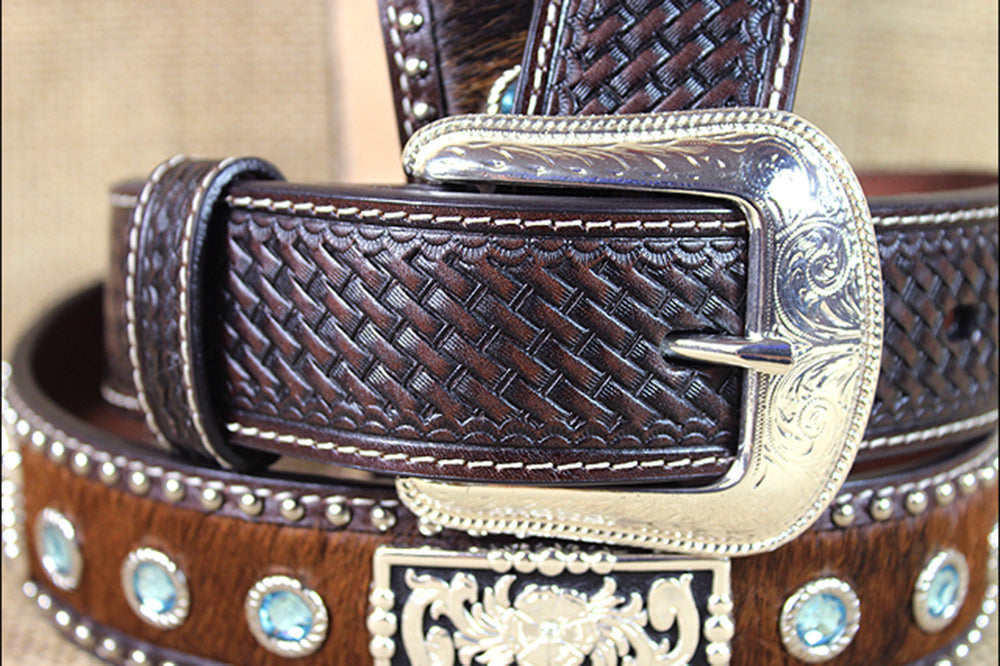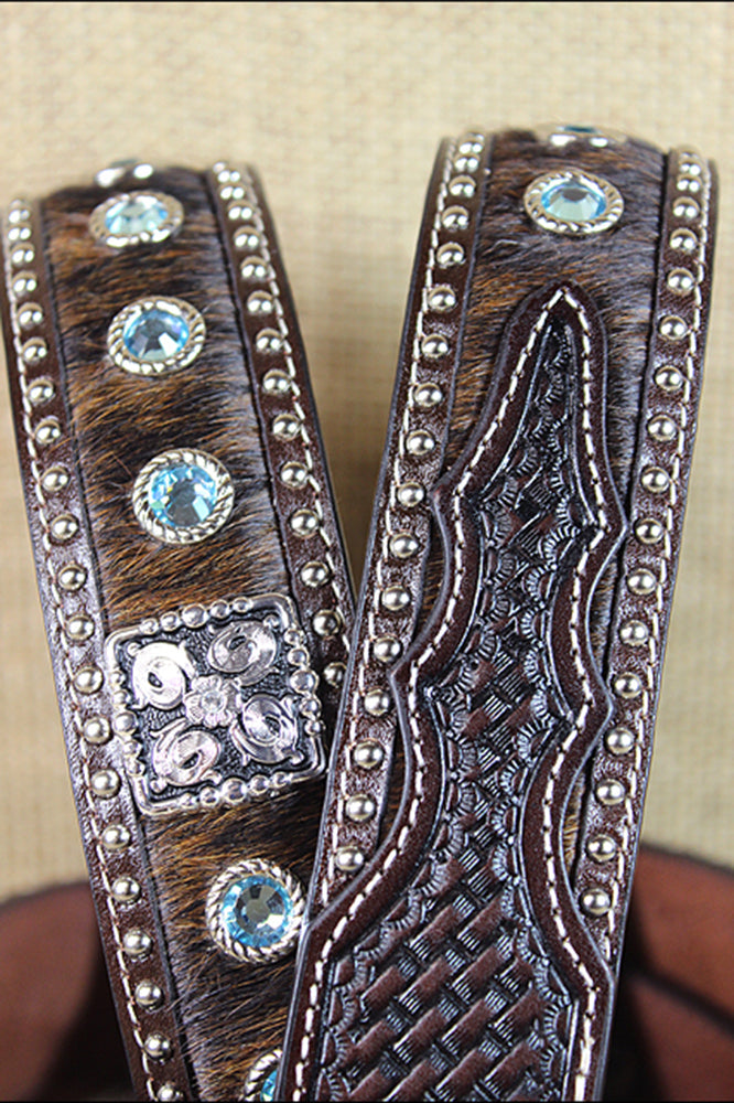 Dark Brown Tooled Leather & Hair-On Belt Blue Crystals Basketweave Silver Buckle