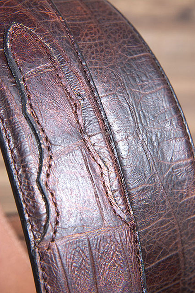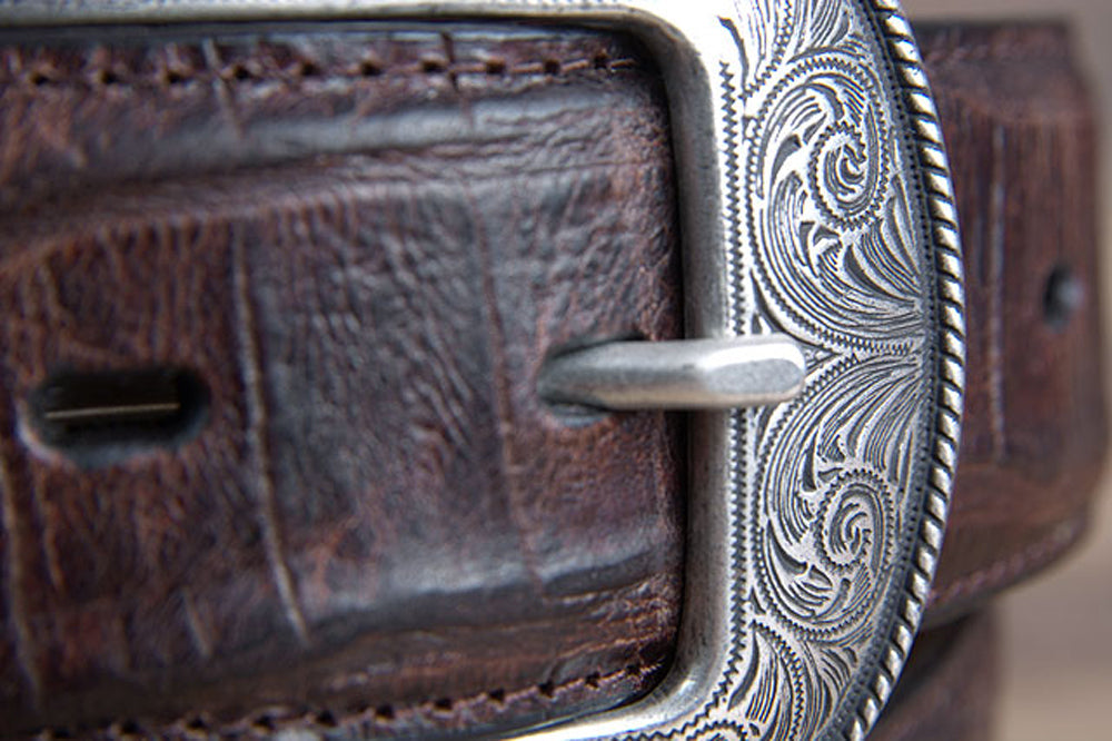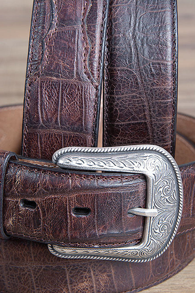 Mens M&F Western Distressed Brown Croc Print Leather Belt Engraved Silver Buckle