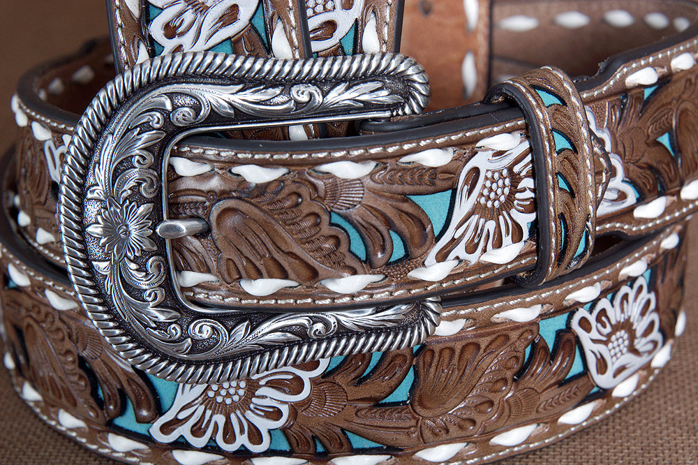 Nocona Leather Belt Western Overlay Flowers Painted Womens Brown