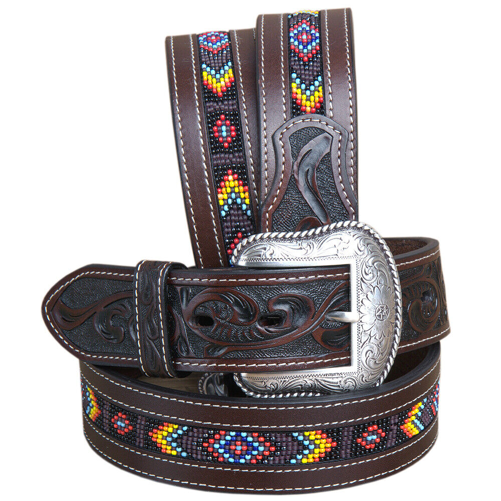 32 In Roper Mens Hand Tooled Leather Beaded Center Western Belt Brown