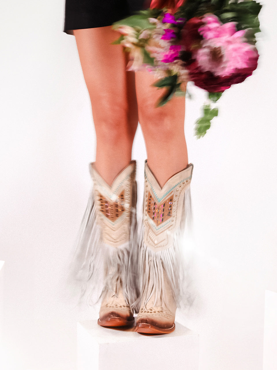 C4084 - WOMEN'S LUMINESCENT EMBROIDERY AND PINK STARS WITH LAMB FRINGE WHITE SNIP TOE COWBOY BOOT