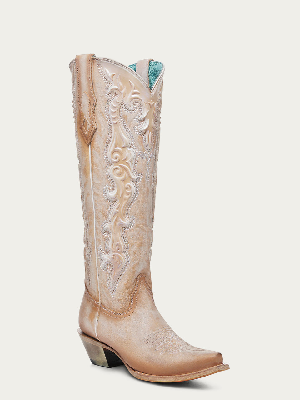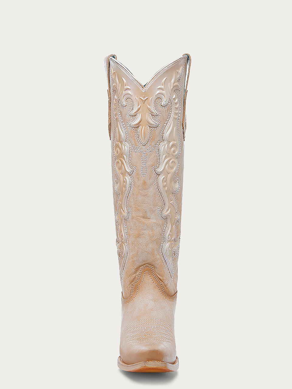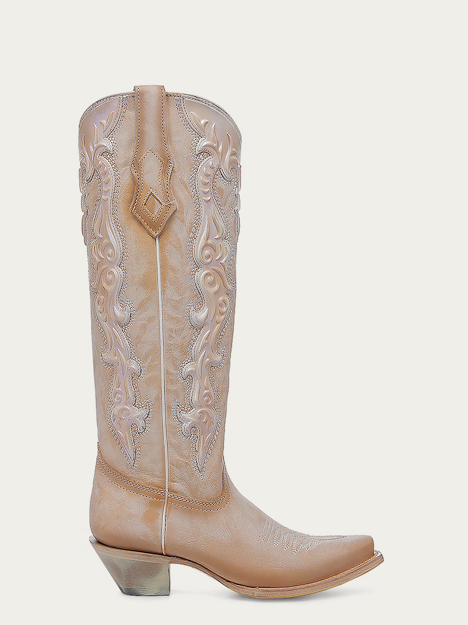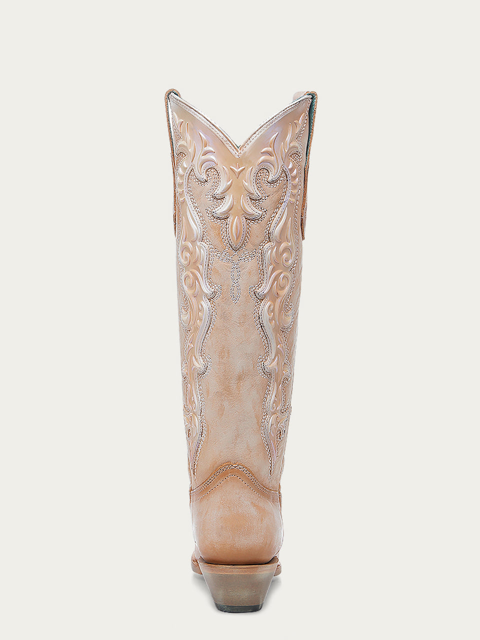 A4739 - WOMEN'S RUBBER APPLICATION IRIDESCENT PEARL EMBROIDERY SAND TALL TOP SNIP TOE COWBOY BOOT