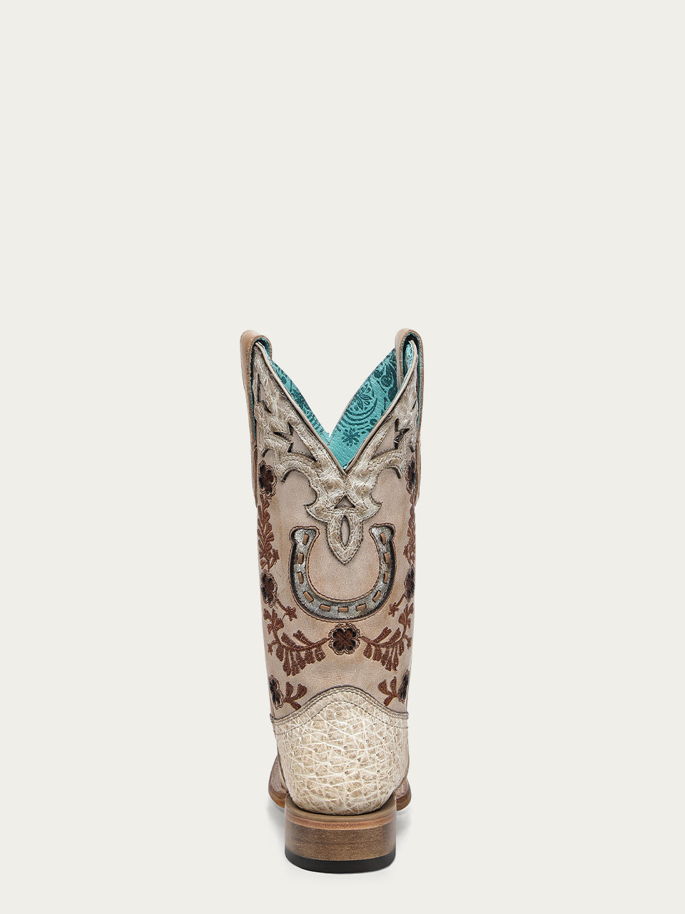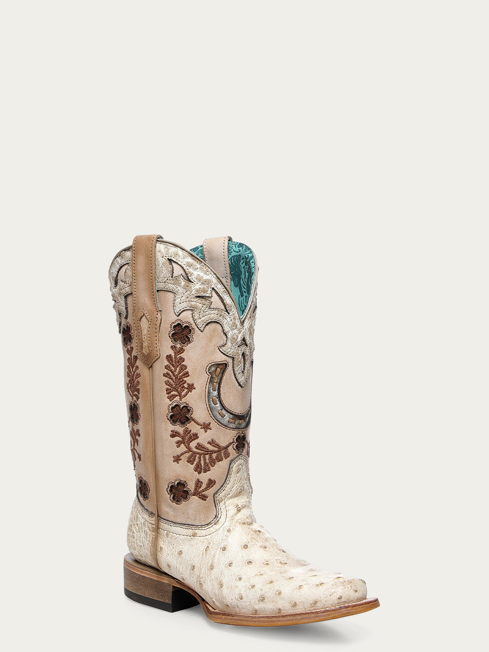 A4850 - WOMEN'S FLORAL AND HORSE-SHOE EMBROIDERY, WOVEN AND OVERLAY COWHIDE AND OSTRICH SQUARE TOE IVORY COWBOY BOOT