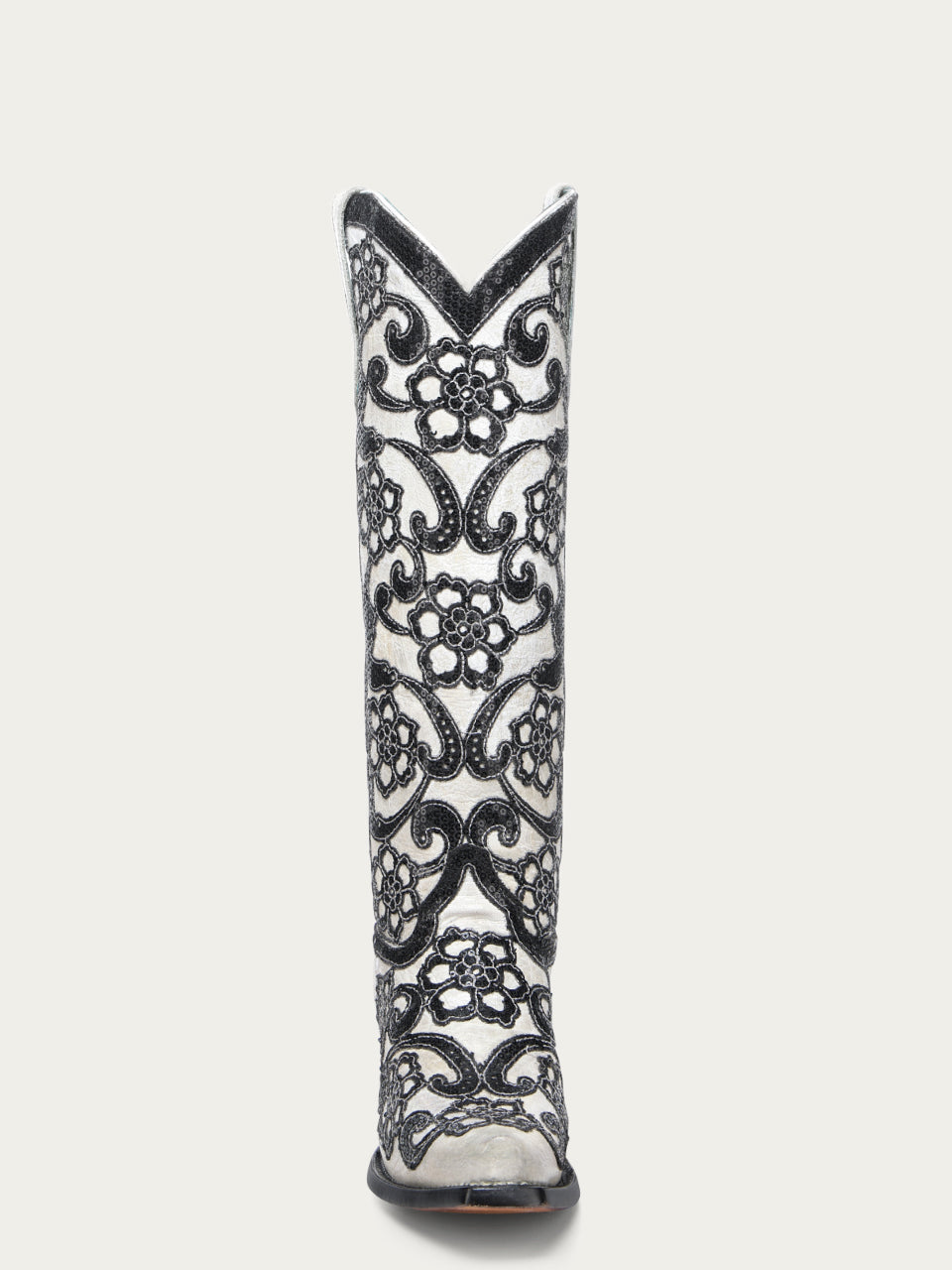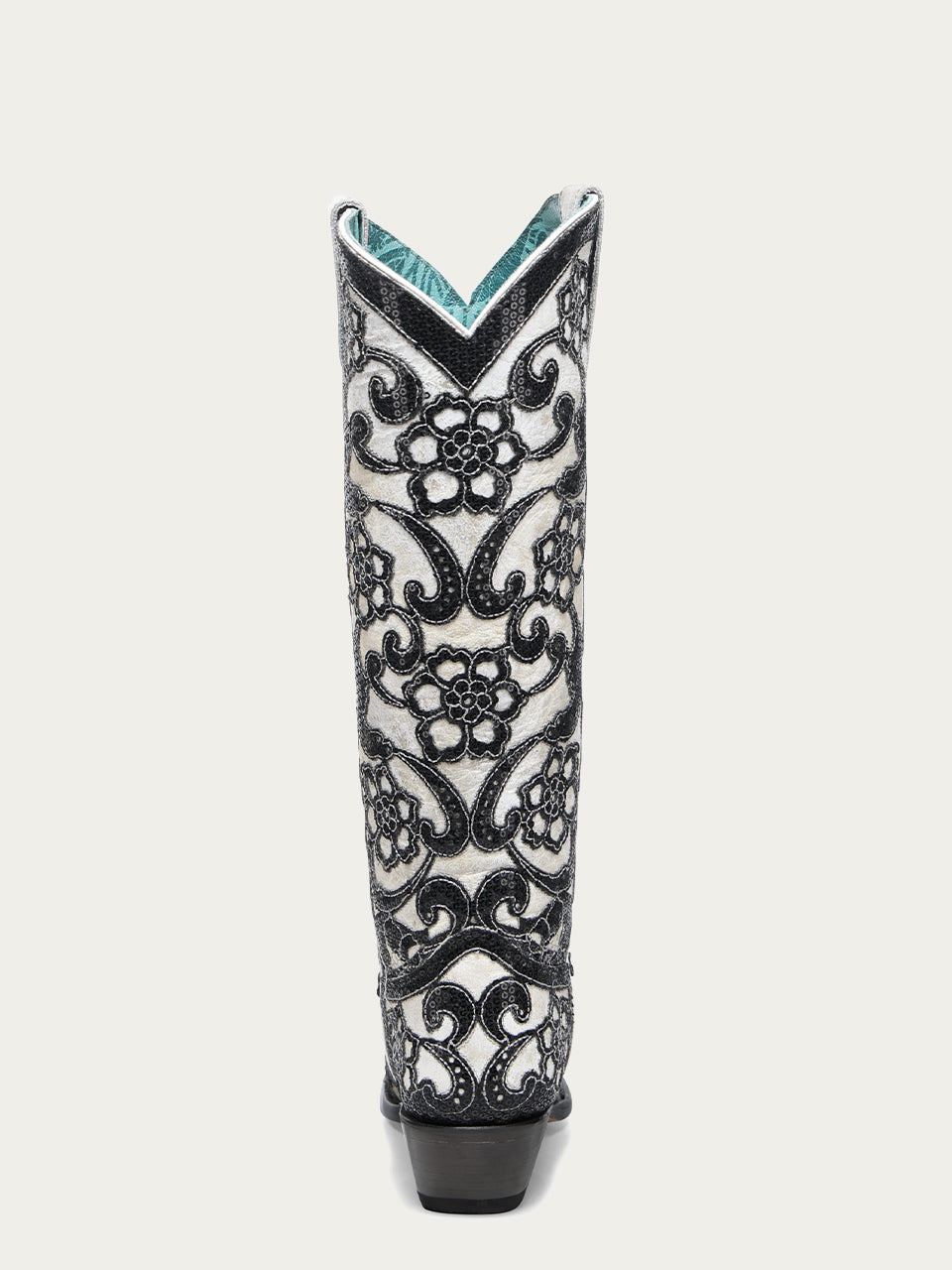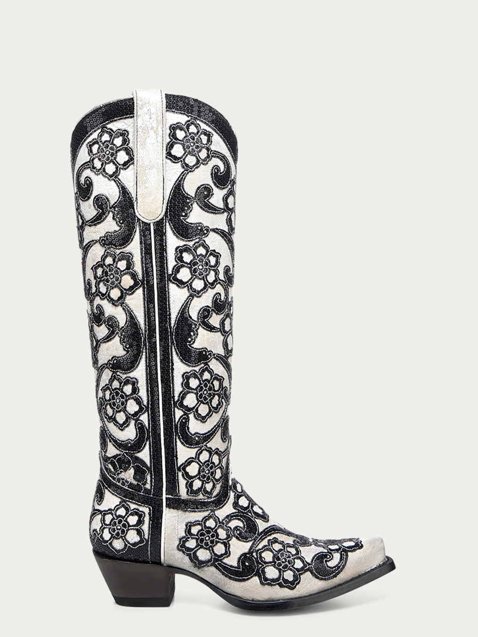 A4866 - WOMEN'S BLACK FLORAL OVERLAY EMBROIDERY AND SEQUINS SNIP TOE TALL TOP WHITE COWBOY BOOT