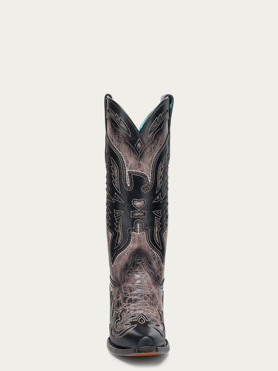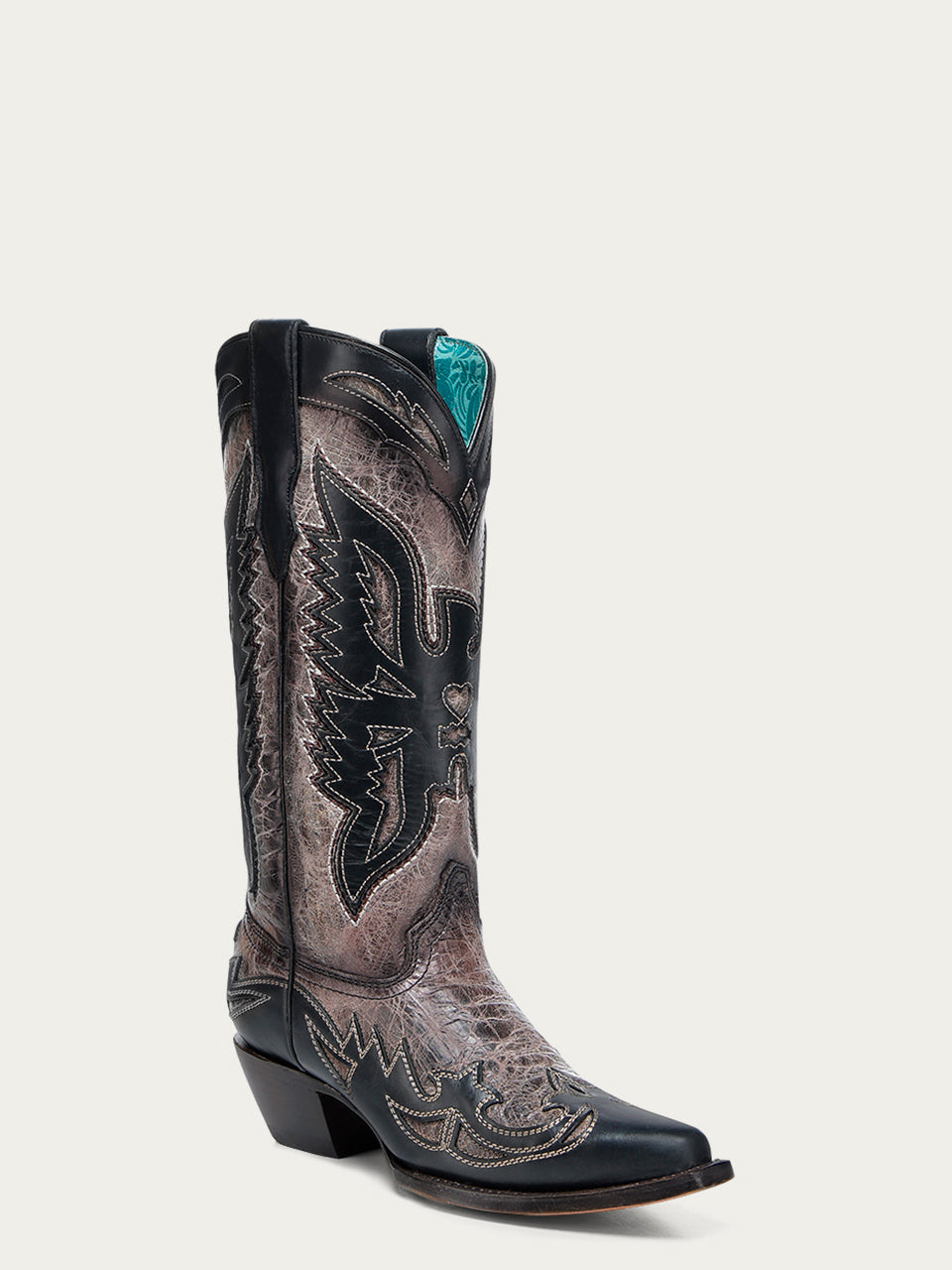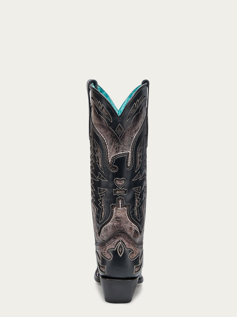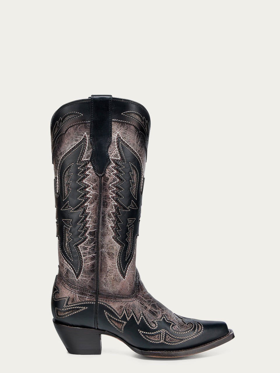 A4866 - WOMEN'S BLACK FLORAL OVERLAY EMBROIDERY AND SEQUINS SNIP TOE TALL TOP WHITE COWBOY BOOT