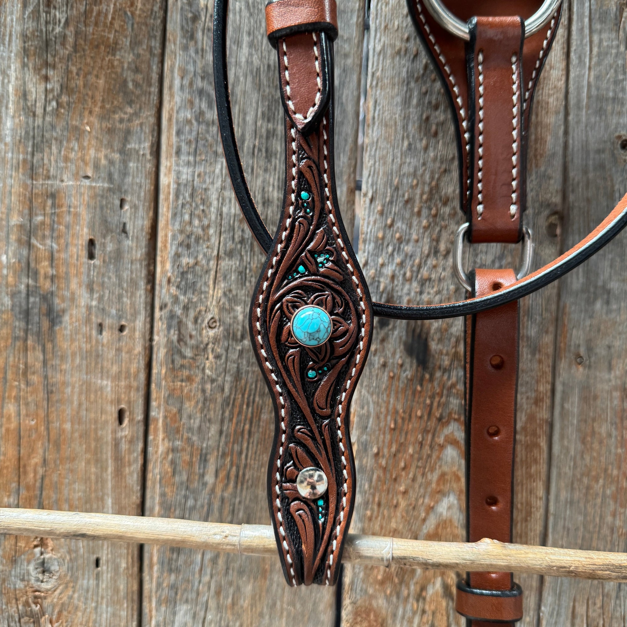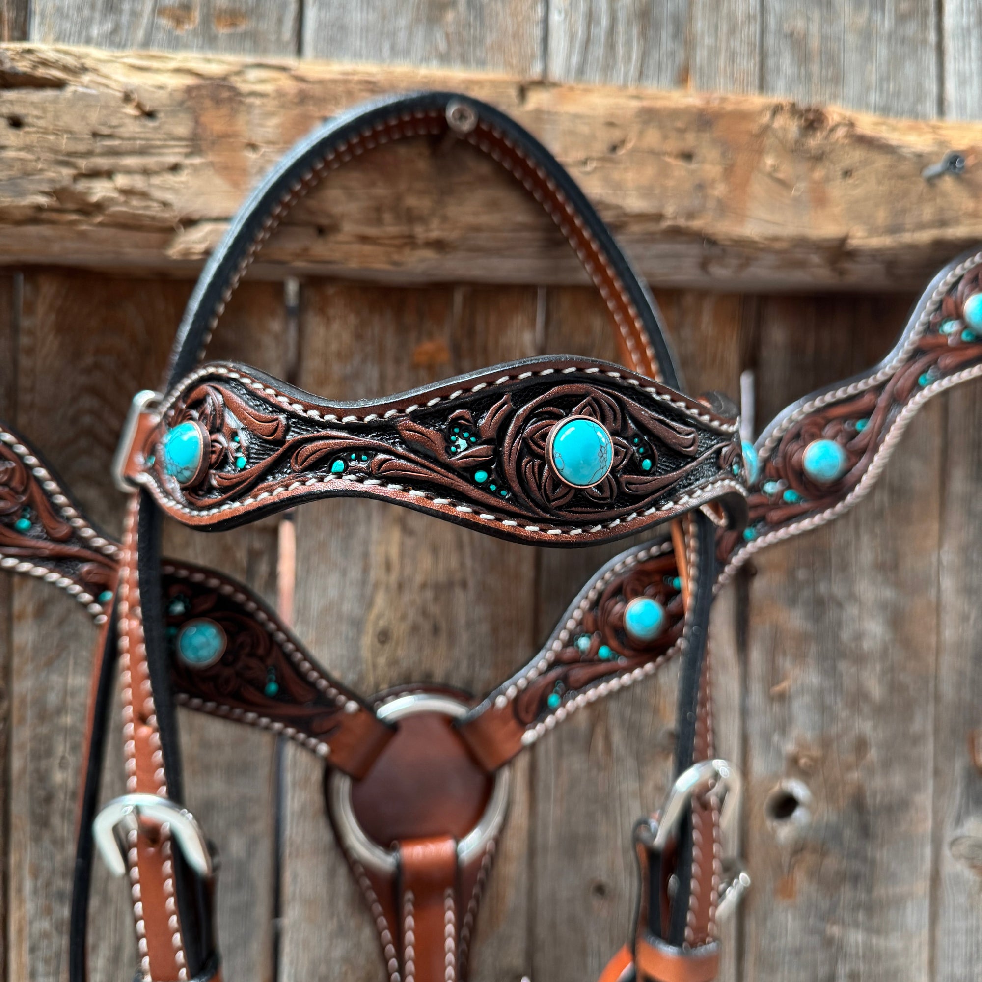 Dark Oil Floral Topaz and Turquoise One Ear/ Breastcollar Tack Set #OEBC562