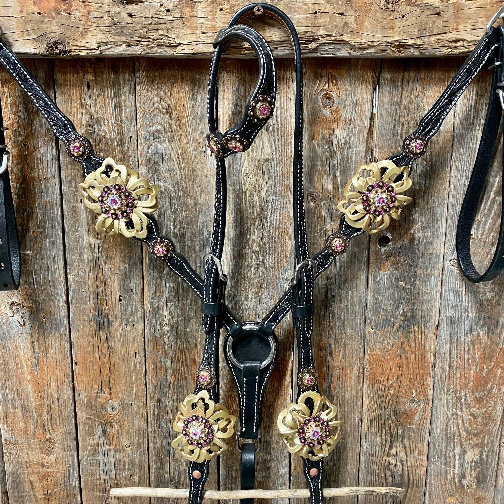 Black Floral Pink and Gold One Ear & Breastcollar Tack Set #OEBC408