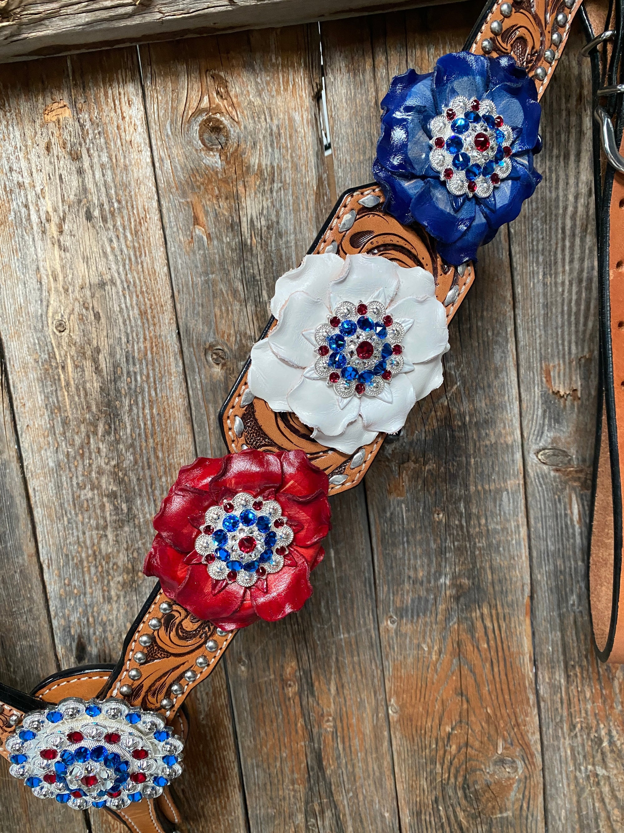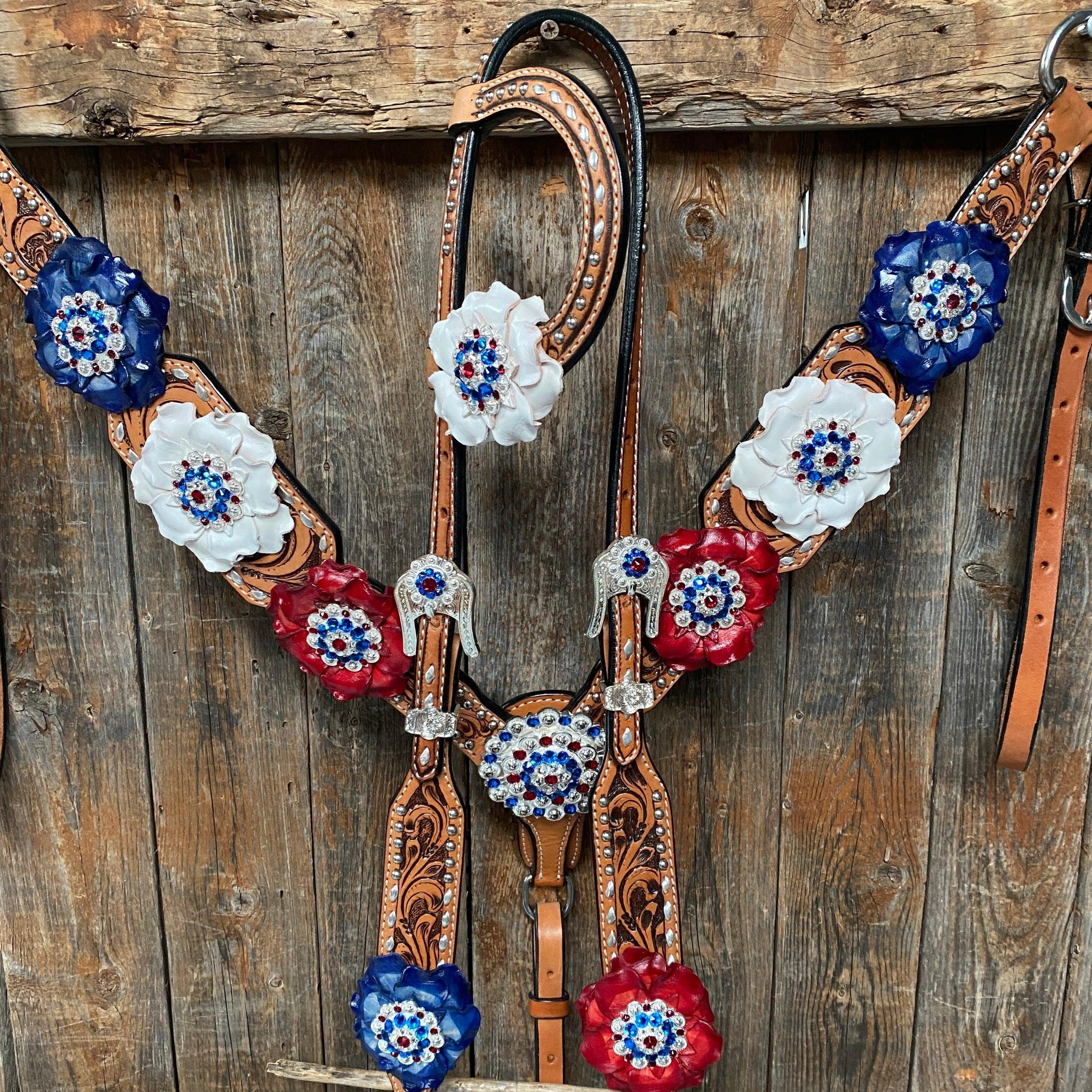 Light Oil Whipstitch Red and Turquoise One Ear/ Breastcollar Tack Set #OEBC549