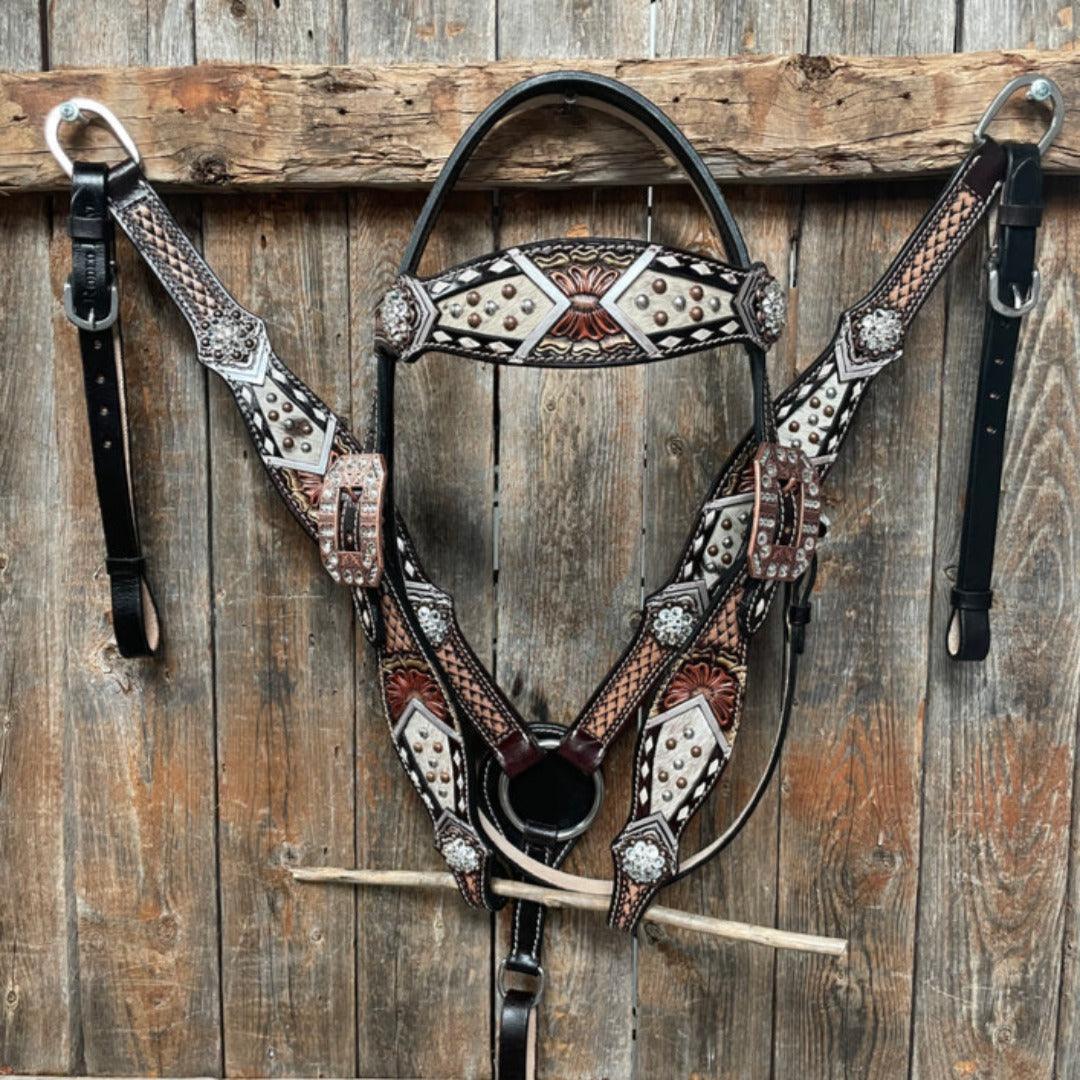 Silver Buckstitch Flower Browband Headstall & Breastcollar Set #BBBC405