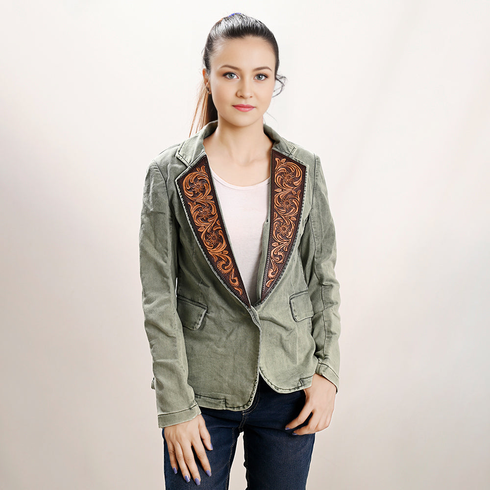 ADBZ023 Genuine leather Hand tooled hand carved Women 100% cotton Denim Blazer dress jacket ladies Girl
