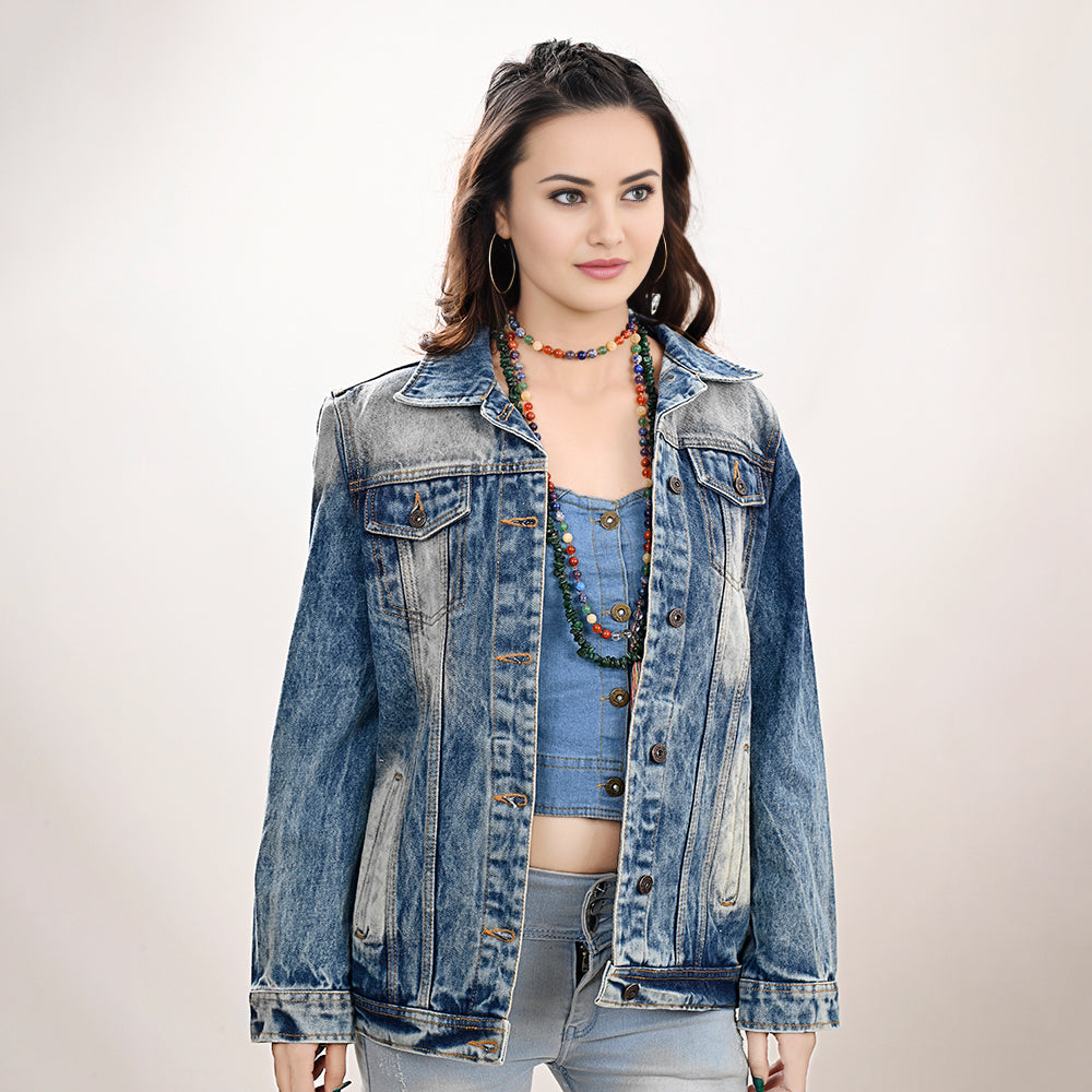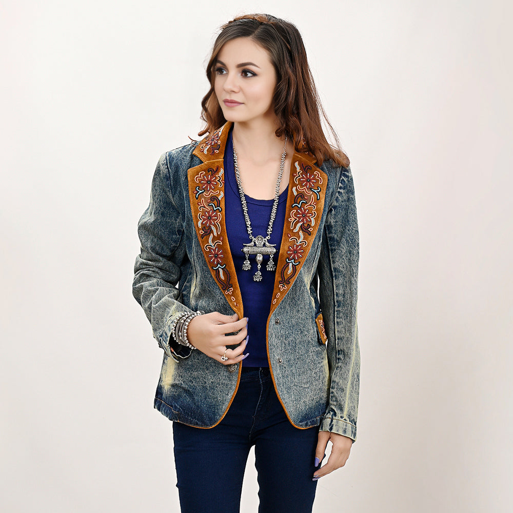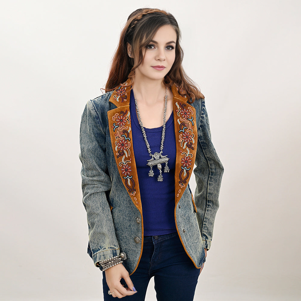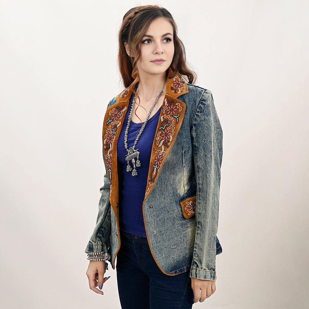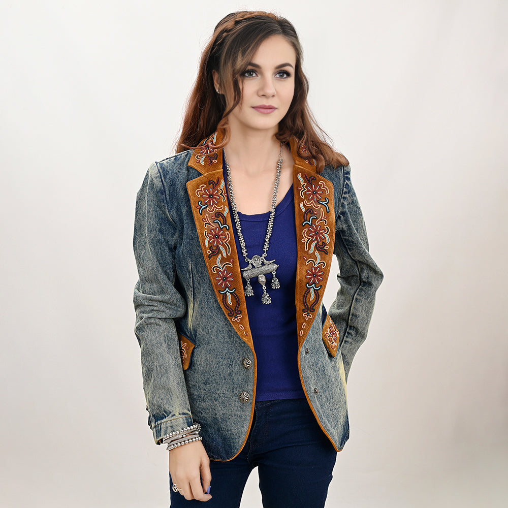 ADBZ029 Genuine leather Hand tooled hand carved Women 100% cotton Denim Blazer dress jacket ladies Girl