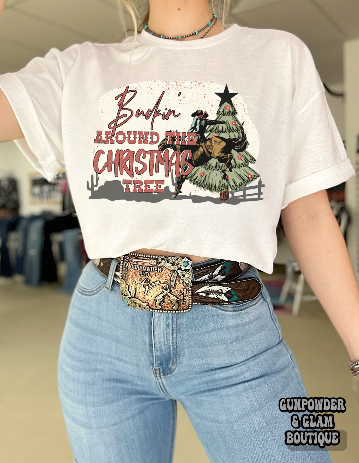Buckin’ Around The Christmas Tree Tee or Crewneck