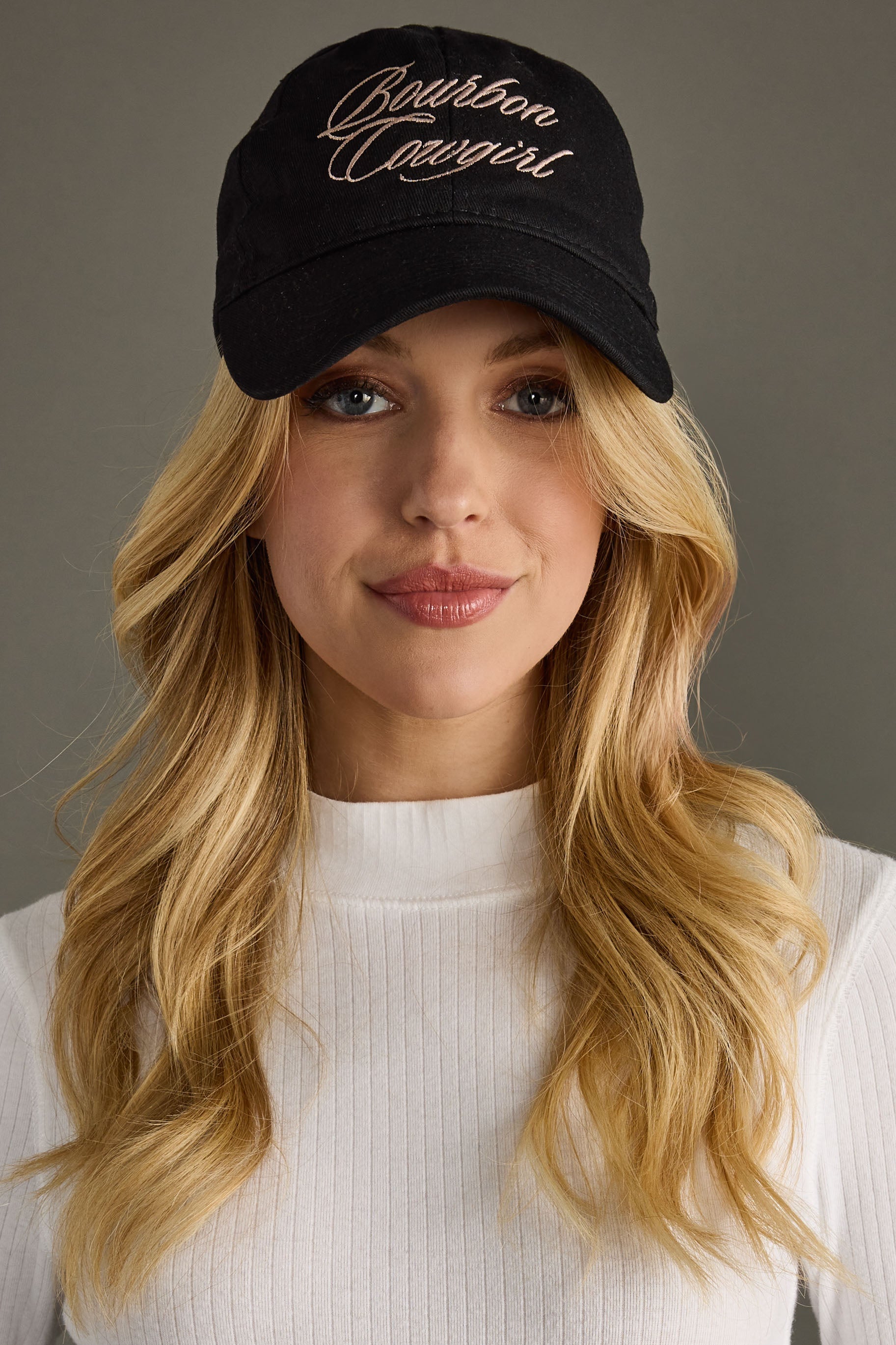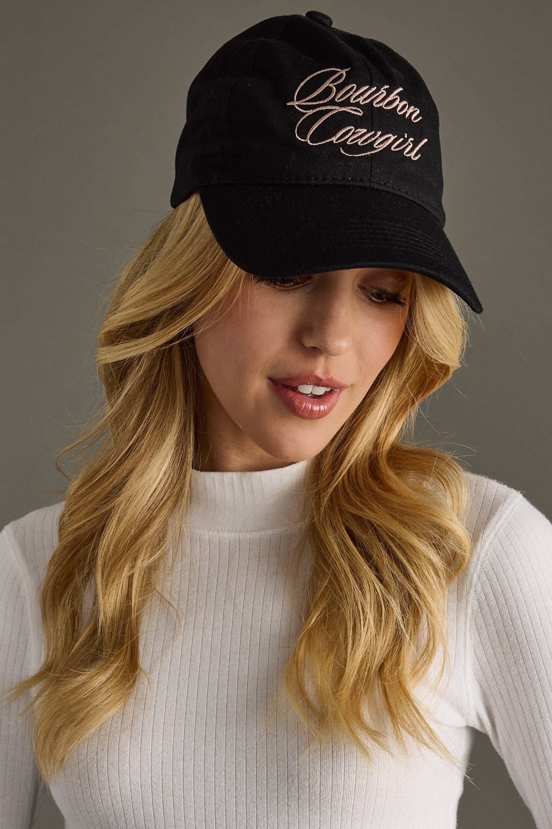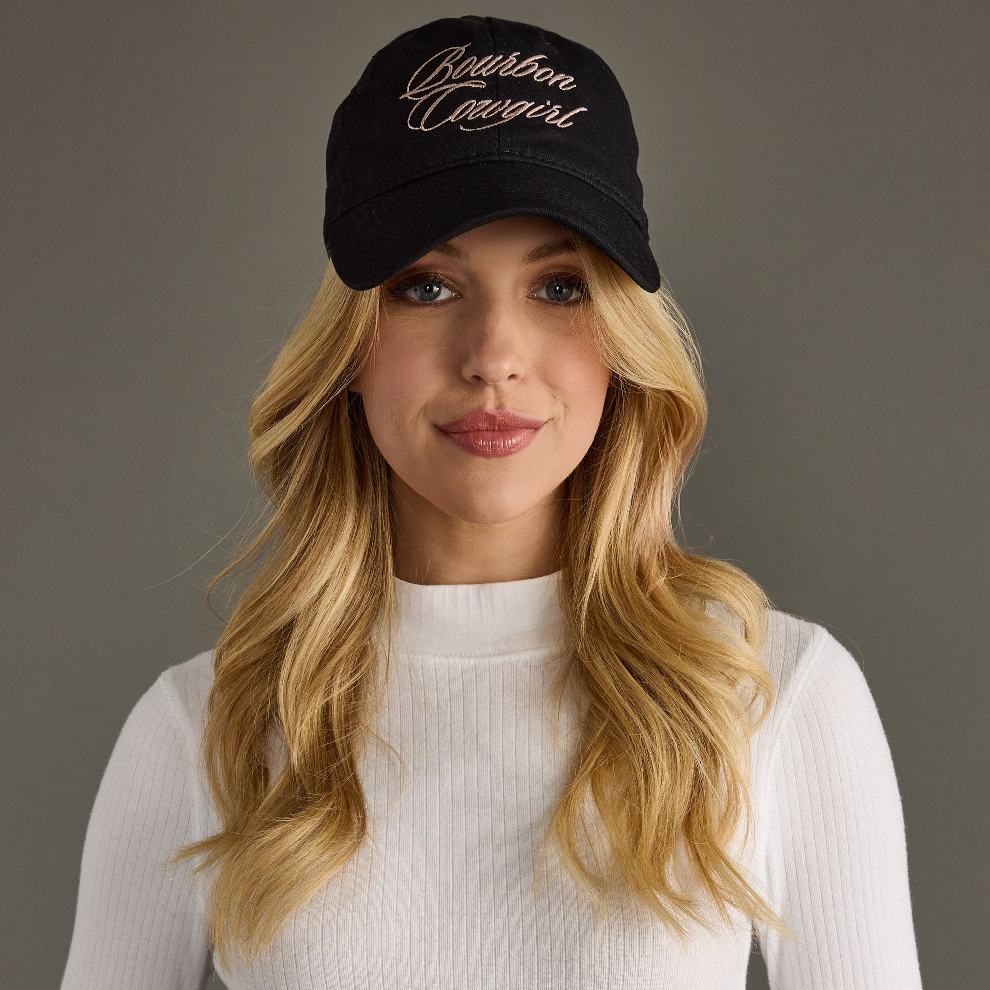 Bourbon Cowgirl Script Embroidered Baseball Hat - Black