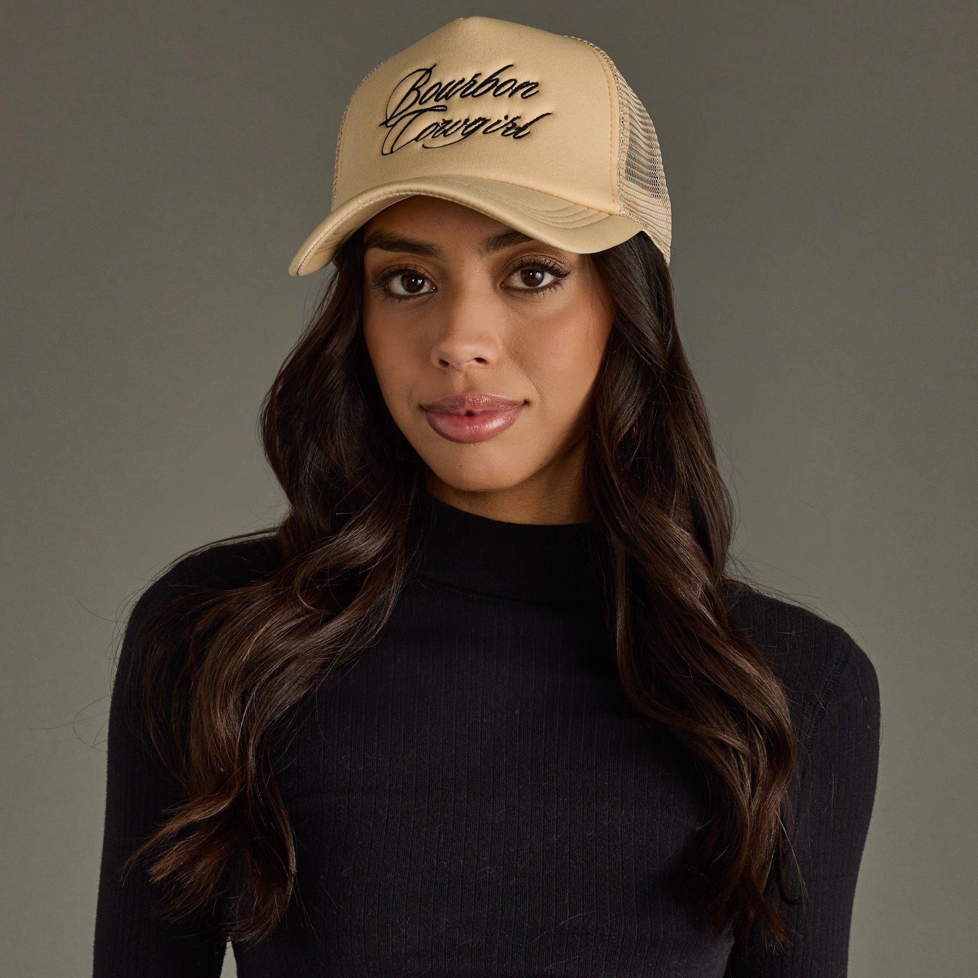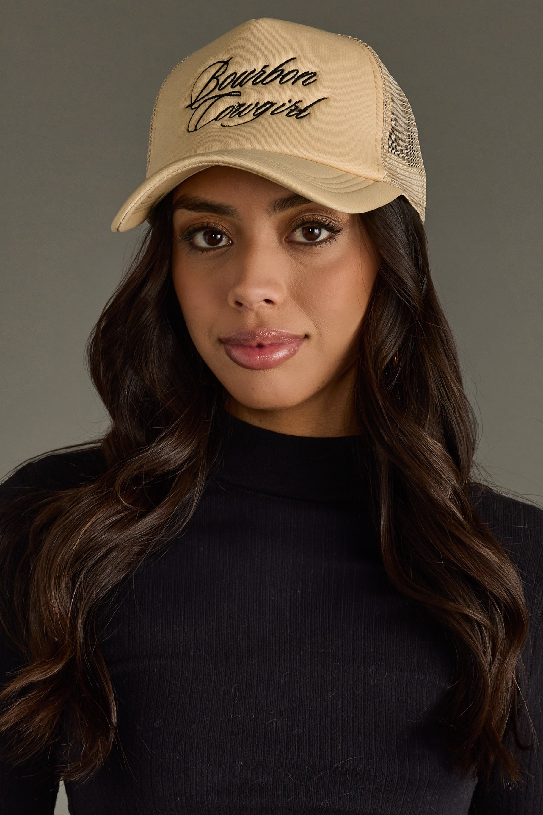 Bourbon Cowgirl Embroidered Foam Trucker Hat - Tan