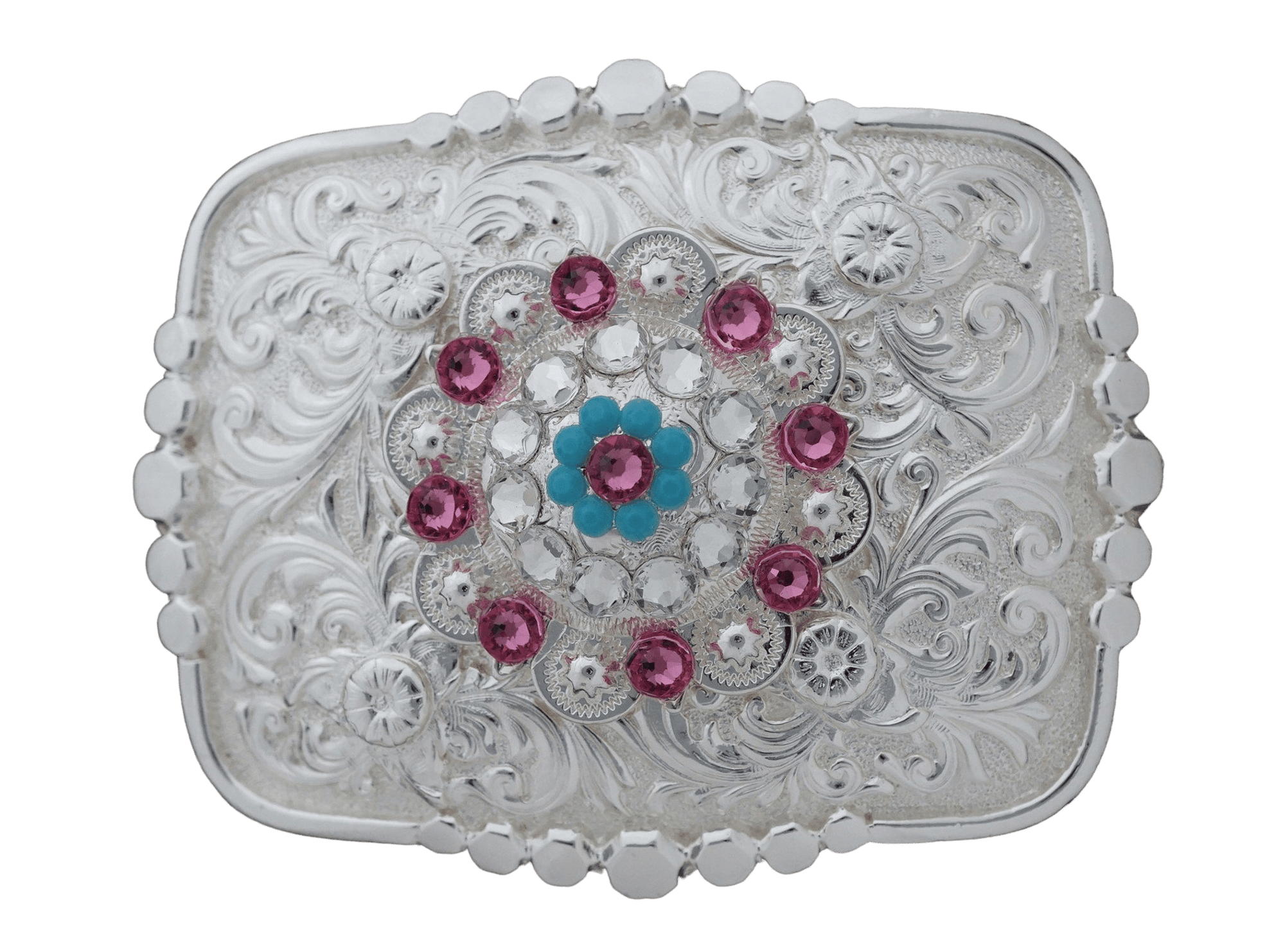 Bright Silver Belt Buckle With Pink, Turquoise & Clear Concho