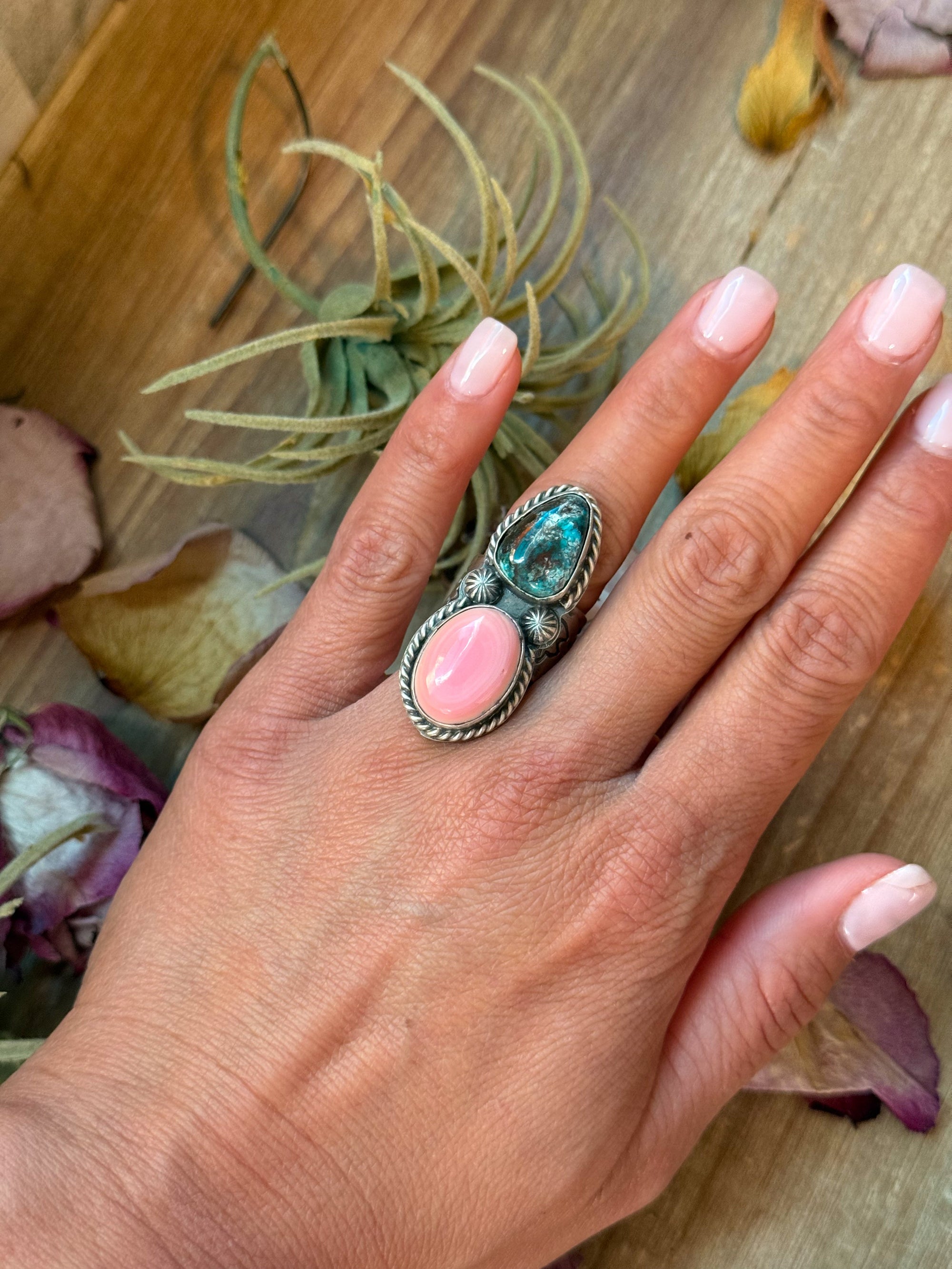 Kingman Turquoise & Pink Conch Sterling Silver Ring – Size 7.5