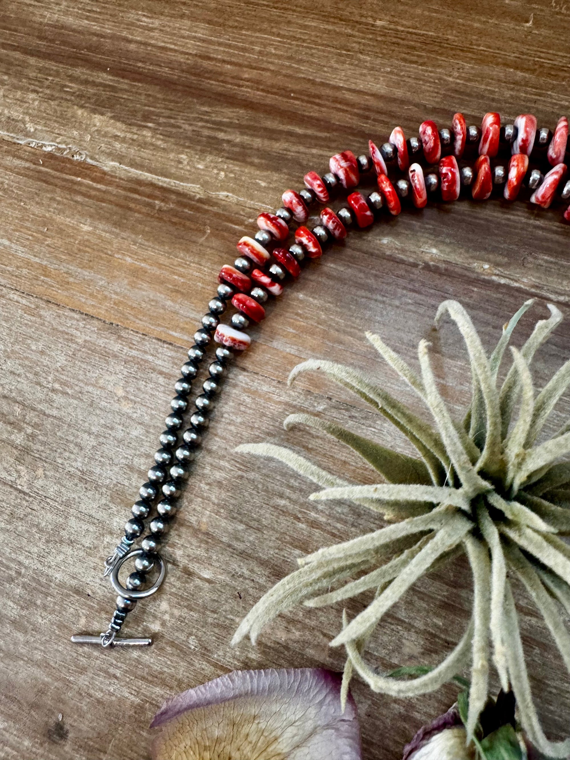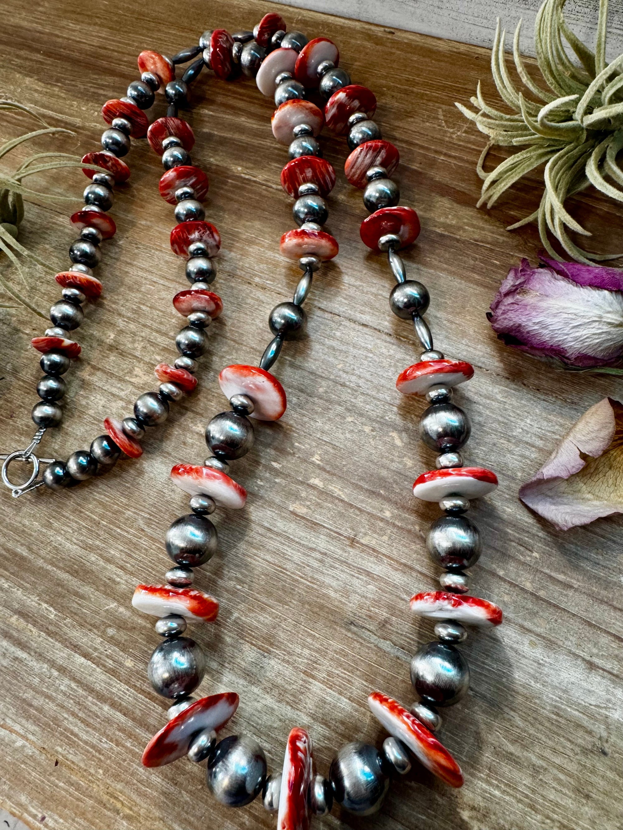 NFR Collection Necklace – Sterling Silver Torpedo Pearls with Red Spiny Oyster – Handmade by The Bijoux FAB – 39"